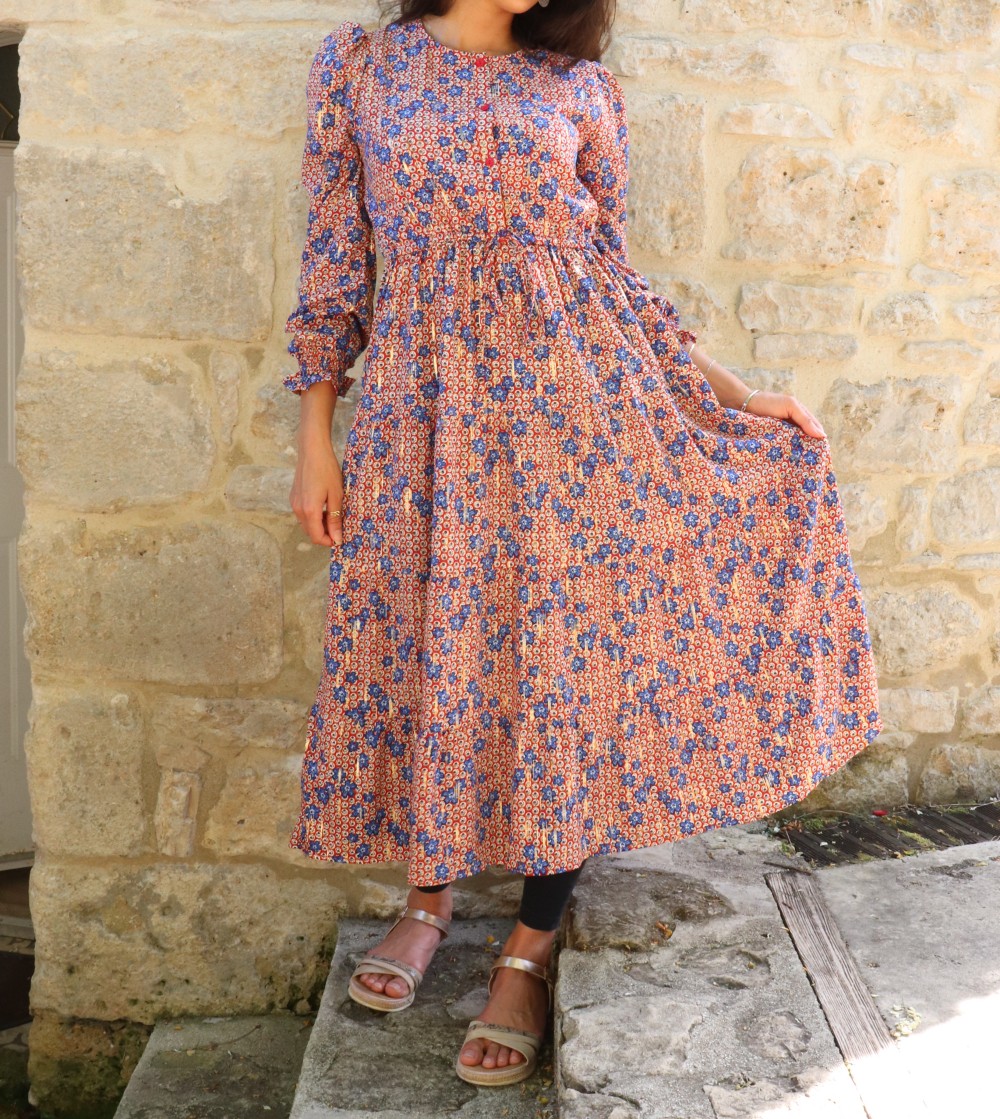 Robe d'ete a volants motifs fleuris et dores pour femme - Couleur rouille et bleu