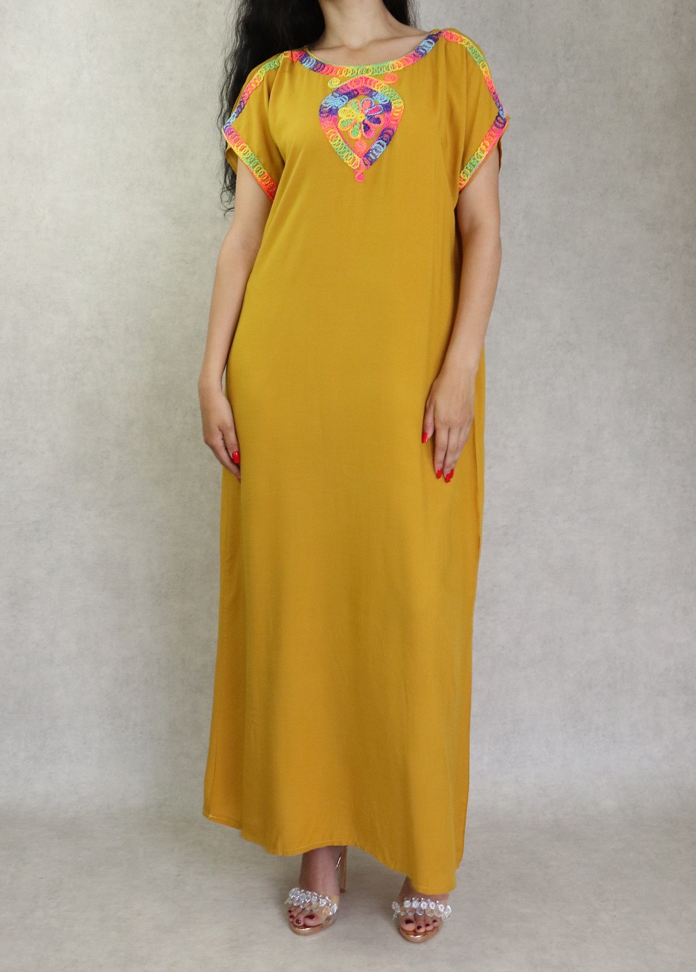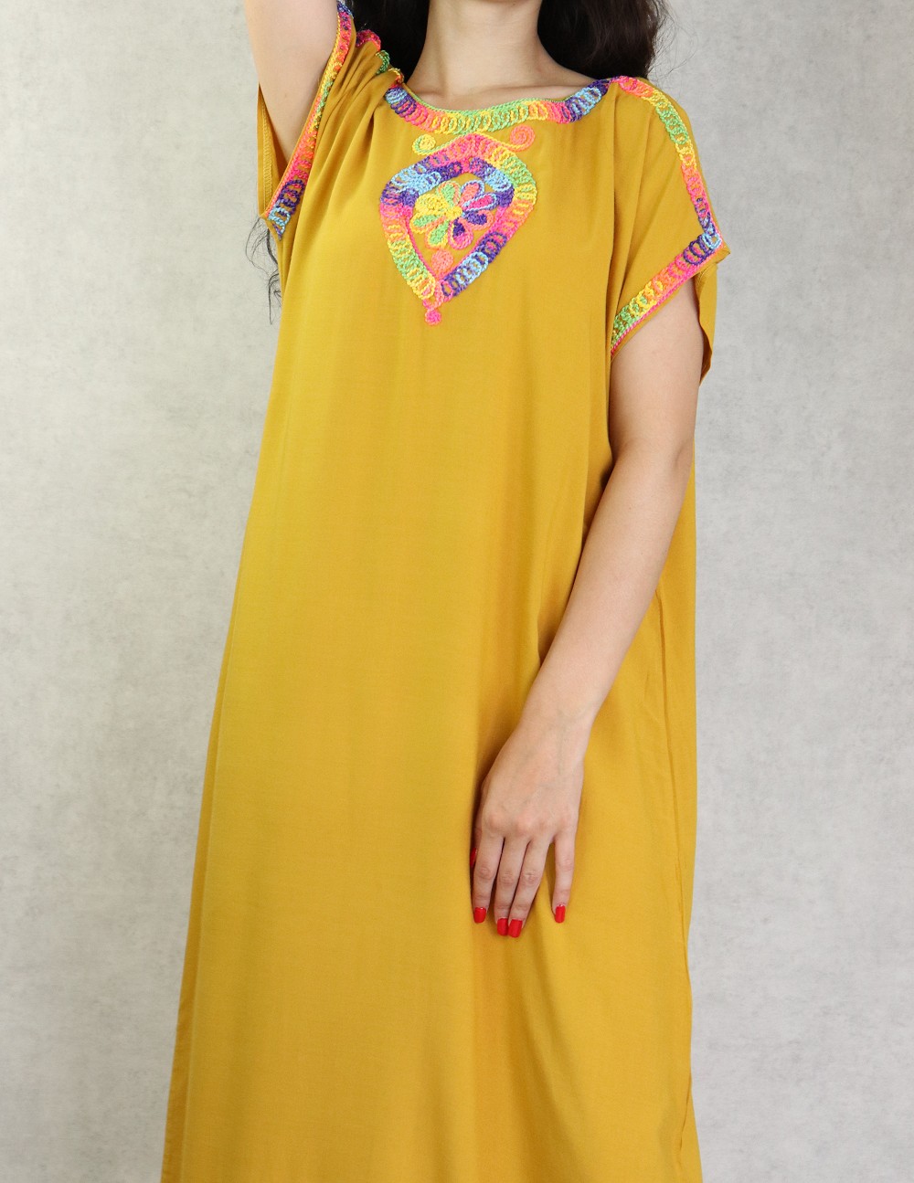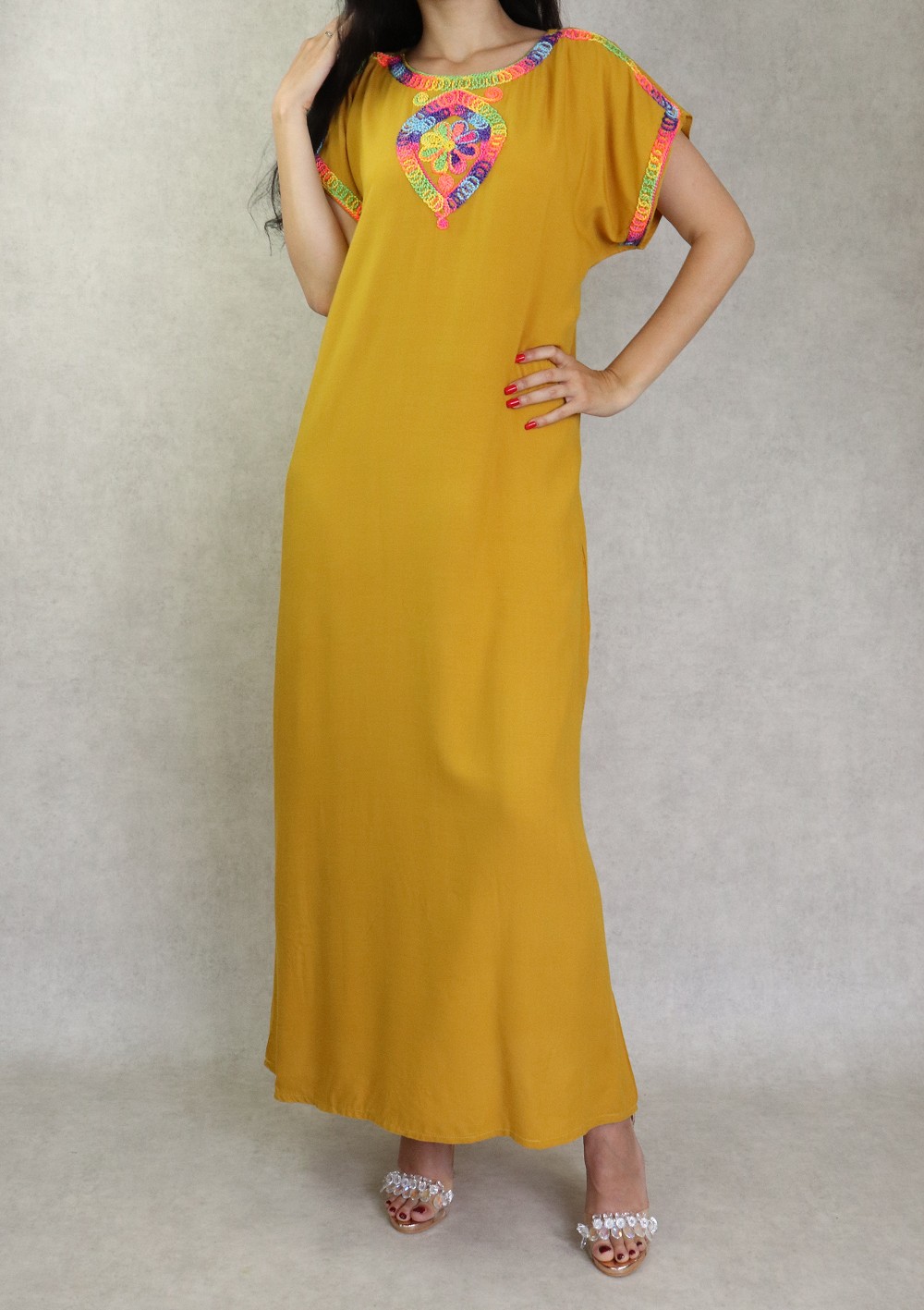 Robe Orientale élégante manches courtes tissu doux avec broderies pour femme - Couleur jaune moutarde - REF. 38828 (24.90 €)