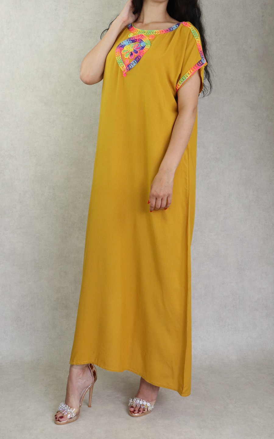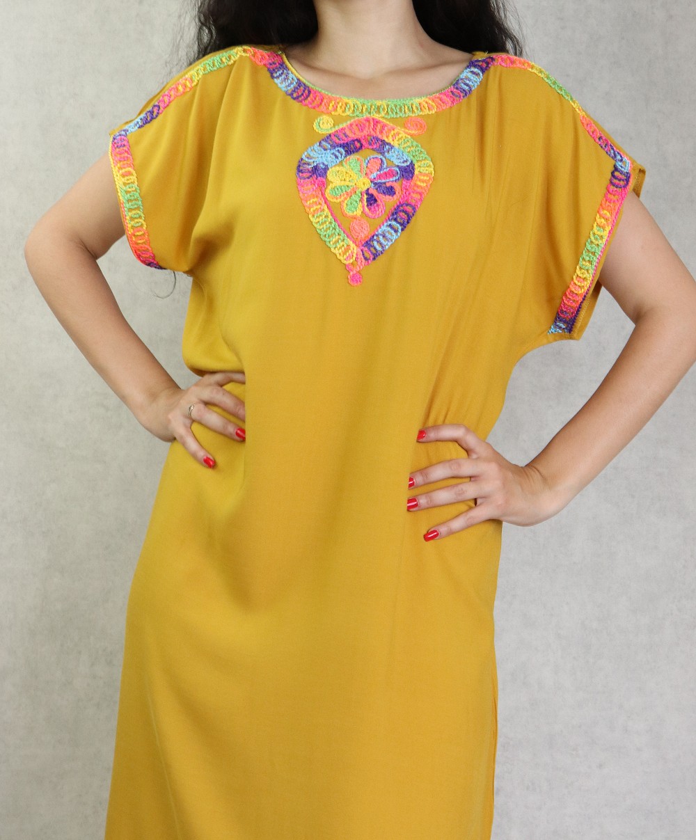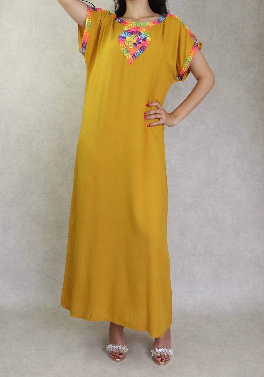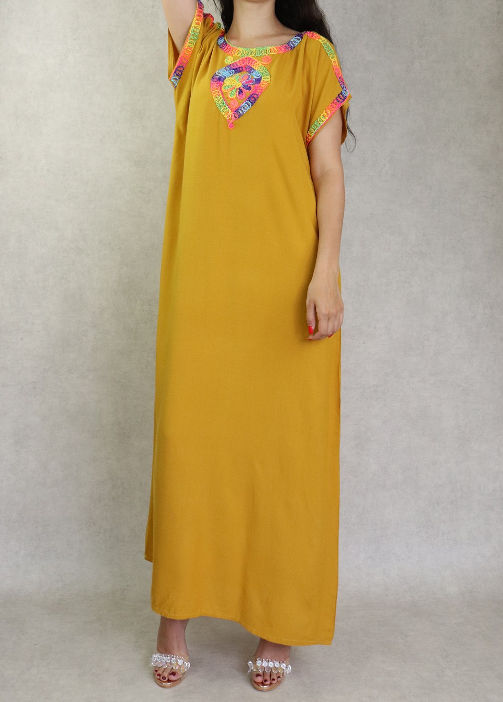 Robe Orientale élégante manches courtes tissu doux avec broderies pour femme - Couleur jaune moutarde - REF. 38828 (24.90 €)