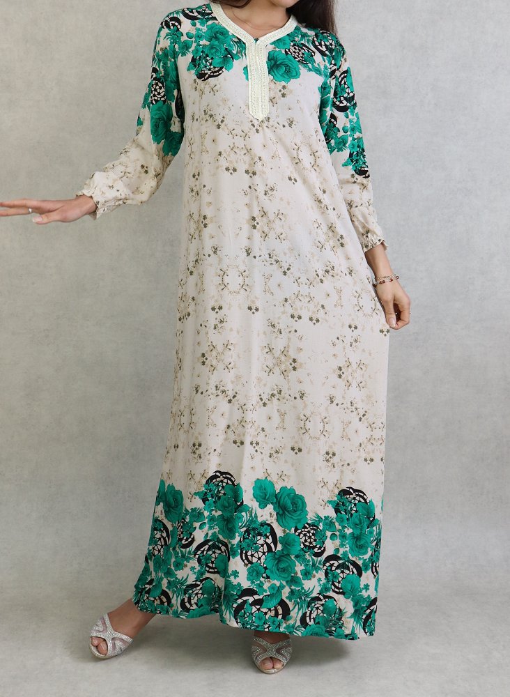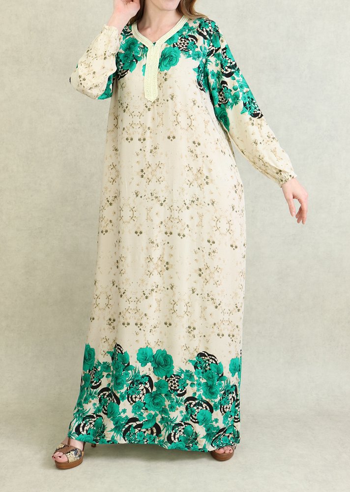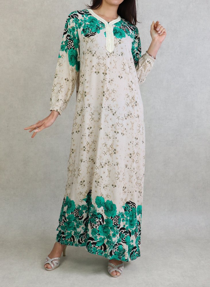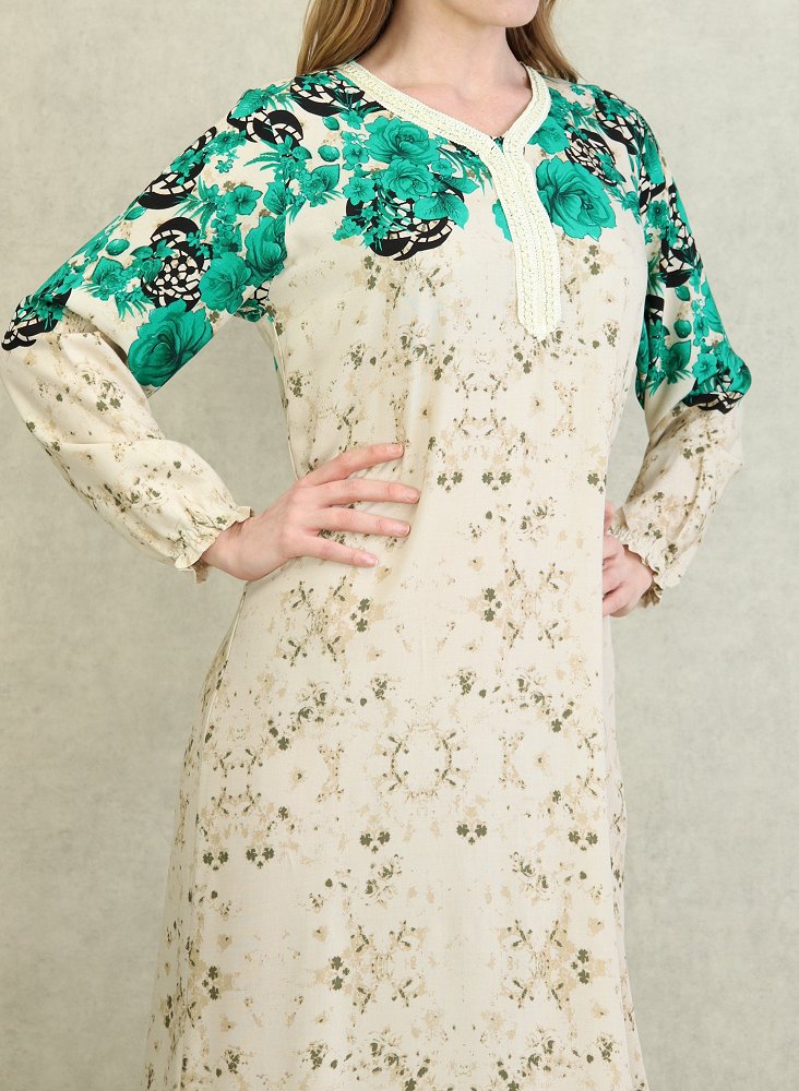 Robe d’intérieur avec motifs à fleurs sur fond beige. Col V avec broderies sur l'avant, manches longues finition élastiques aux poignets.