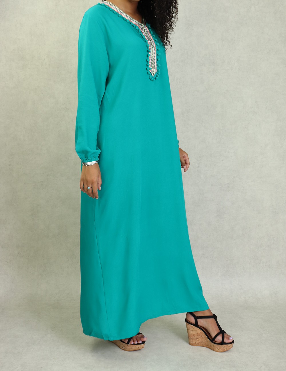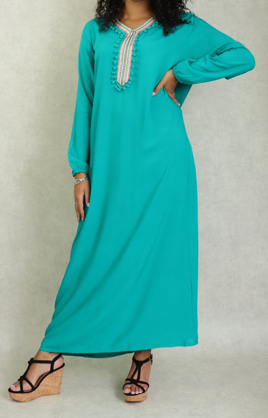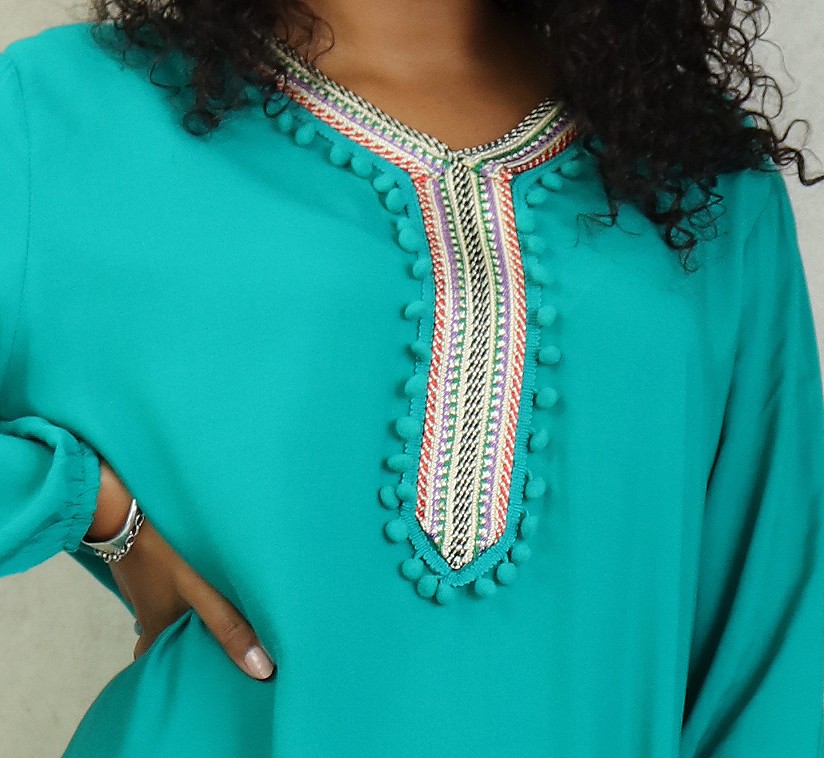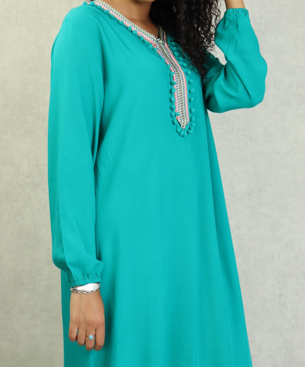 Robe d’été fluide et légère de couleur unie. Manches longues finition élastiques aux poignets. broderie multi couleur au niveau de col en V et le buste. Petits pompons sur le devant.