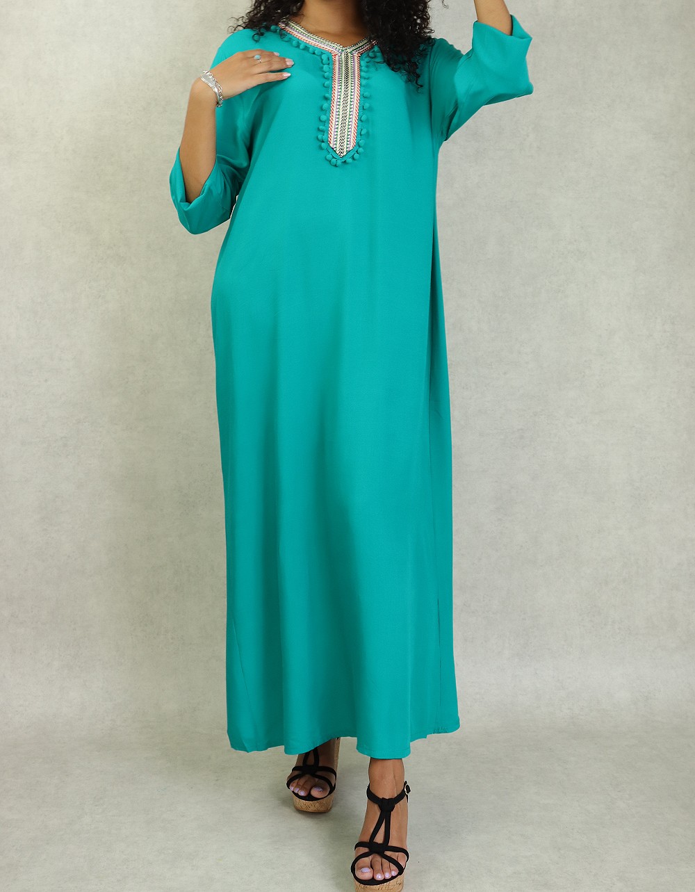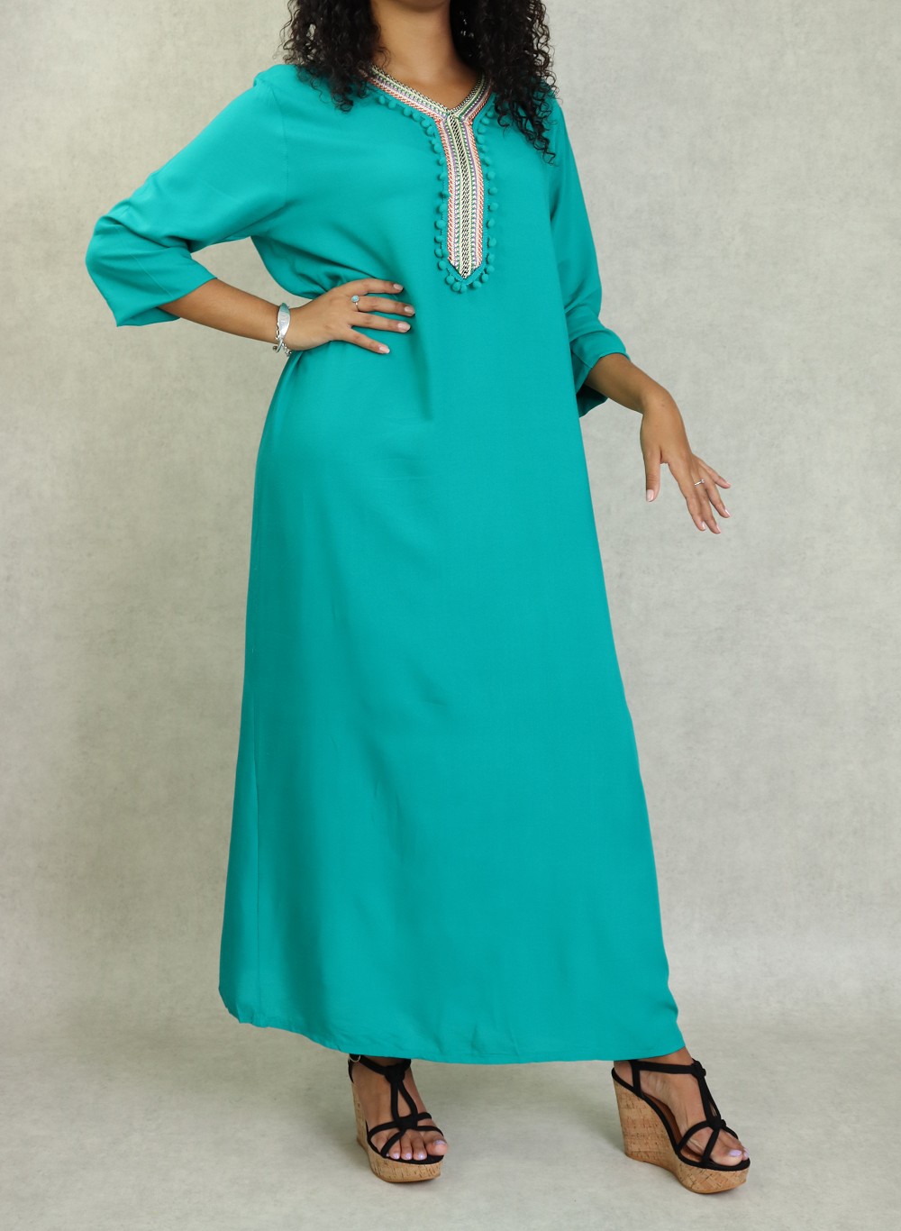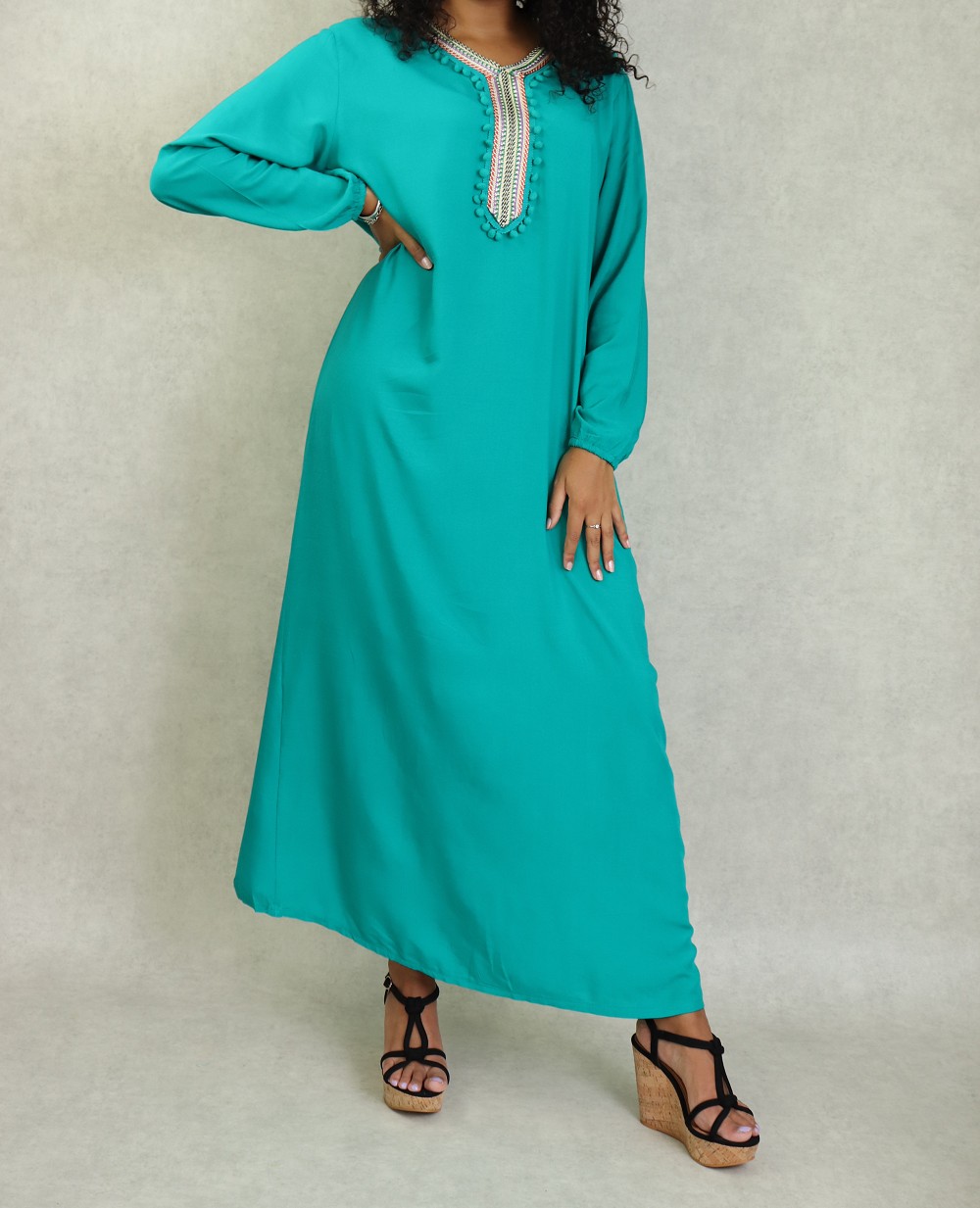 Robe d’été fluide et légère de couleur unie. Manches longues finition élastiques aux poignets. broderie multi couleur au niveau de col en V et le buste. Petits pompons sur le devant.