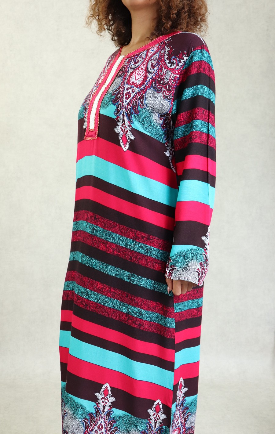 Robe pour femme musulmane - Ceinture et manche à rayure noir et blanc (Grande taille disponible) - Couleur prune - REF. 33256 (24.90 €)