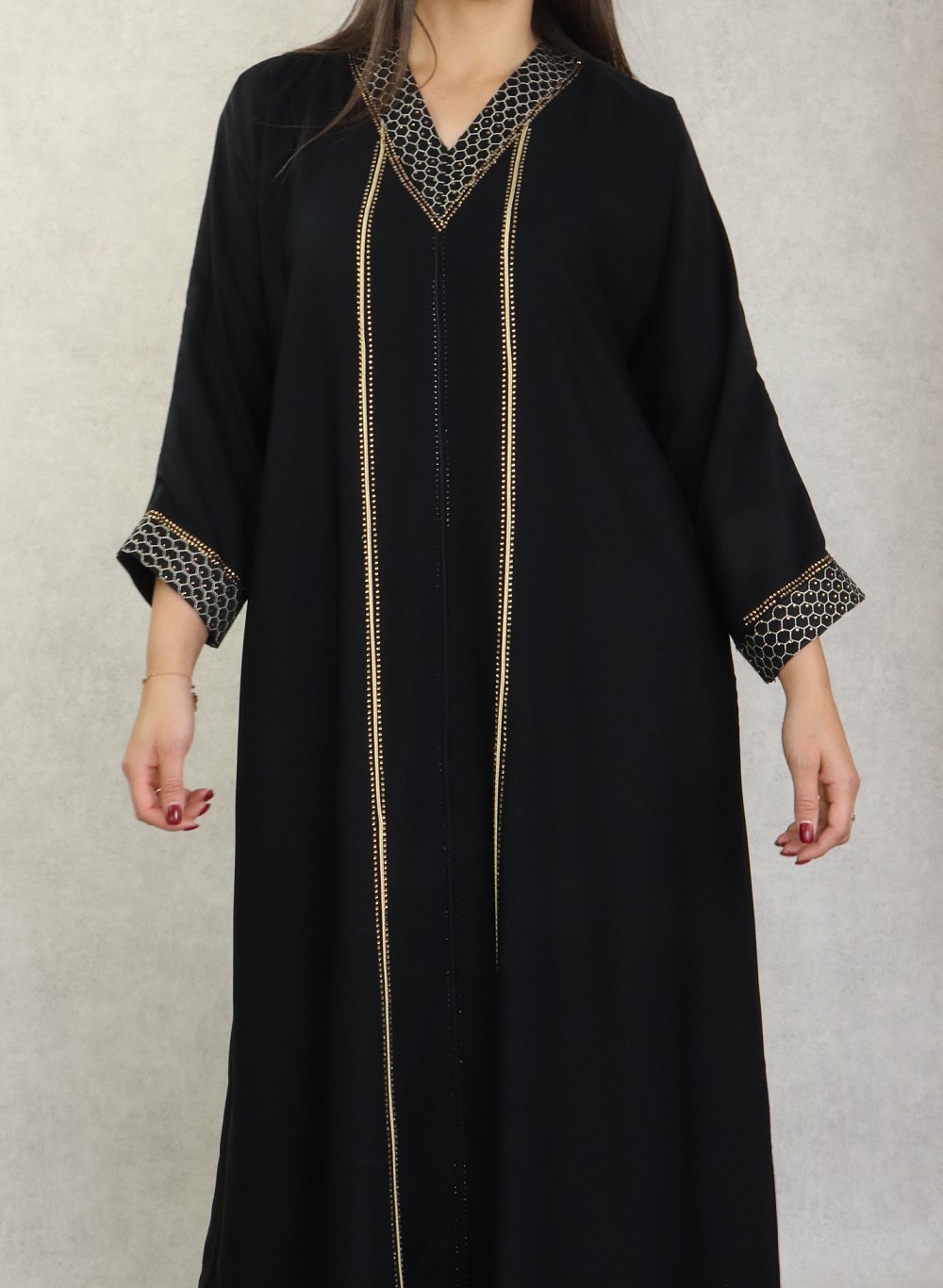 Robe Abaya Dubaï de qualité avec motifs strass dorés sur le devant et les manches - Couleur noir - REF. 38179 (39.90 €)