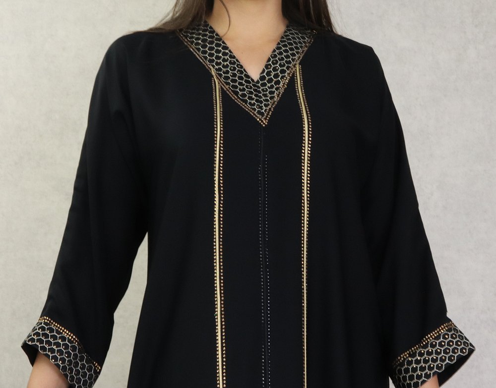 Robe Abaya Dubaï noire de qualité avec motifs strass dorés - REF. 38120 (45.00 €)