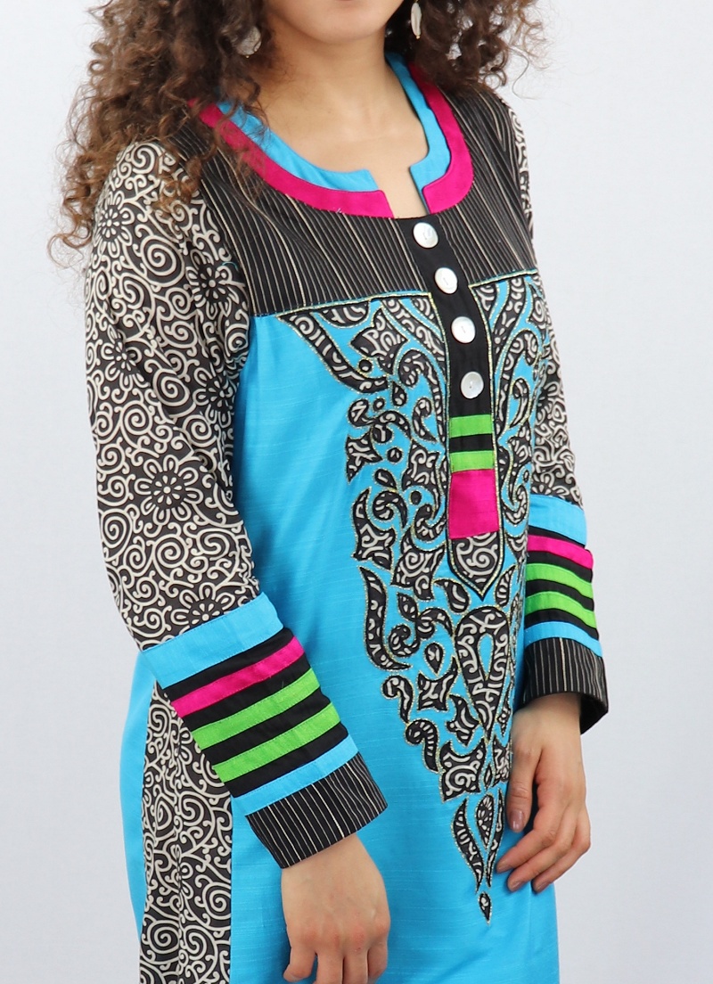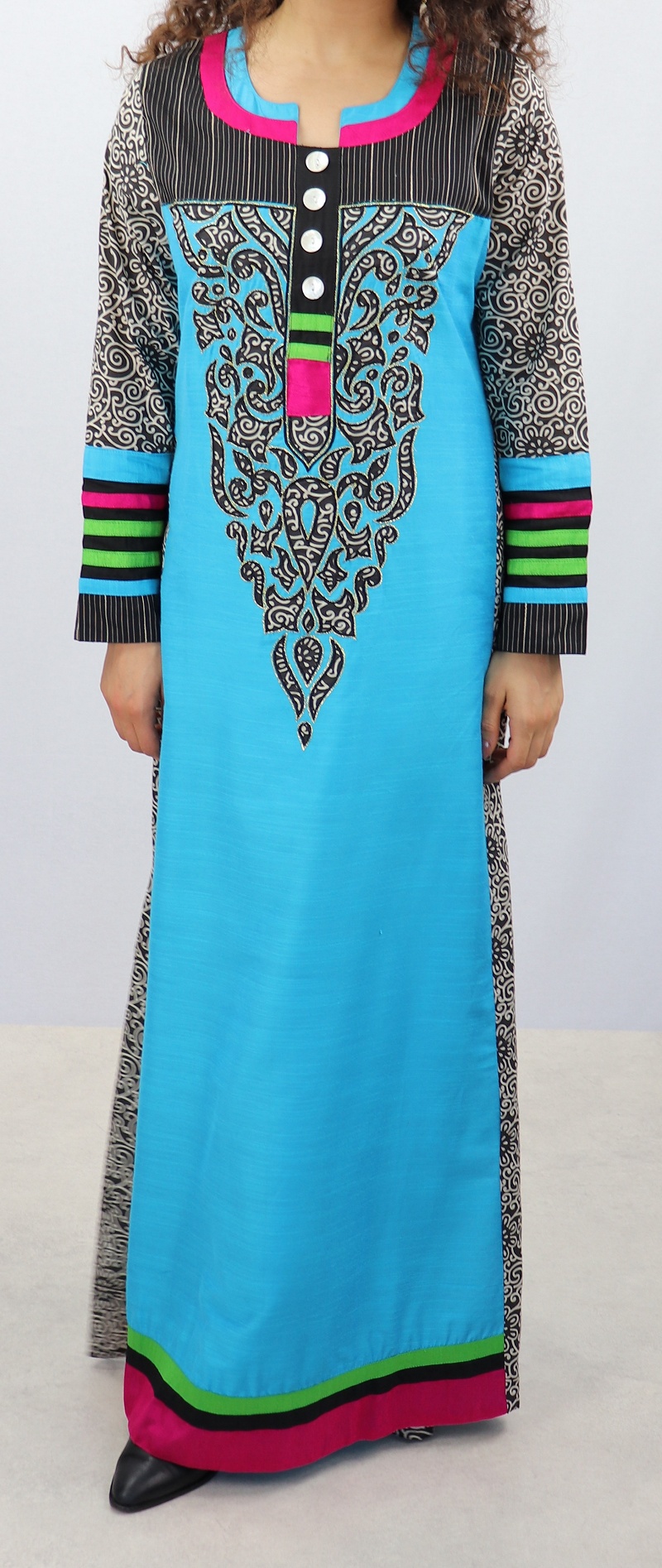 Vous allez aimer arborer cette robe de soirée lors d'un événement ou d'une sortie spéciale grâce à sa panoplie de couleurs allant du bleu ciel au rose bonbon et grâce à sa finition en noir et blanc qu'on retrouve notamment au niveau des manches. Les bandes vertes finissent de colorer cette belle pièce. Notez la coupe droite mais ample qui vous permet de l'enfiler avec facilité et de vous sentir décontractée quand vous la portez.