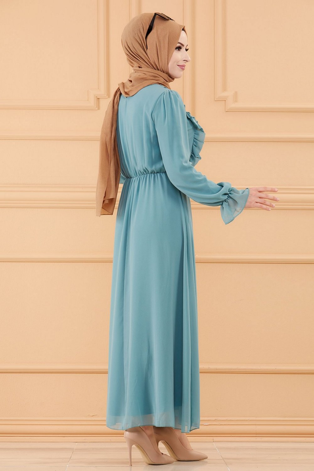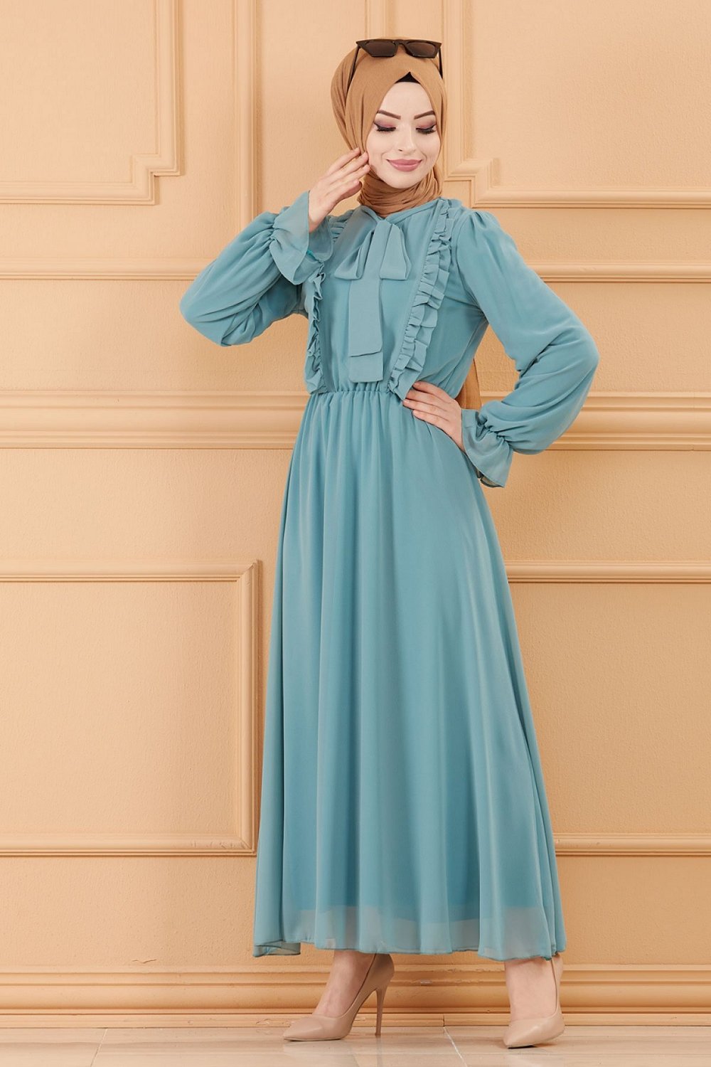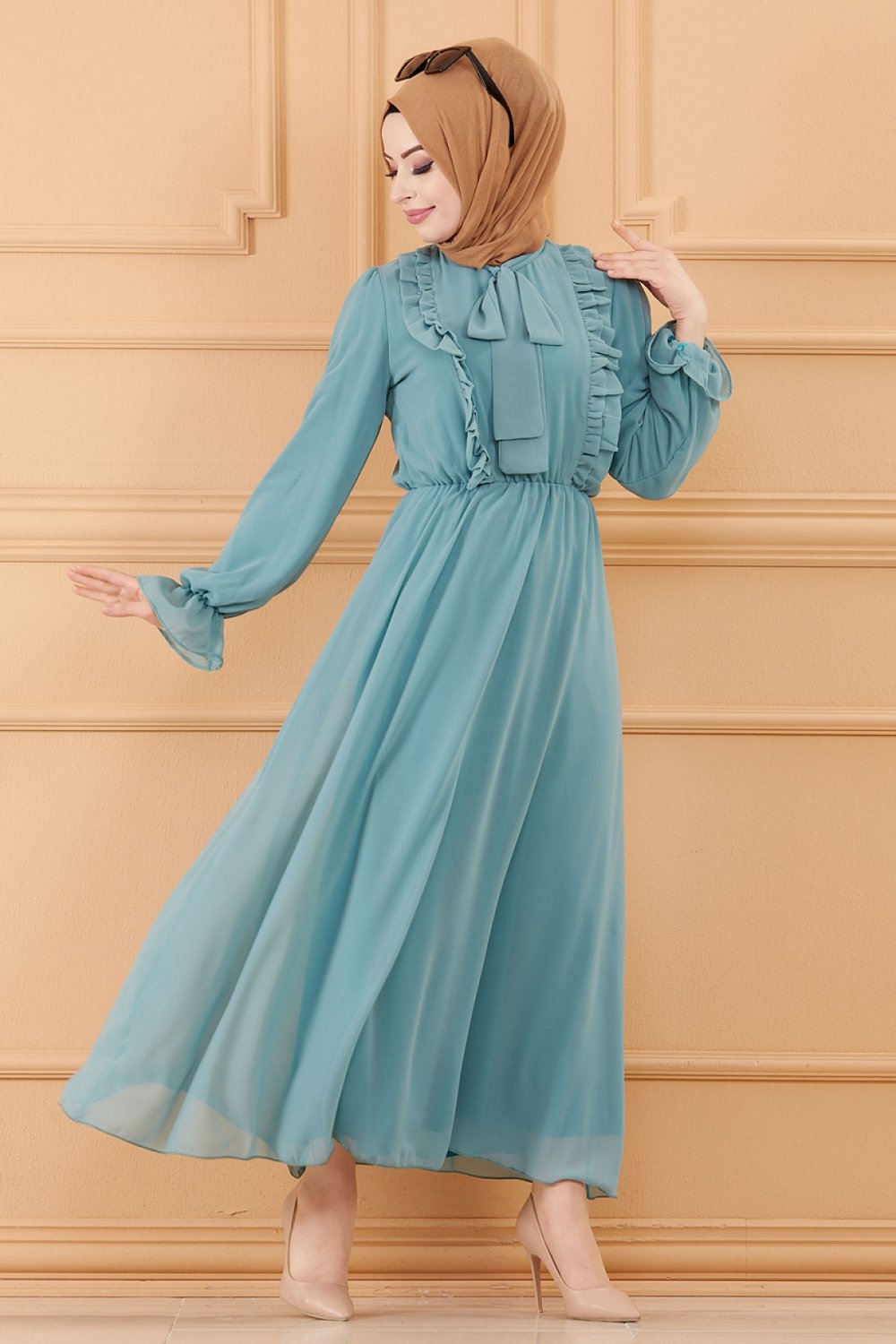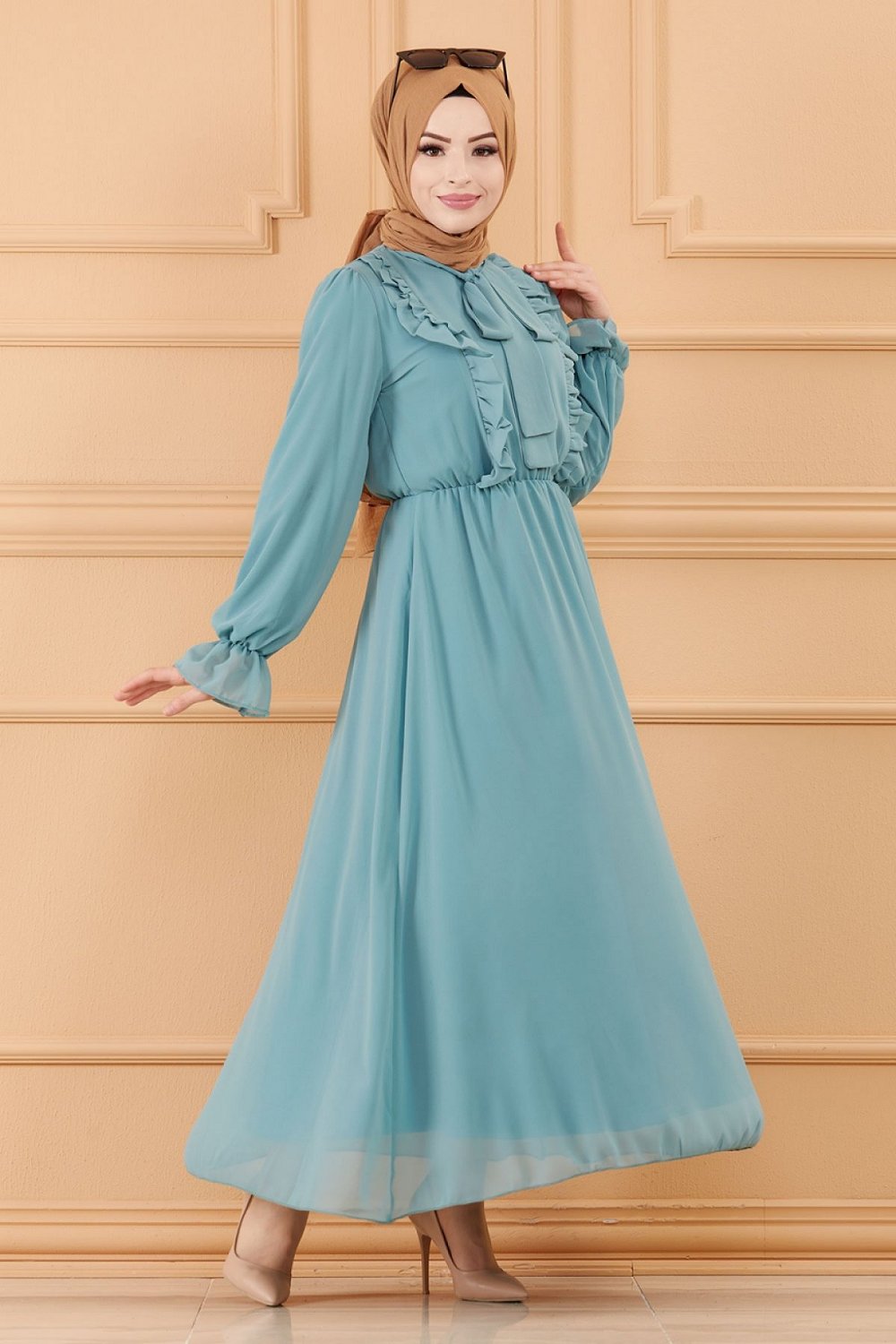 Robe longue bordée d’un volant pour femme (Vêtement style habillé pour hijab) - Couleur kaki - REF. 35191 (26.00 €) - En Promotion à 19.90 €