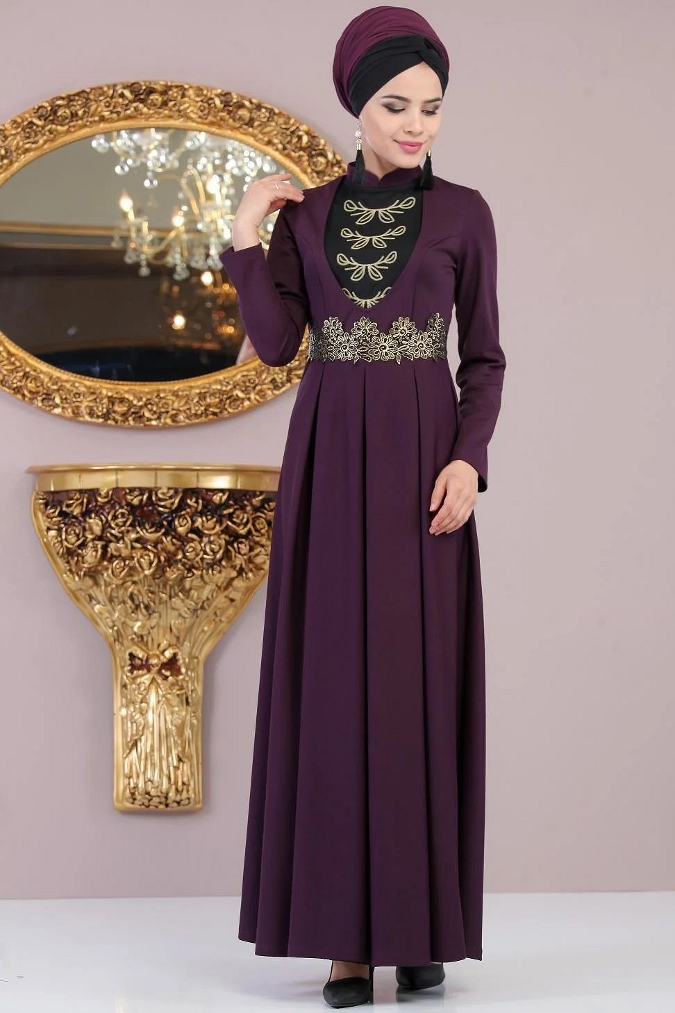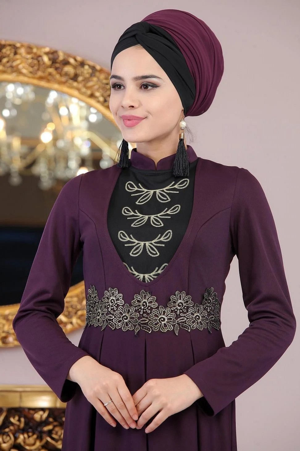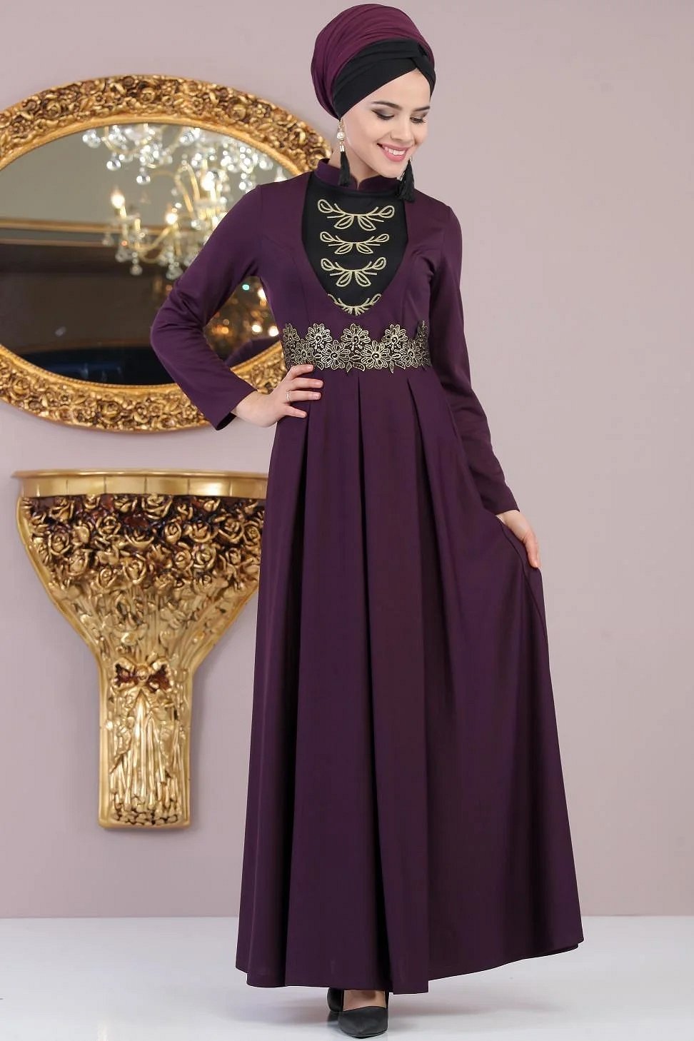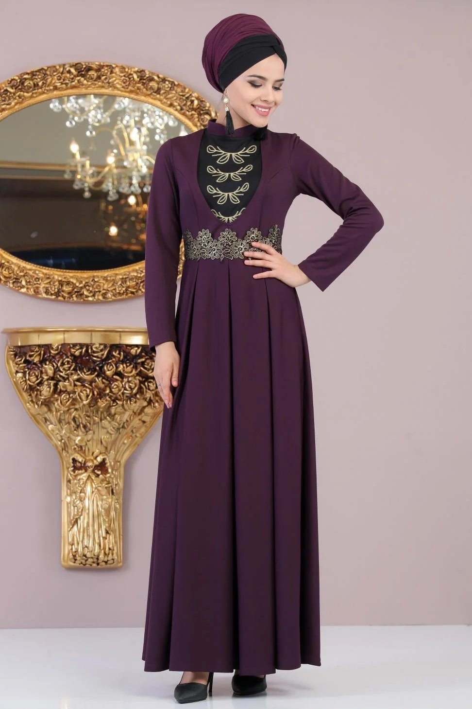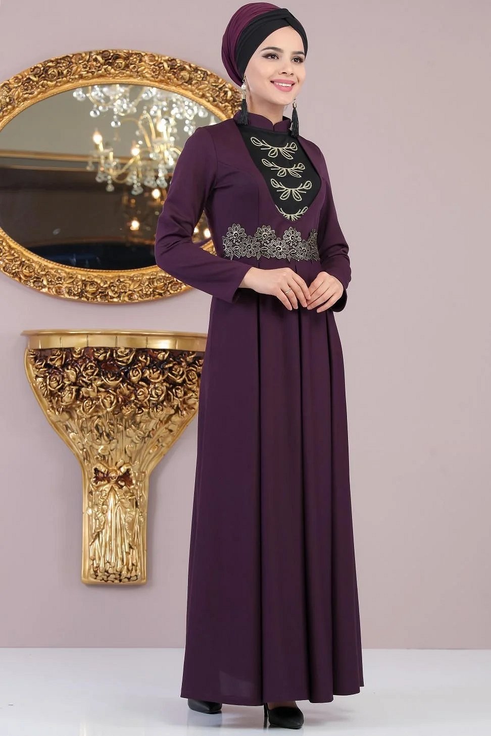 Robe de soirée élégante très longue pour femme - Couleur violette et noire avec broderies dorées Vetement & Accessoire