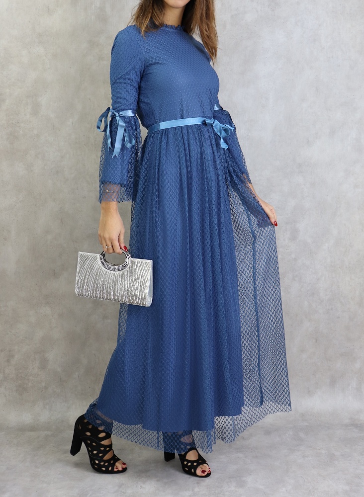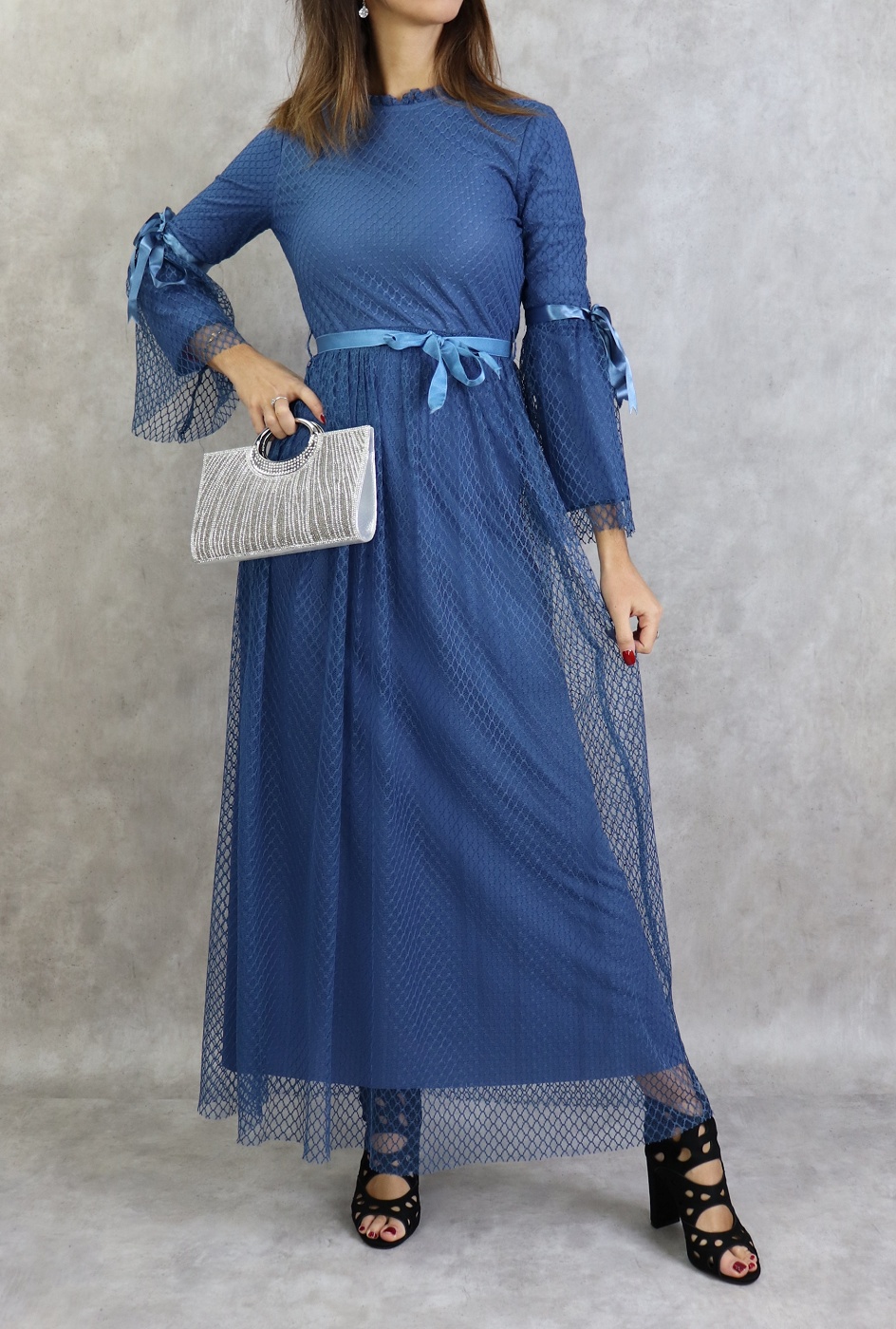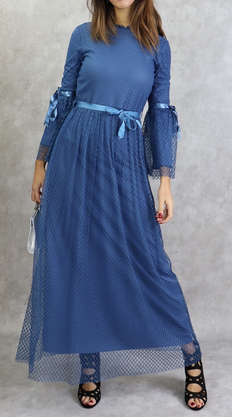 Robe de soirée longue à dentelle (en tulle) de couleur bleu Vetement & Accessoire