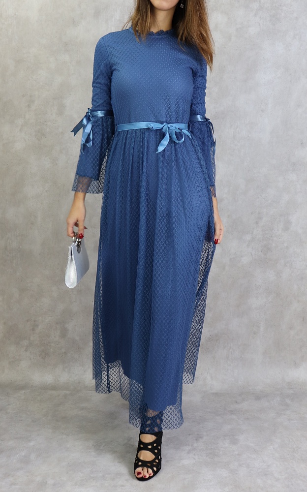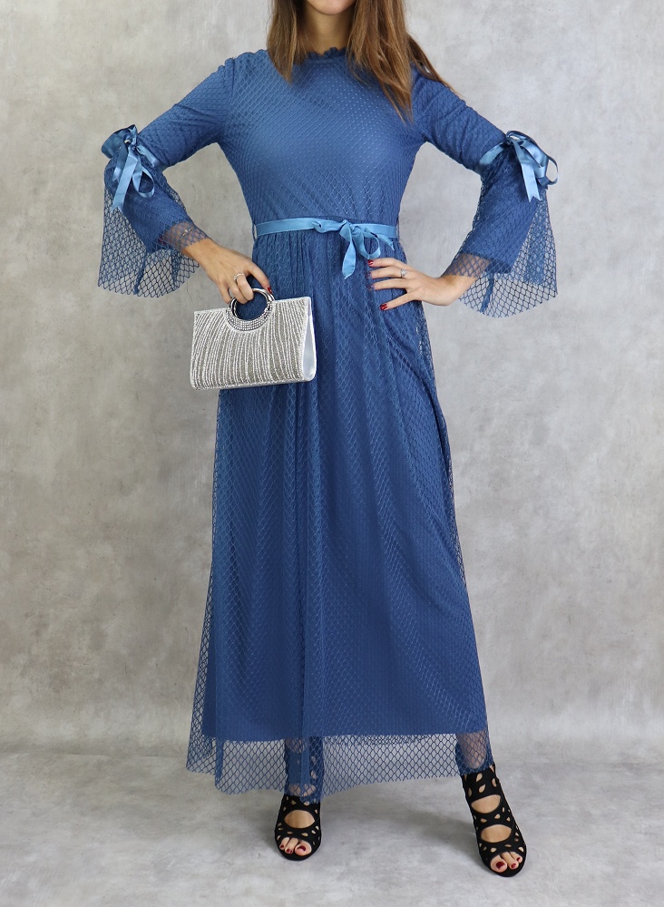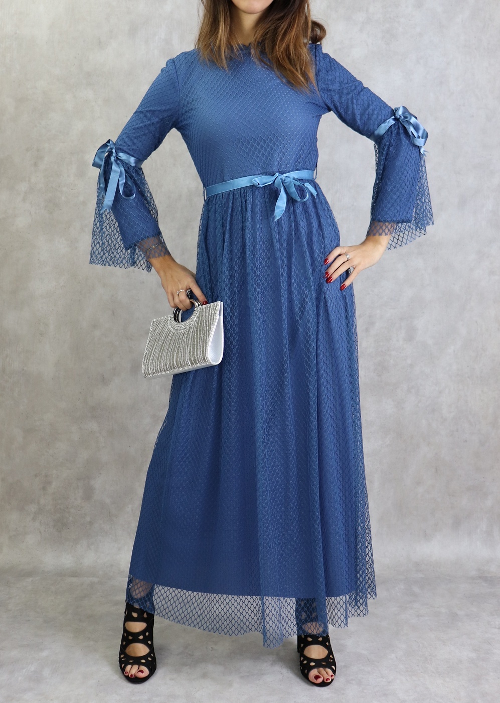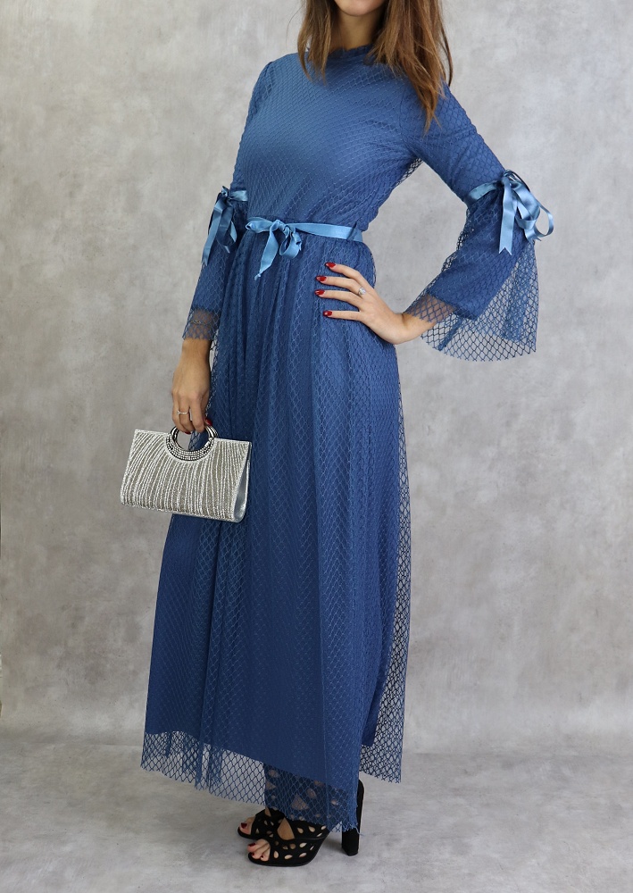 Robe de soirée longue à dentelle (en tulle) de couleur bleu Vetement & Accessoire