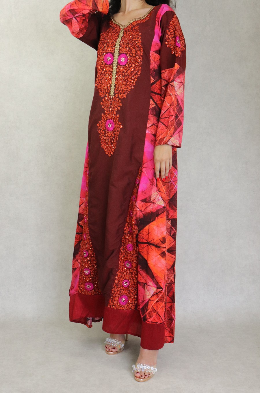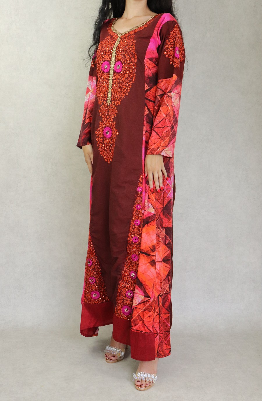 Robe orientale longue fleurie imprimée arabesque et brodée pour femme - Couleur Rouge - REF. 30948 (26.00 €)