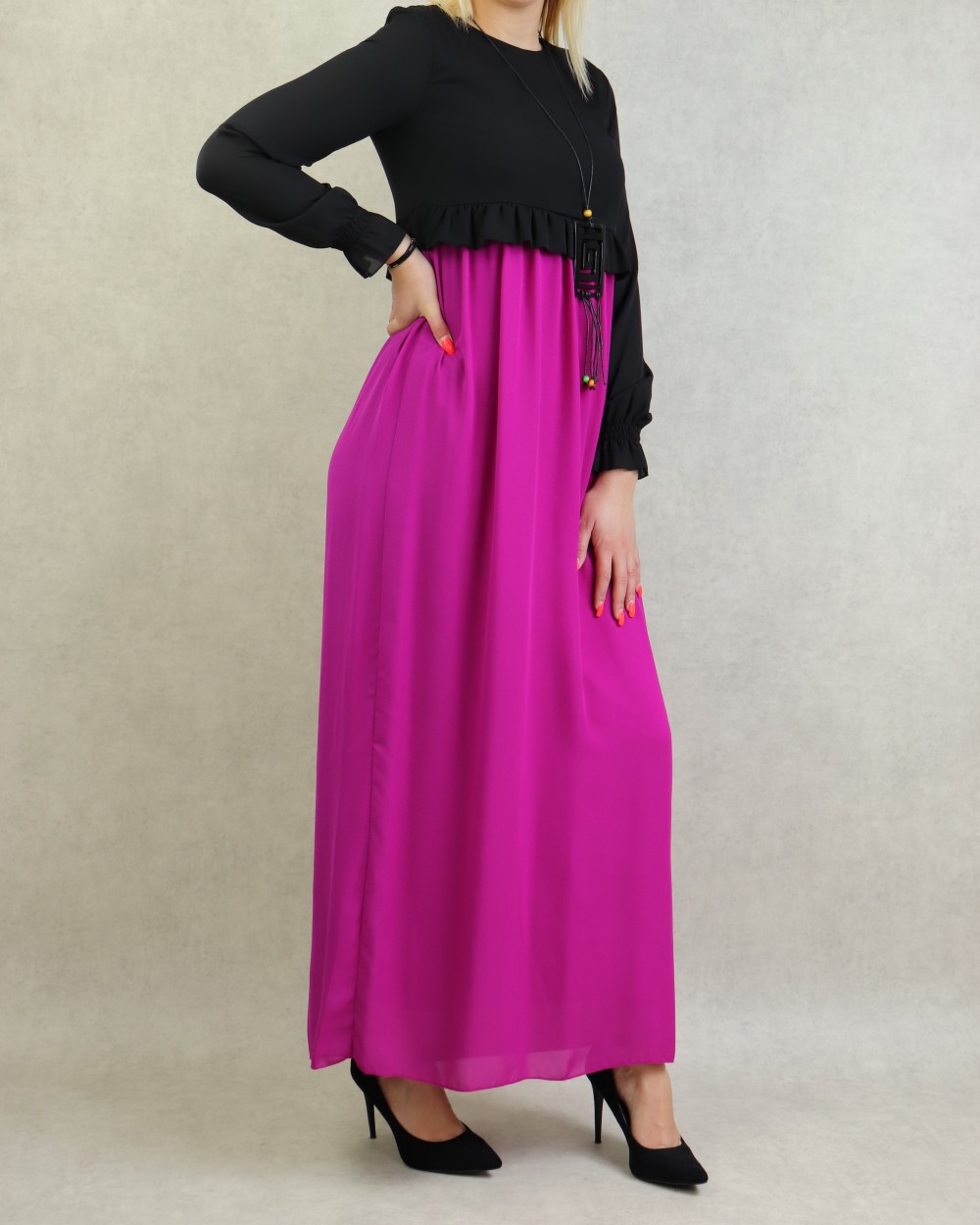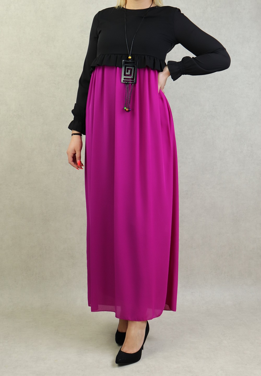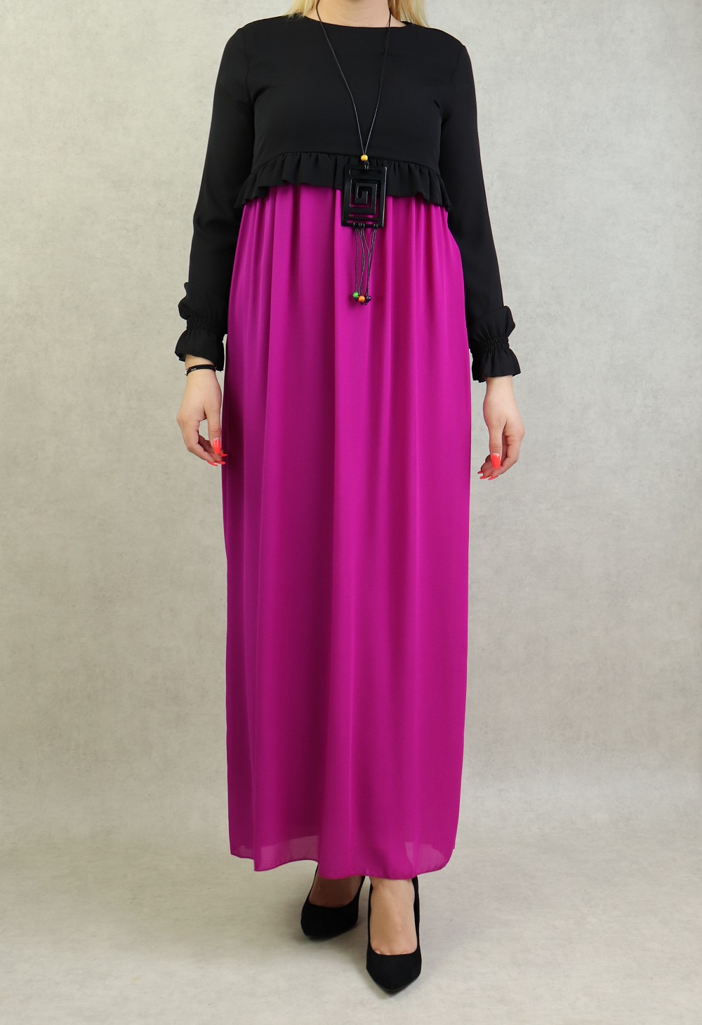 Robe de soiree maxi-longue bicolore assortie d'un collier pour femme - Couleur Noir et Violet