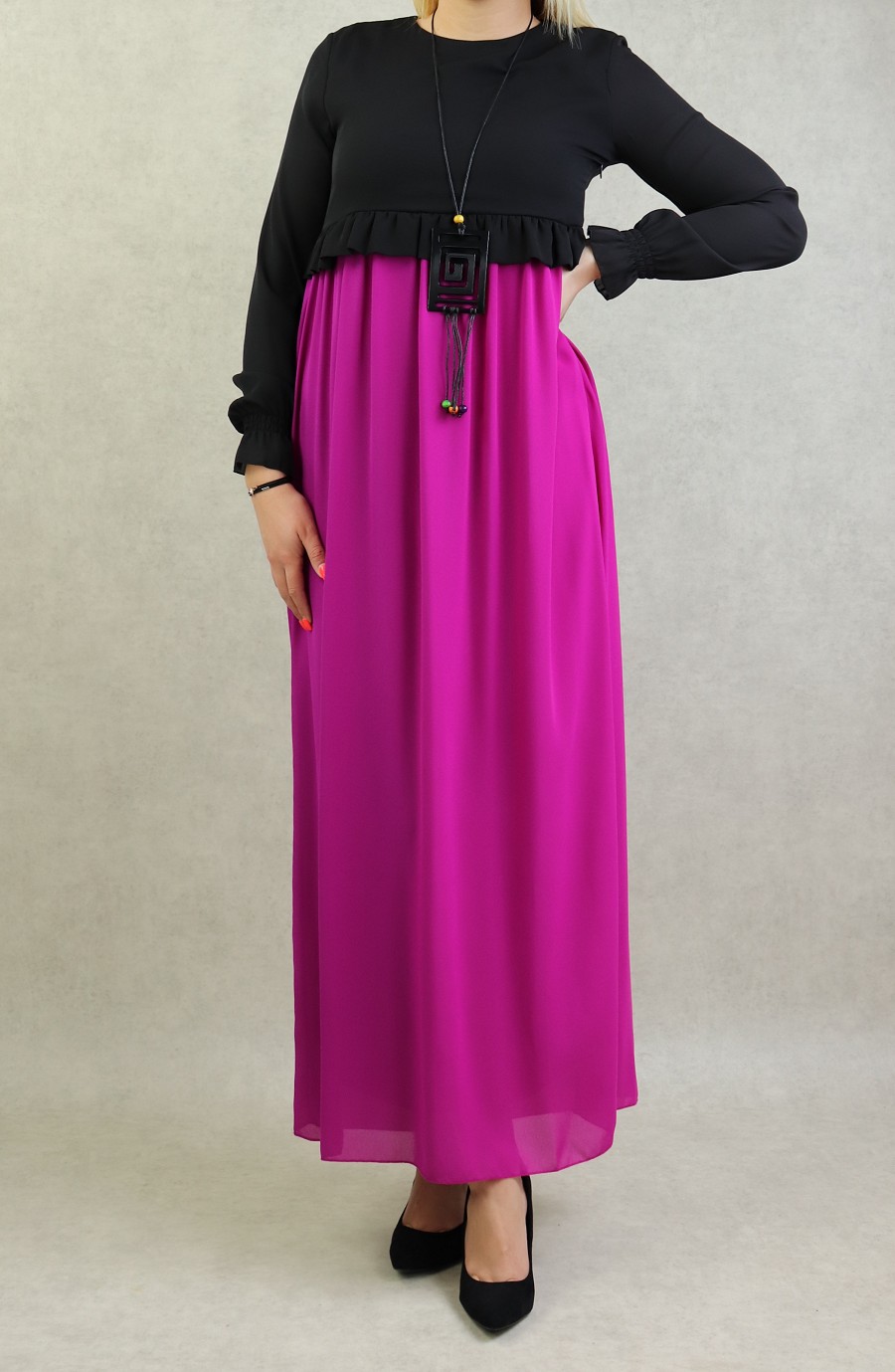 Robe longue bi-matière fluide pour femme (Vetement-Hijab moderne) - Couleur rose - REF. 33963 (25.00 €)