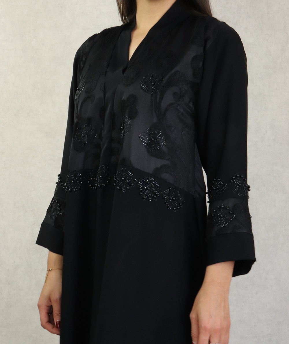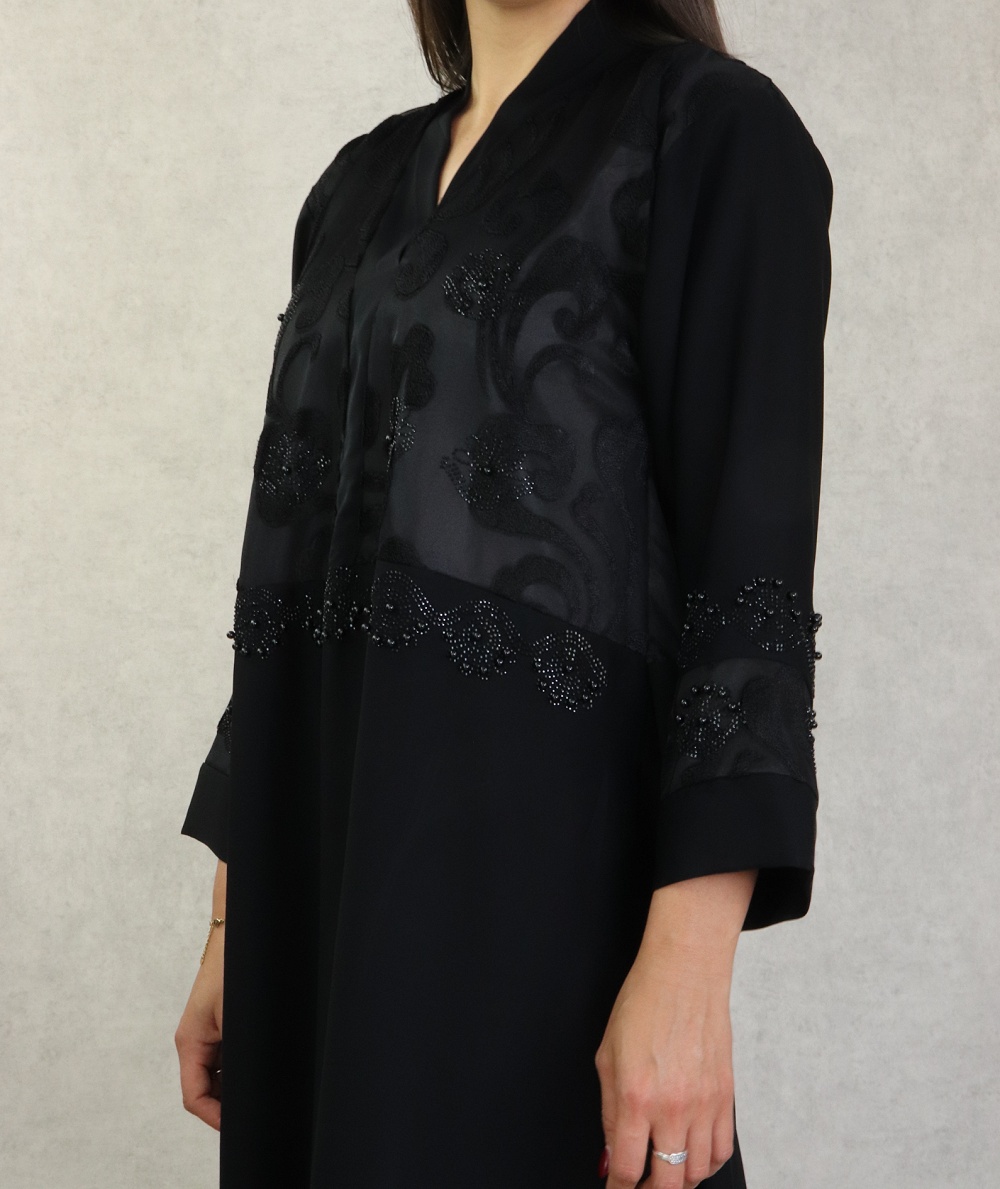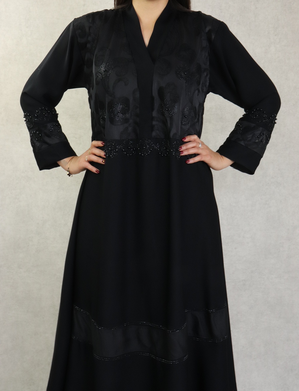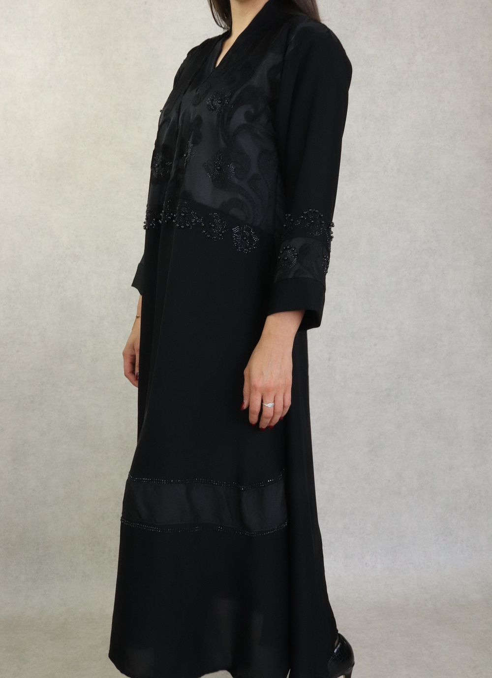 Robe Abaya Dubaï noire de qualité avec nombreuses perles noires et strass - REF. 38118 (45.00 €)