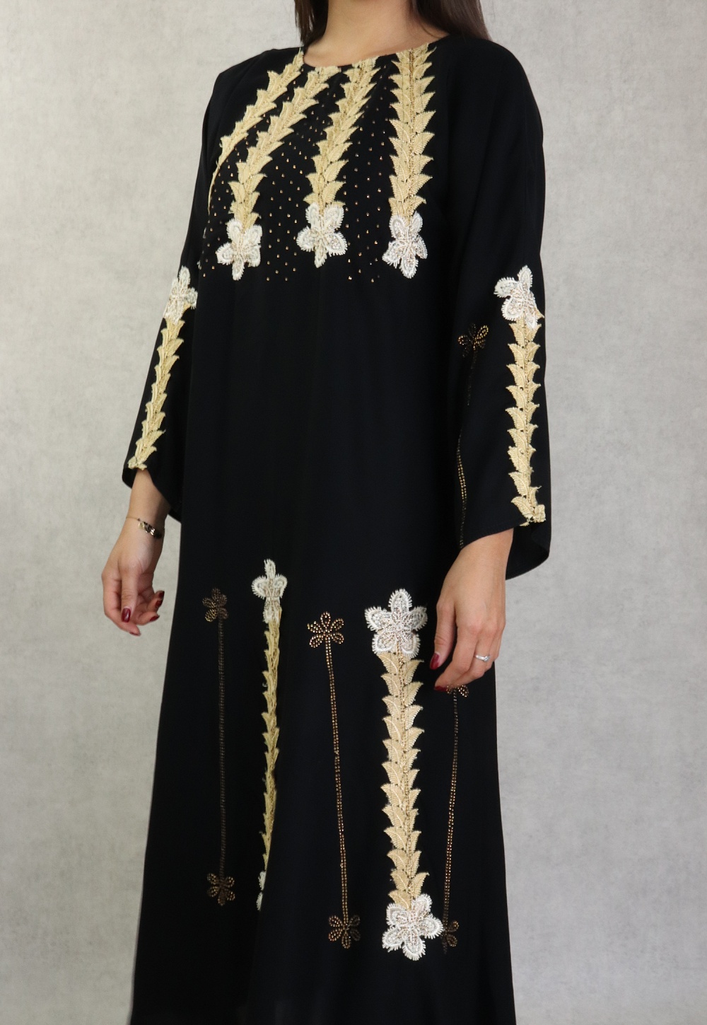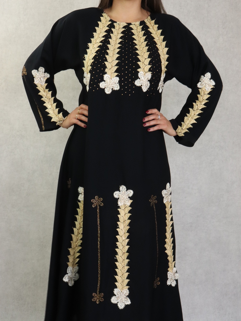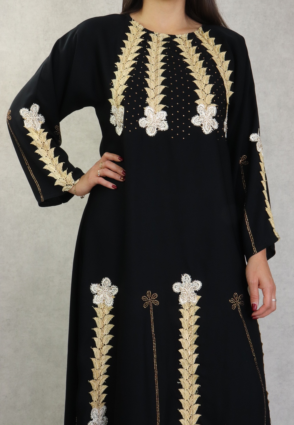 Robe de soirée noire style Abaya Dubaï de qualité avec nombreuses broderies et motifs en strass dorés - REF. 38173 (45.00 €)