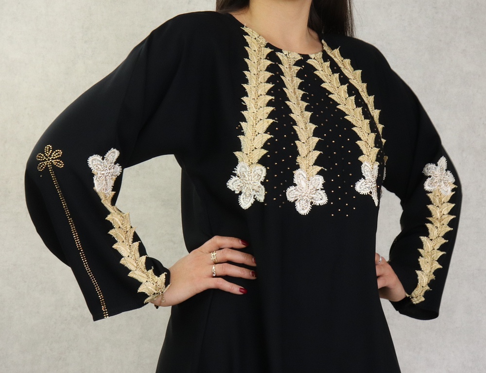 Robe Abaya Dubaï de qualité avec motifs strass dorés sur le devant et les manches - Couleur noir - REF. 38179 (39.90 €)