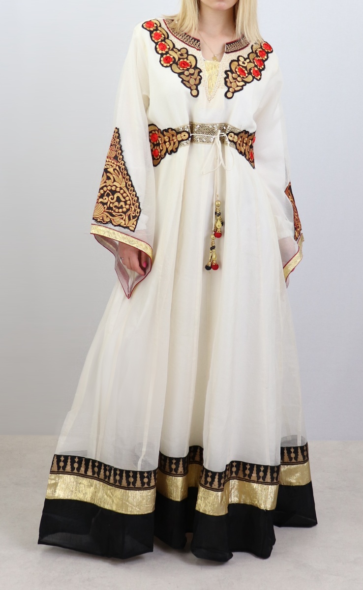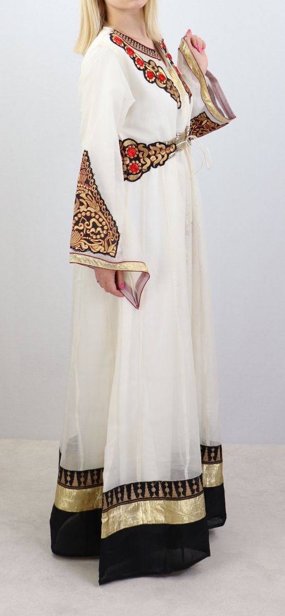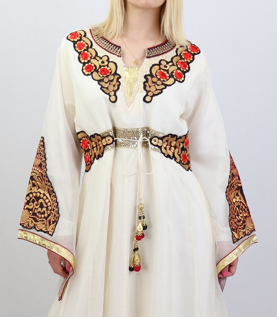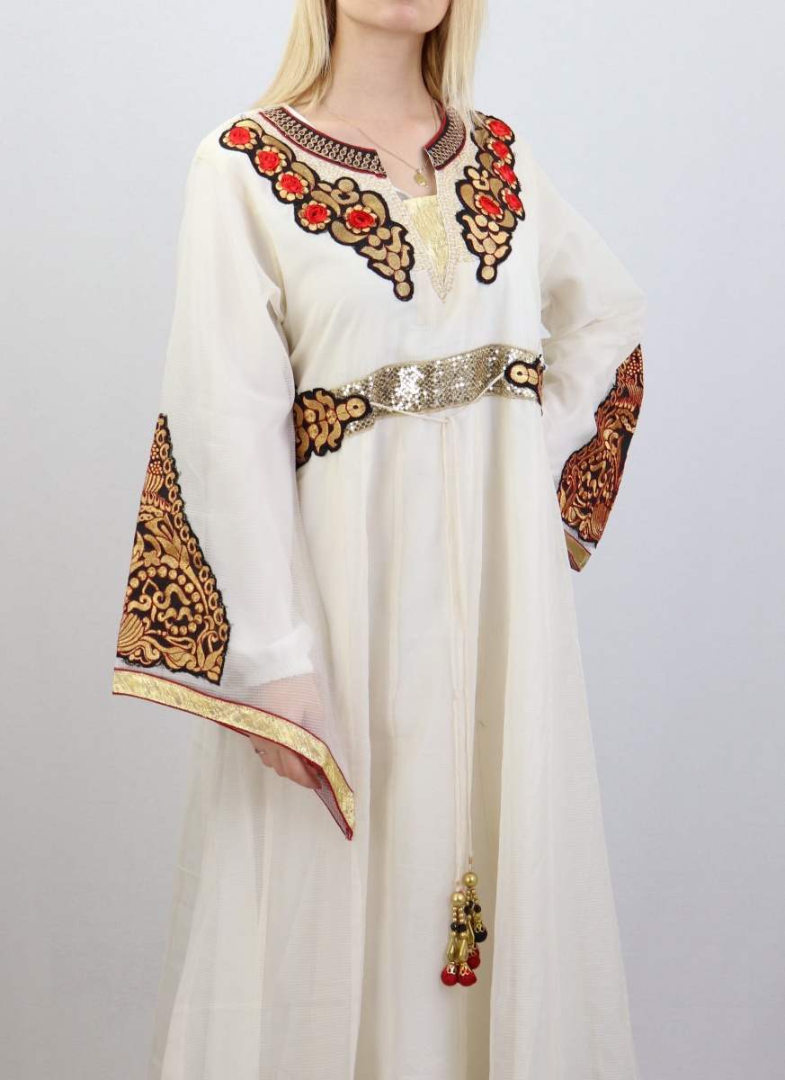 Robe de soirée de couleur blanc cassé, magnifiquement décorée avec doublure intégrale (sauf les manches) et nombreuses broderies dorées, ceinture de strass intégrée tout autour de la taille.