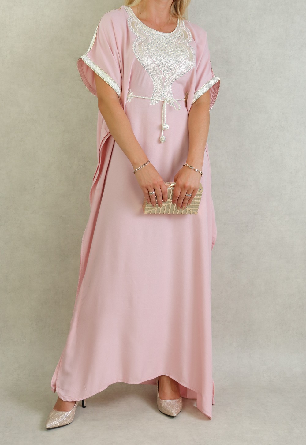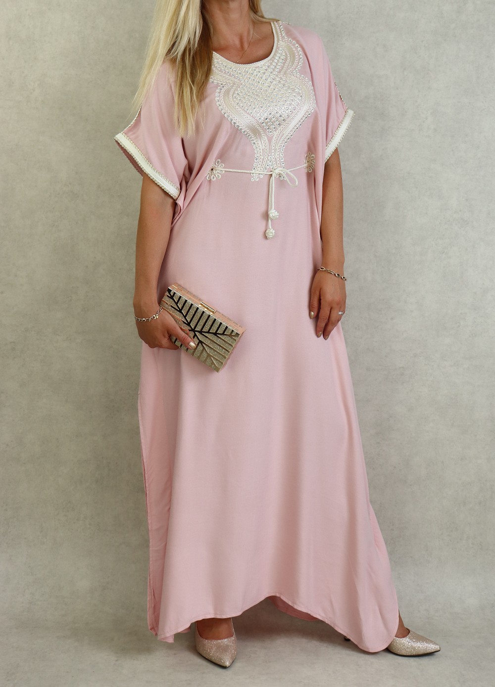 Robe de soirée tunisienne manches courtes brodée pour femme - Couleur rose clair Vetement & Accessoire