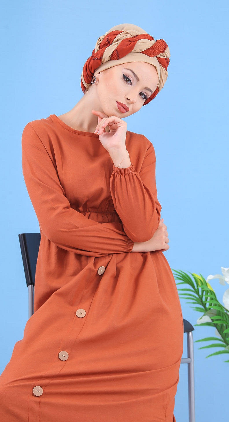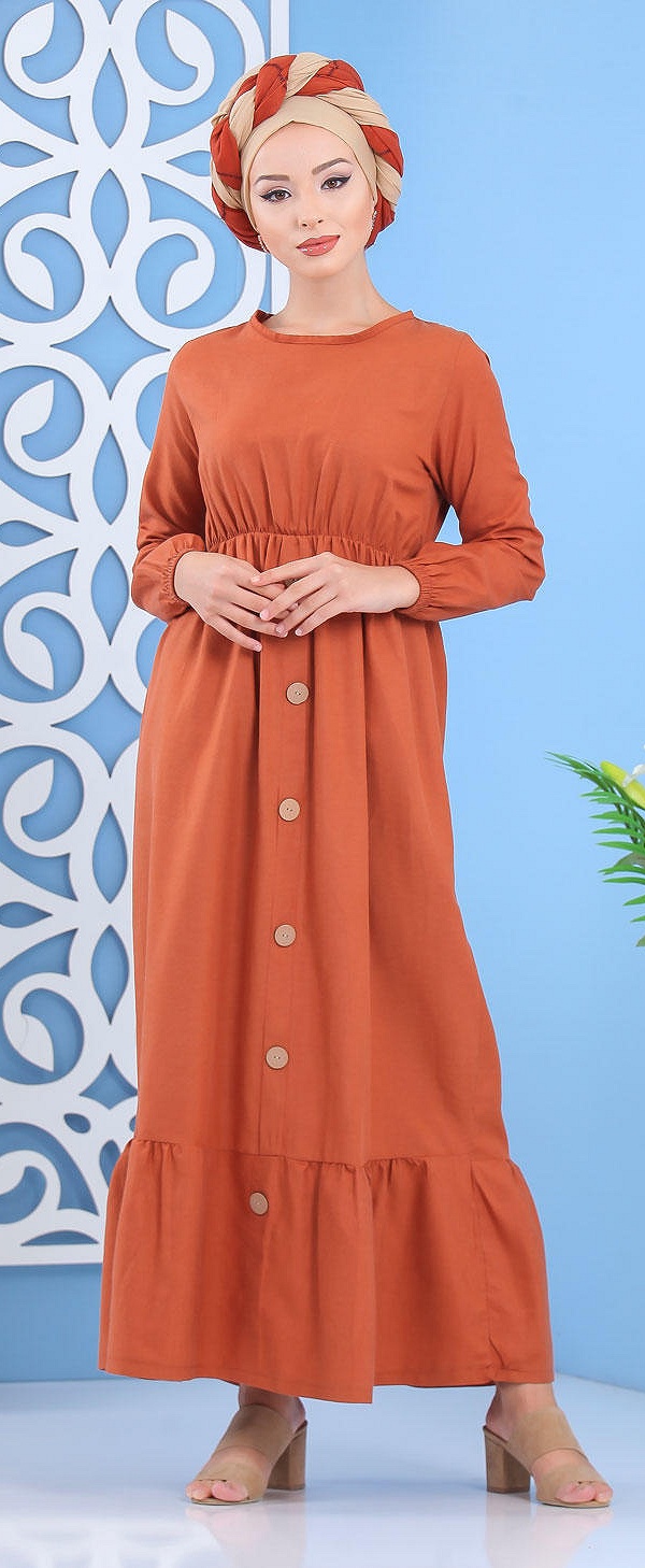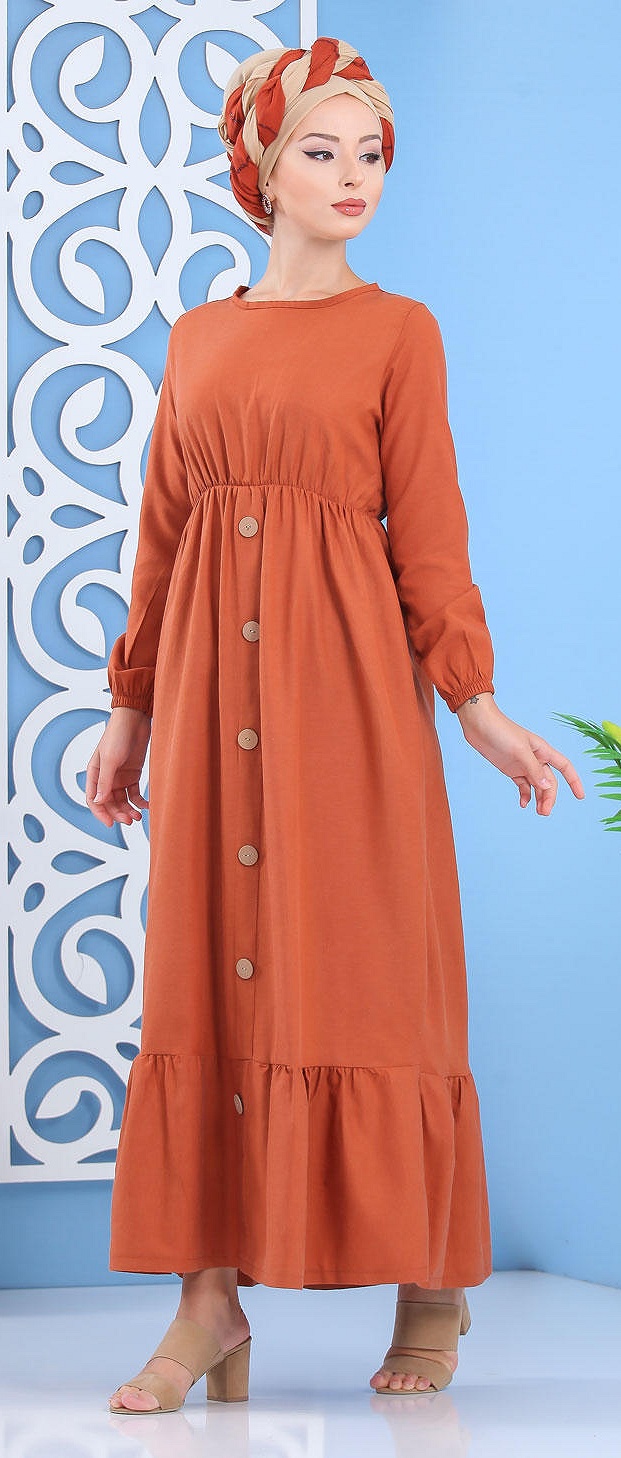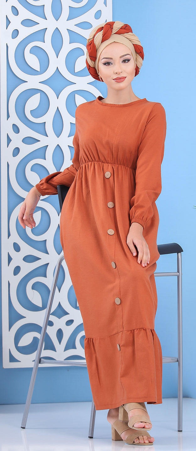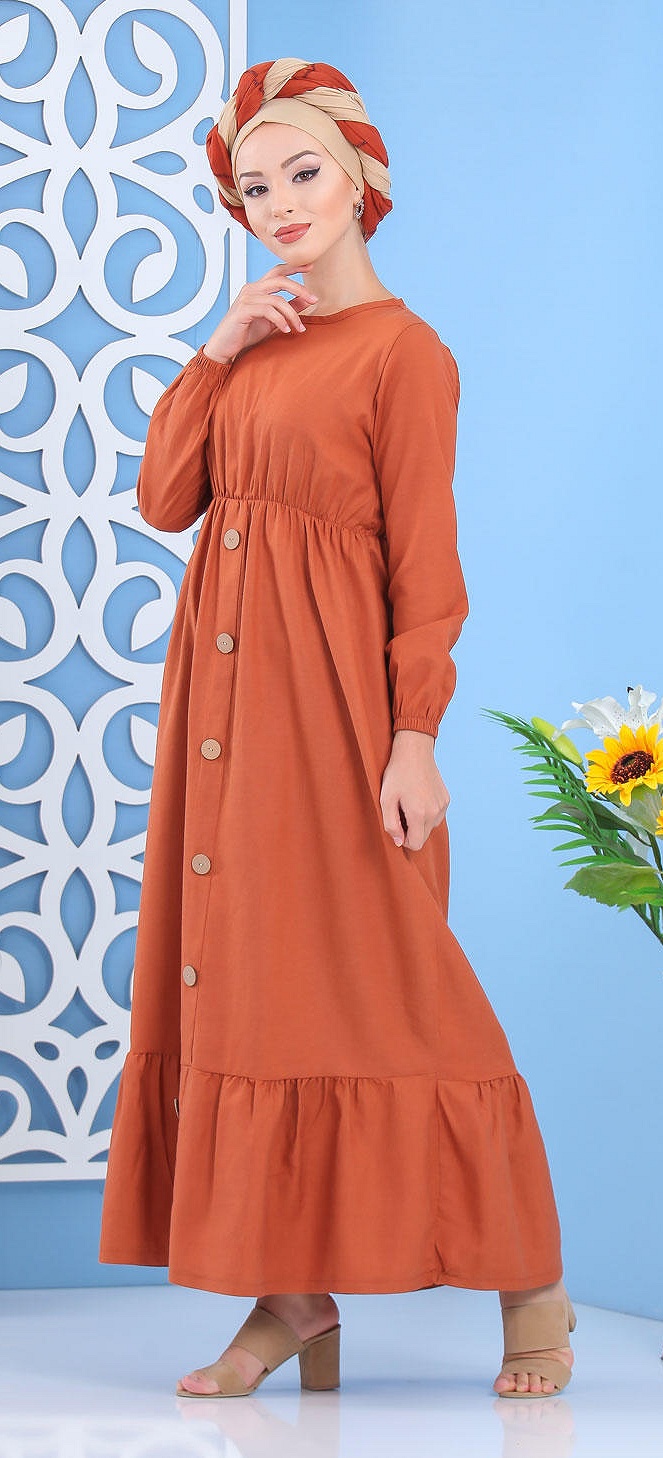 Robe longue, col arrondi, manches finition élastiques aux poignets, taille cintrée par un élastique, effet volant sur la partie basse. Sobre et élégant, ce modèle est adapté pour être porté quotidiennement, il sera encore plus mis en valeur avec quelques accessoires.