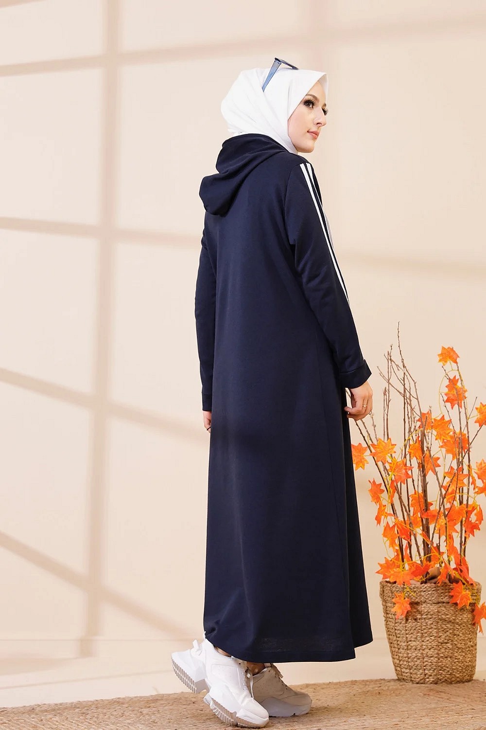 Robe longue à capuche style sweat shirt (Hijab sport pour femme musulmane) - Couleur bleu marine - REF. 32921 (29.00 €) - En Promotion à 22.90 €
