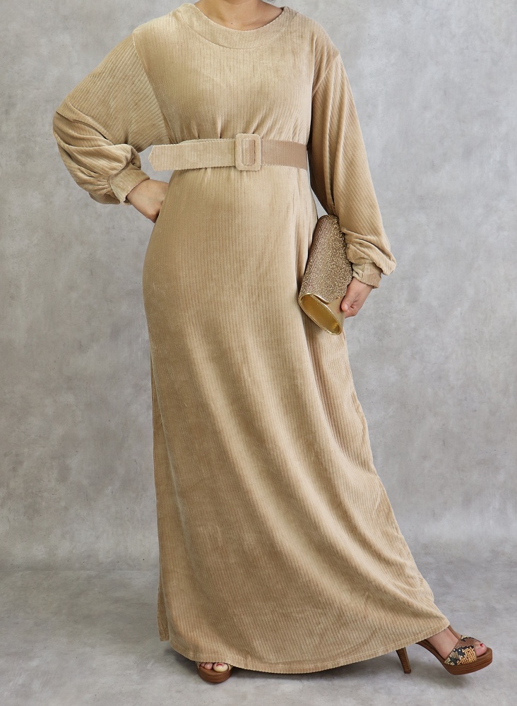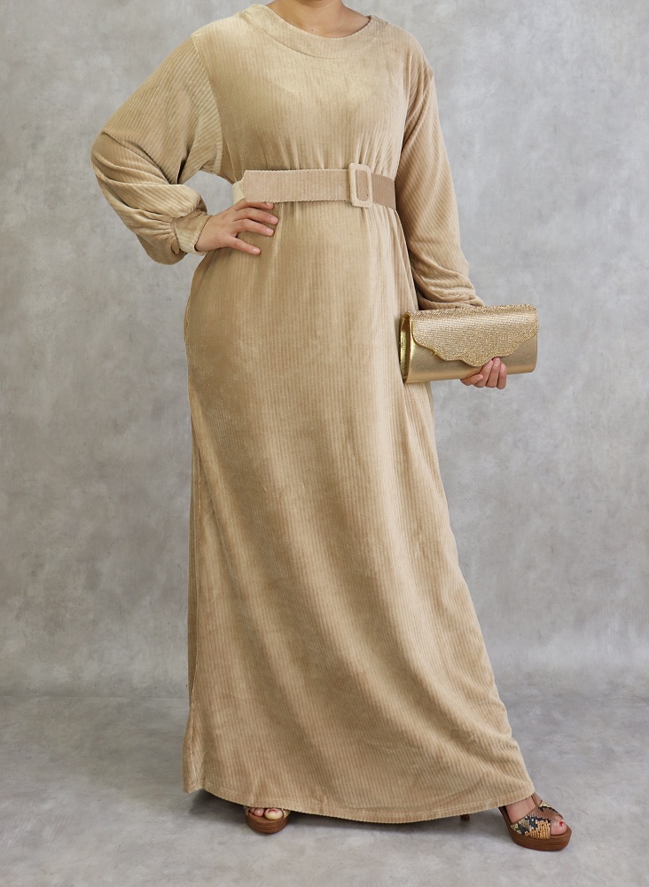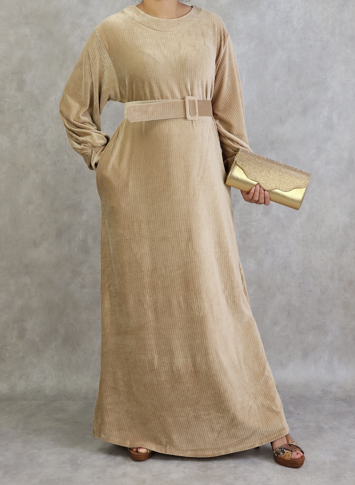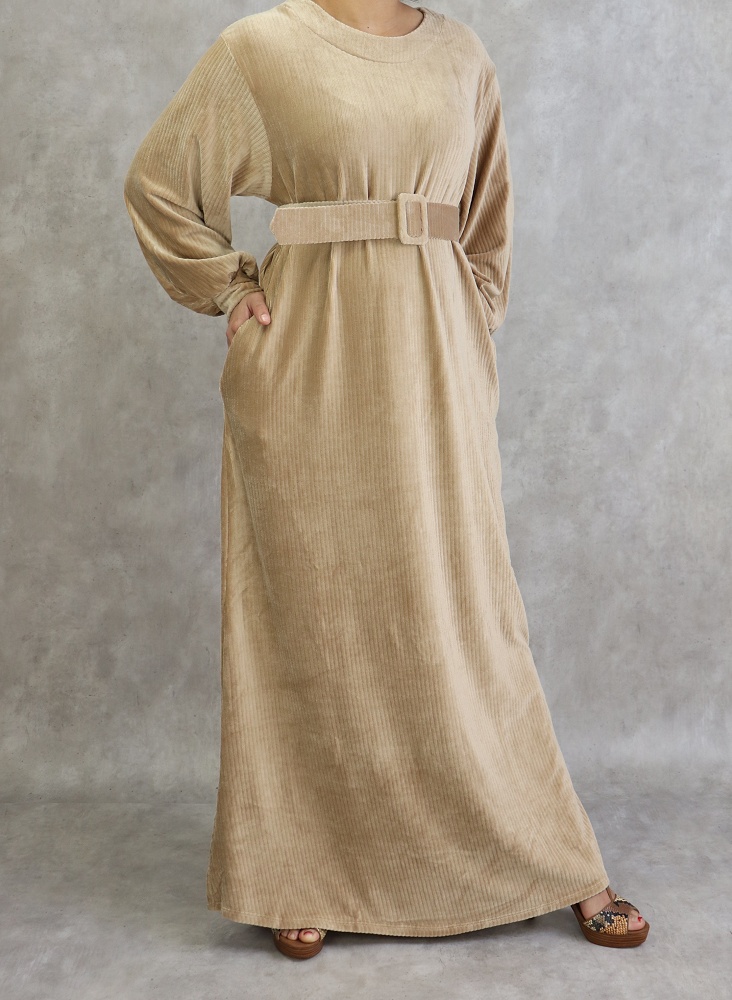 Robe longue, col dégagé, ceinture assortie ajustable, poches latérales, tissu épais et doux, effet velours côtelé, coupe droite.