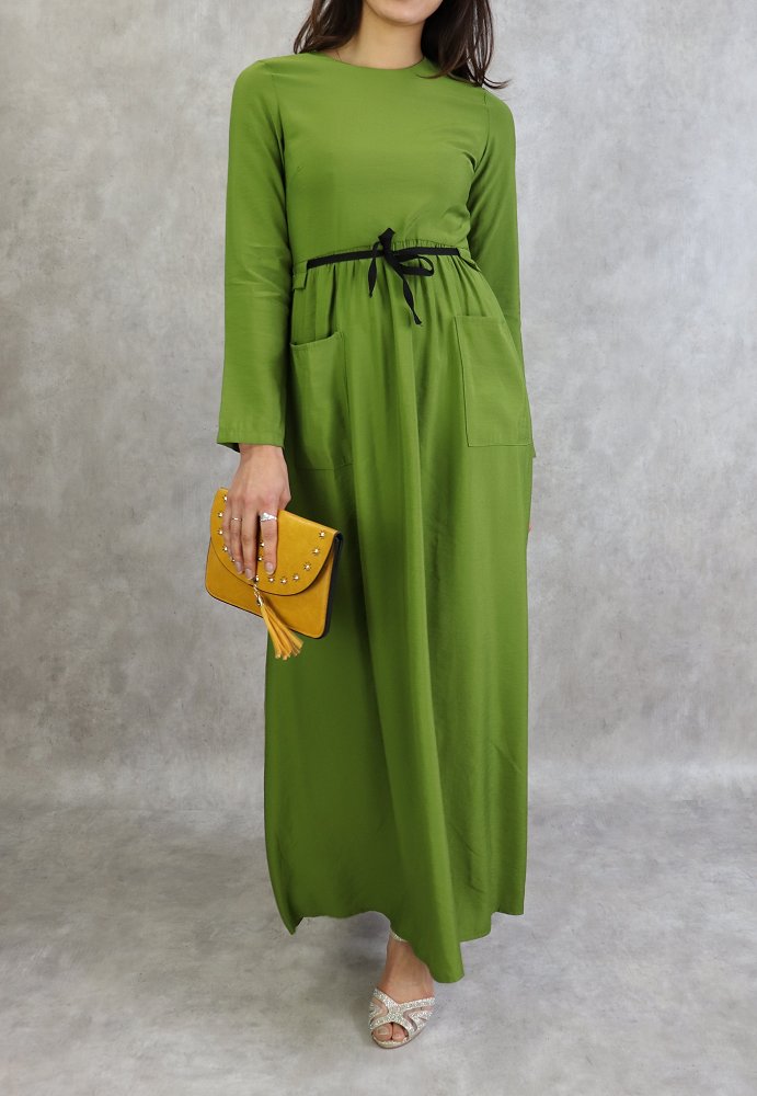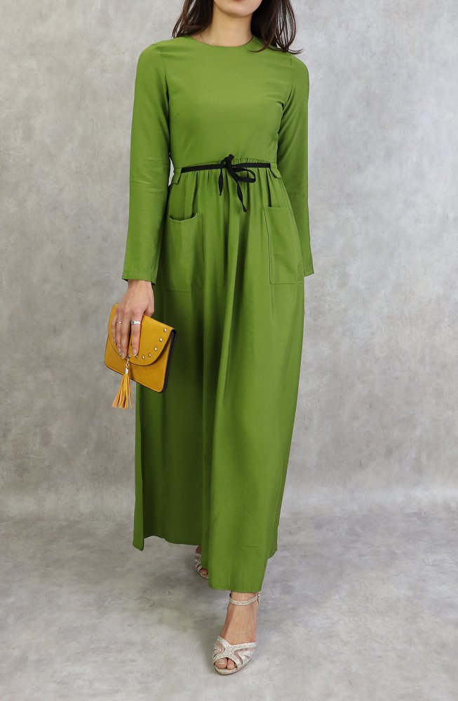 Robe elegante longue et evasee avec lien a nouer a la taille - Couleur Vert