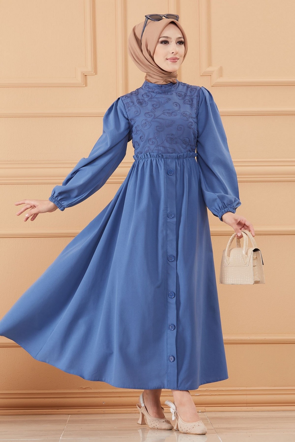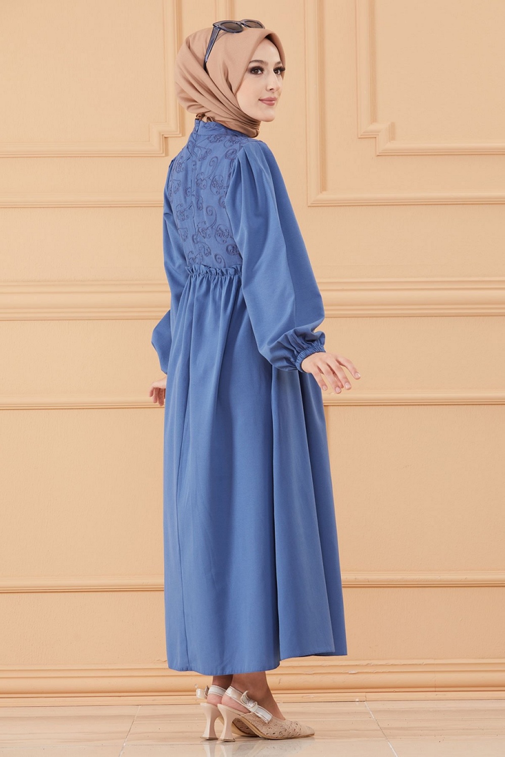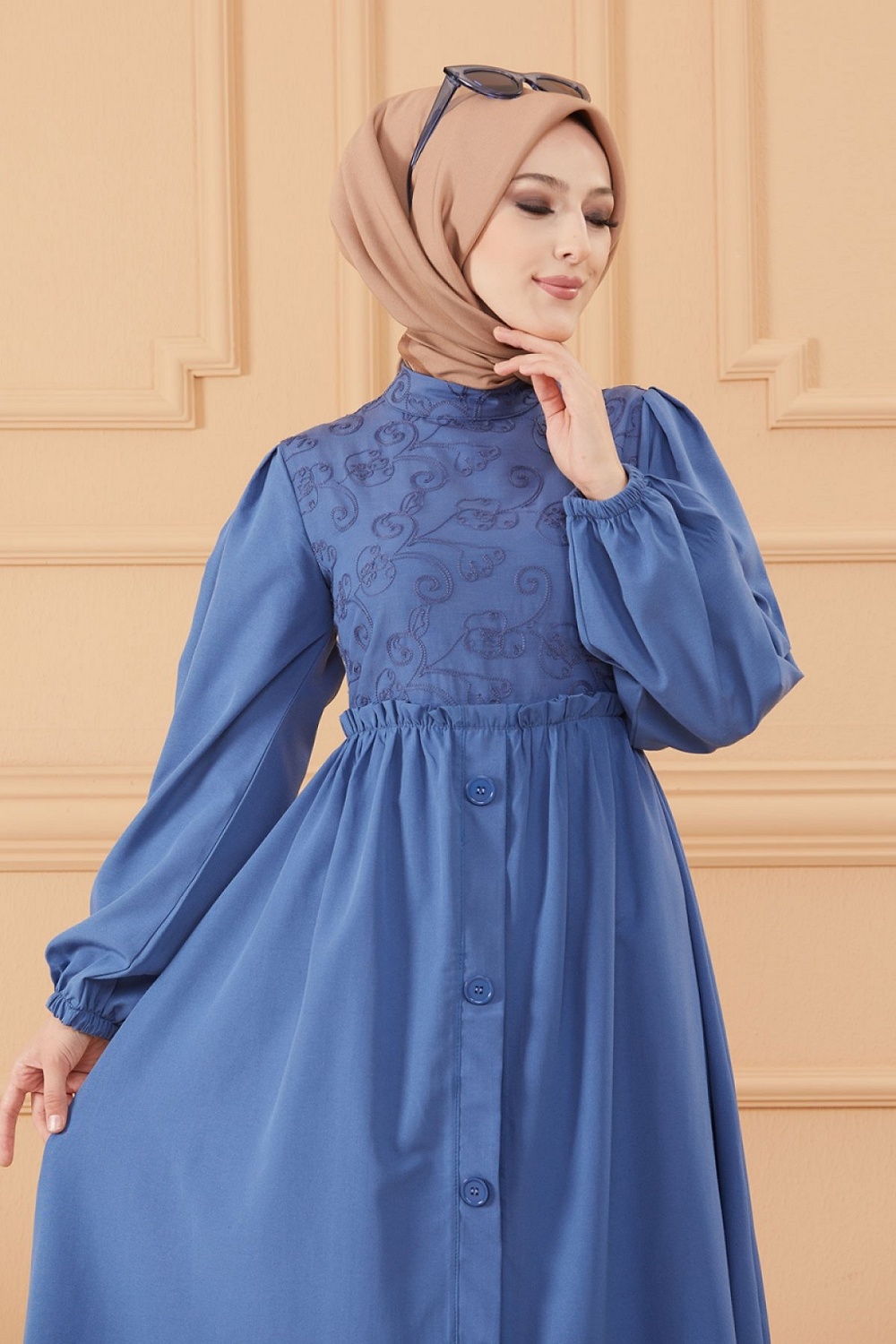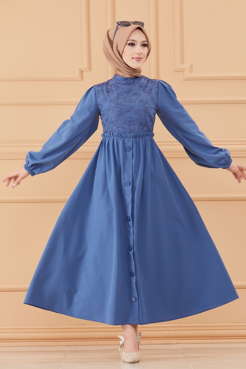 Robe en coton ample style évasé avec broderie discrète pour femme (Vêtement habillé pour hijab) - Couleur bleu indigo Vetement & Accessoire