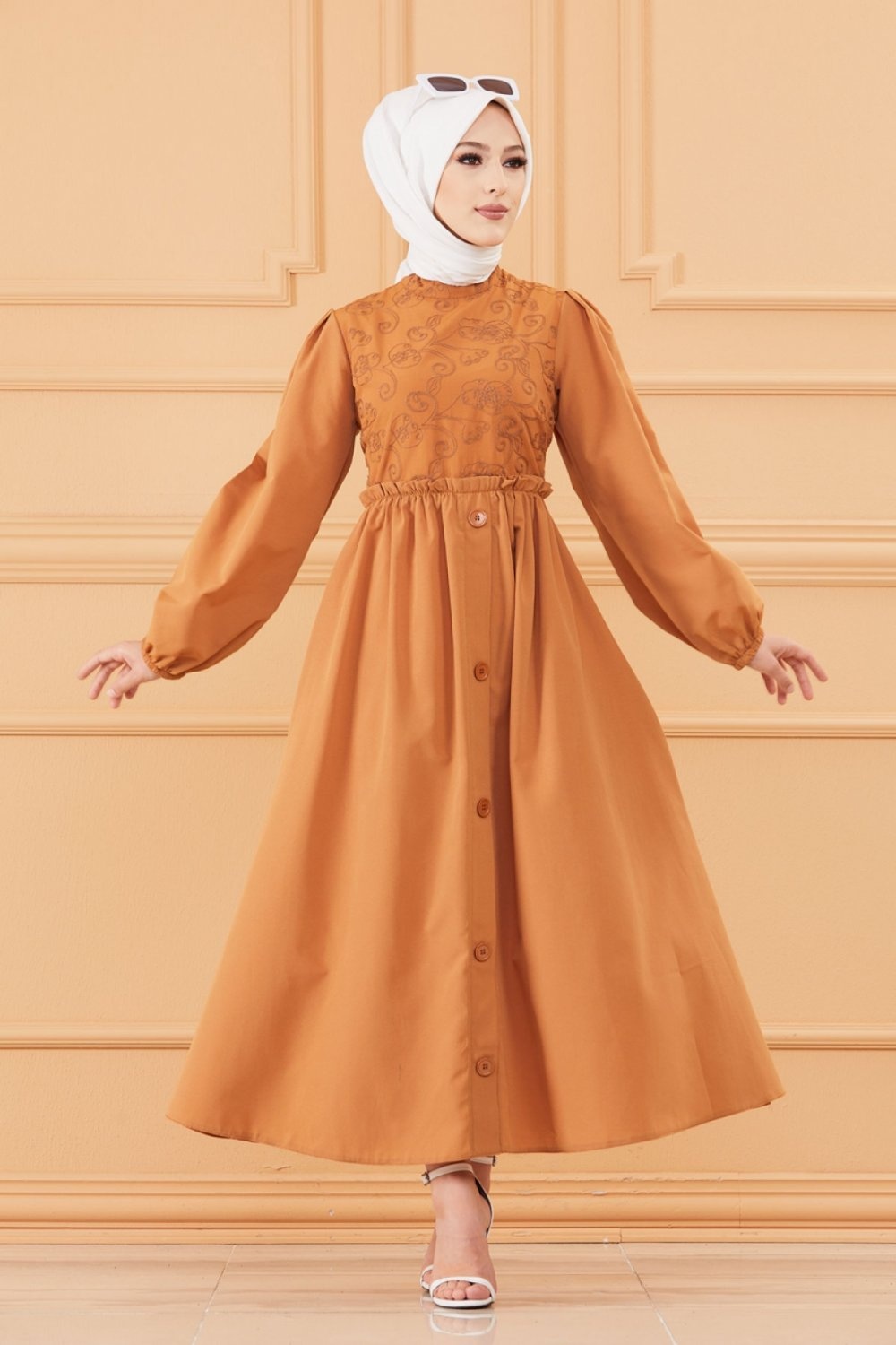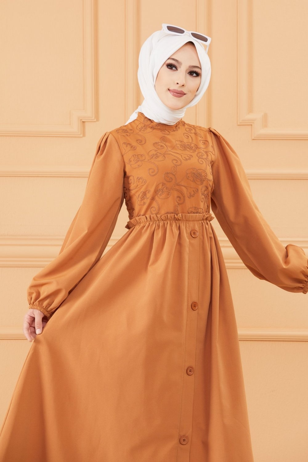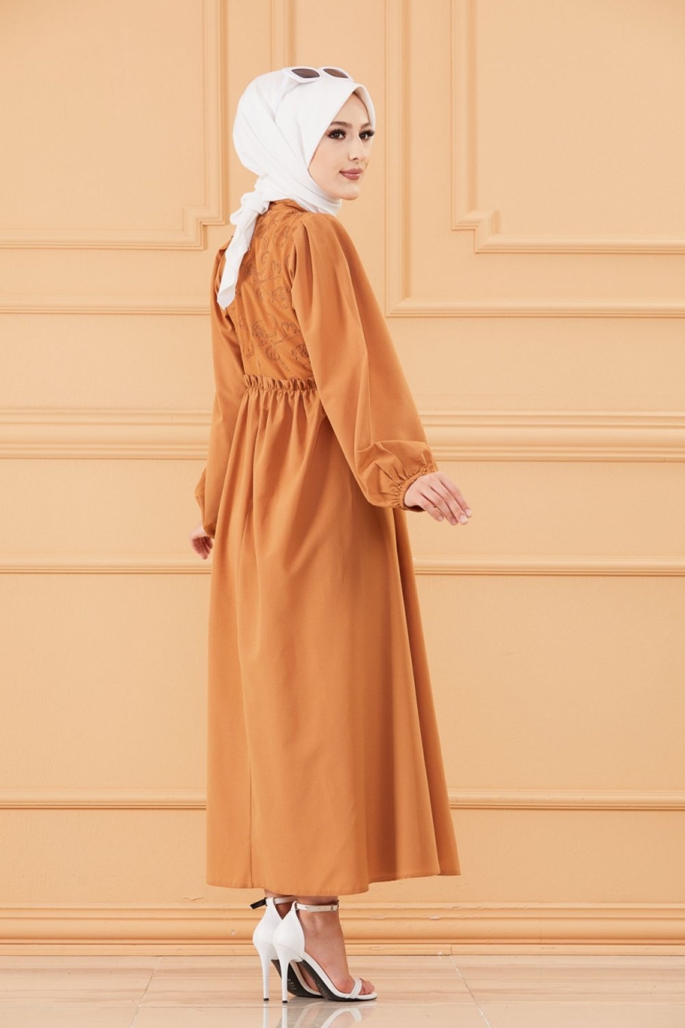 Robe en coton habillee ample et evasee avec broderies discretes pour femme (Tenue classe pour hijab) - Couleur marron/tabac
