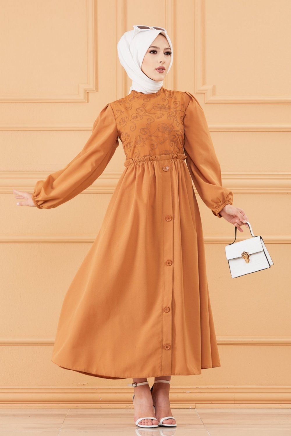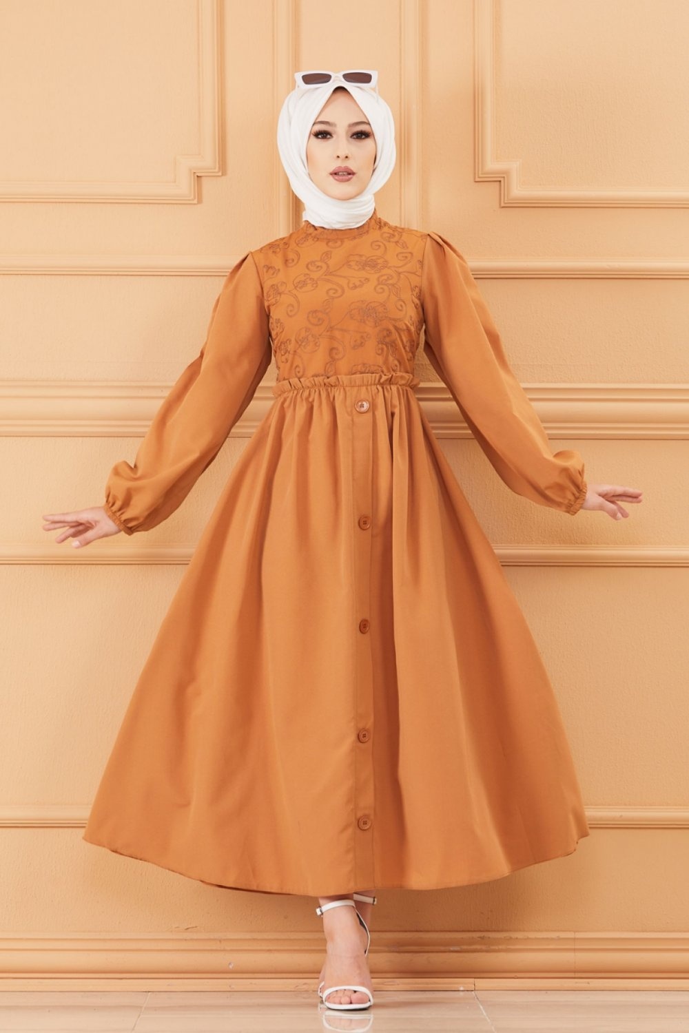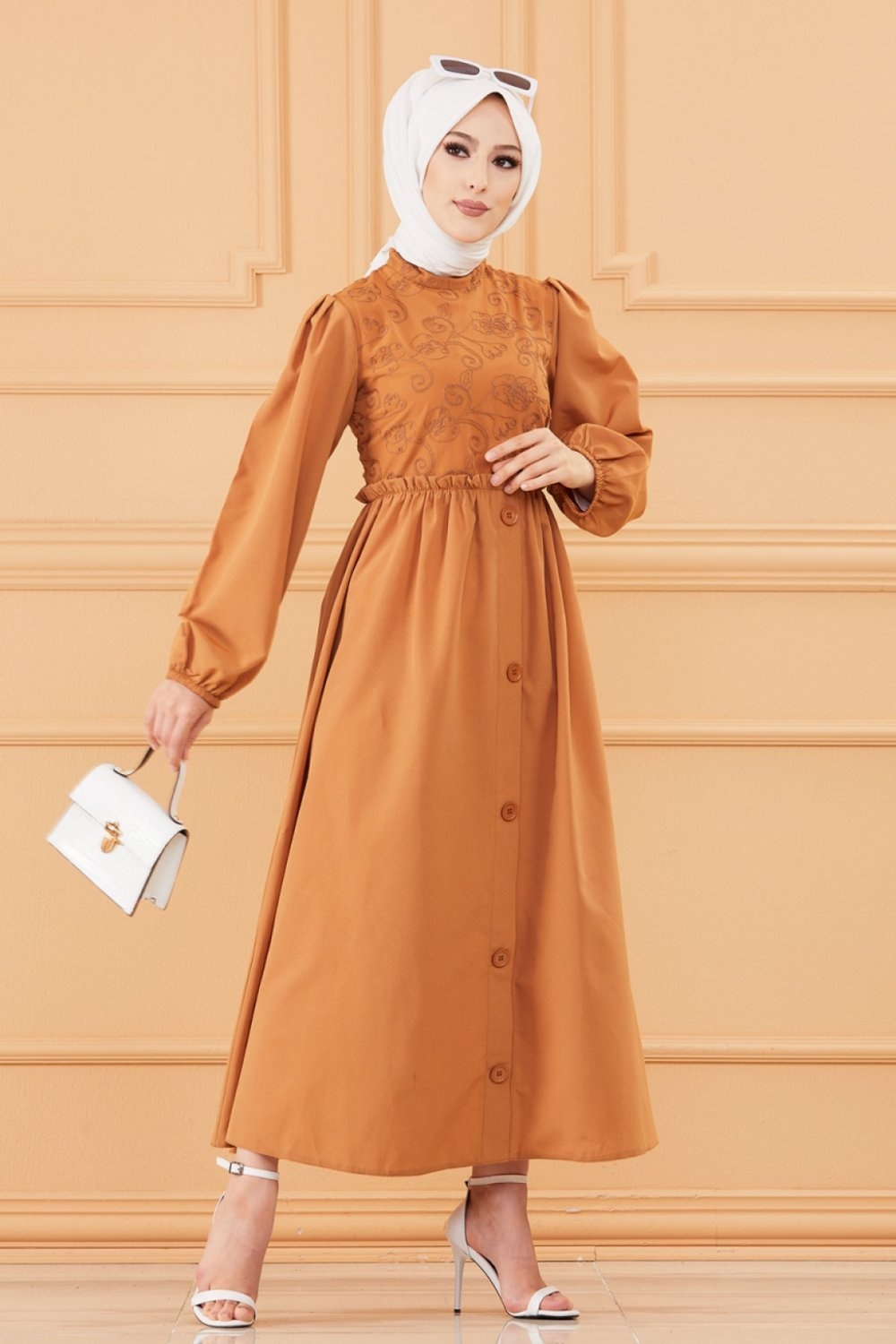 Robe en coton habillee ample et evasee avec broderies discretes pour femme (Tenue classe pour hijab) - Couleur marron/tabac