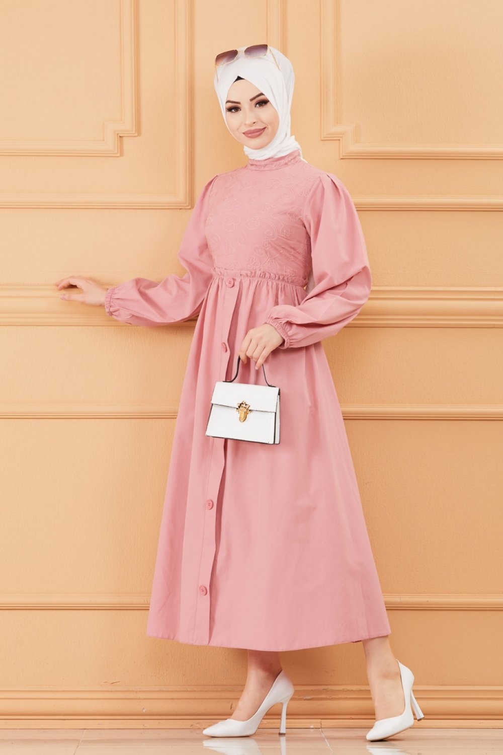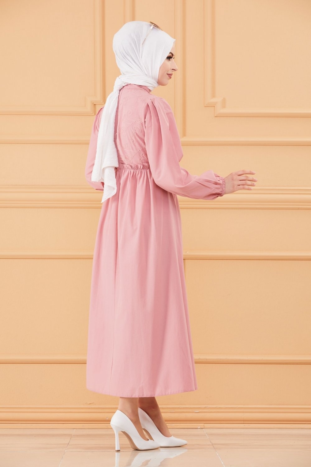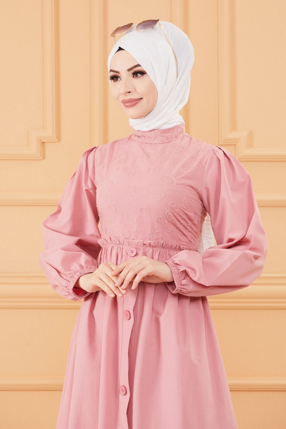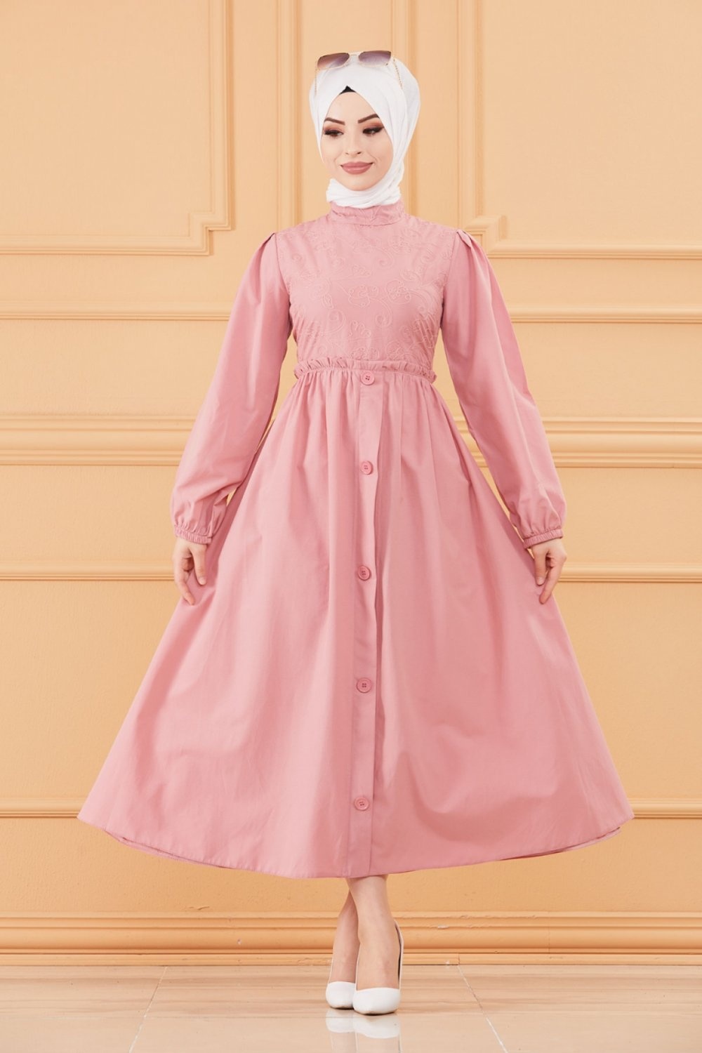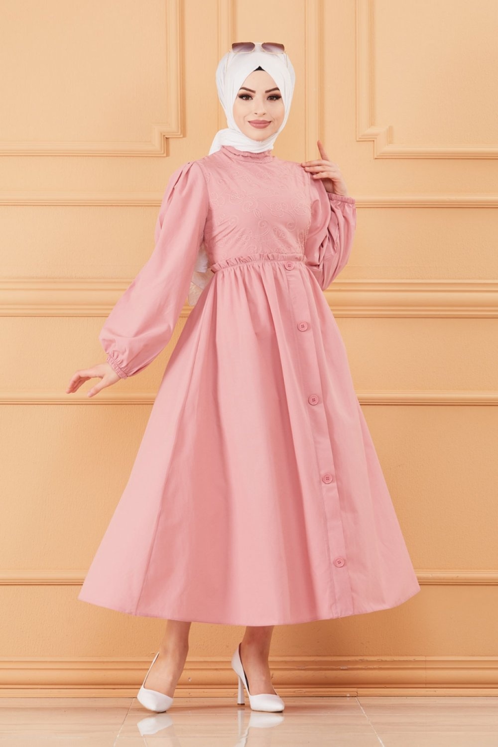 Robe en coton habillée ample et évasée avec broderies discrètes pour femme (Vêtement classique pour hijab) - Couleur rose poudré Vetement & Accessoire