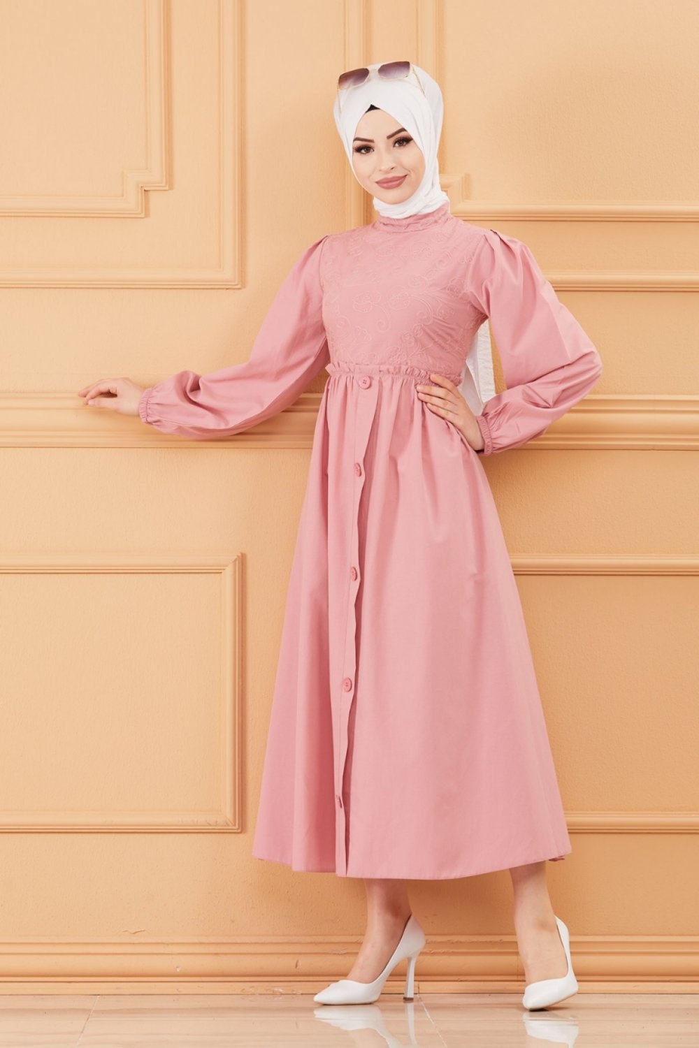 Robe en coton habillee ample et evasee avec broderies discretes pour femme (Vetement classique pour hijab) - Couleur rose poudre