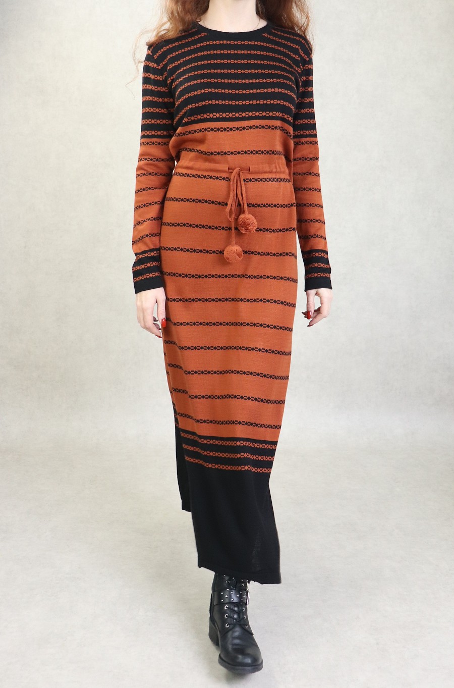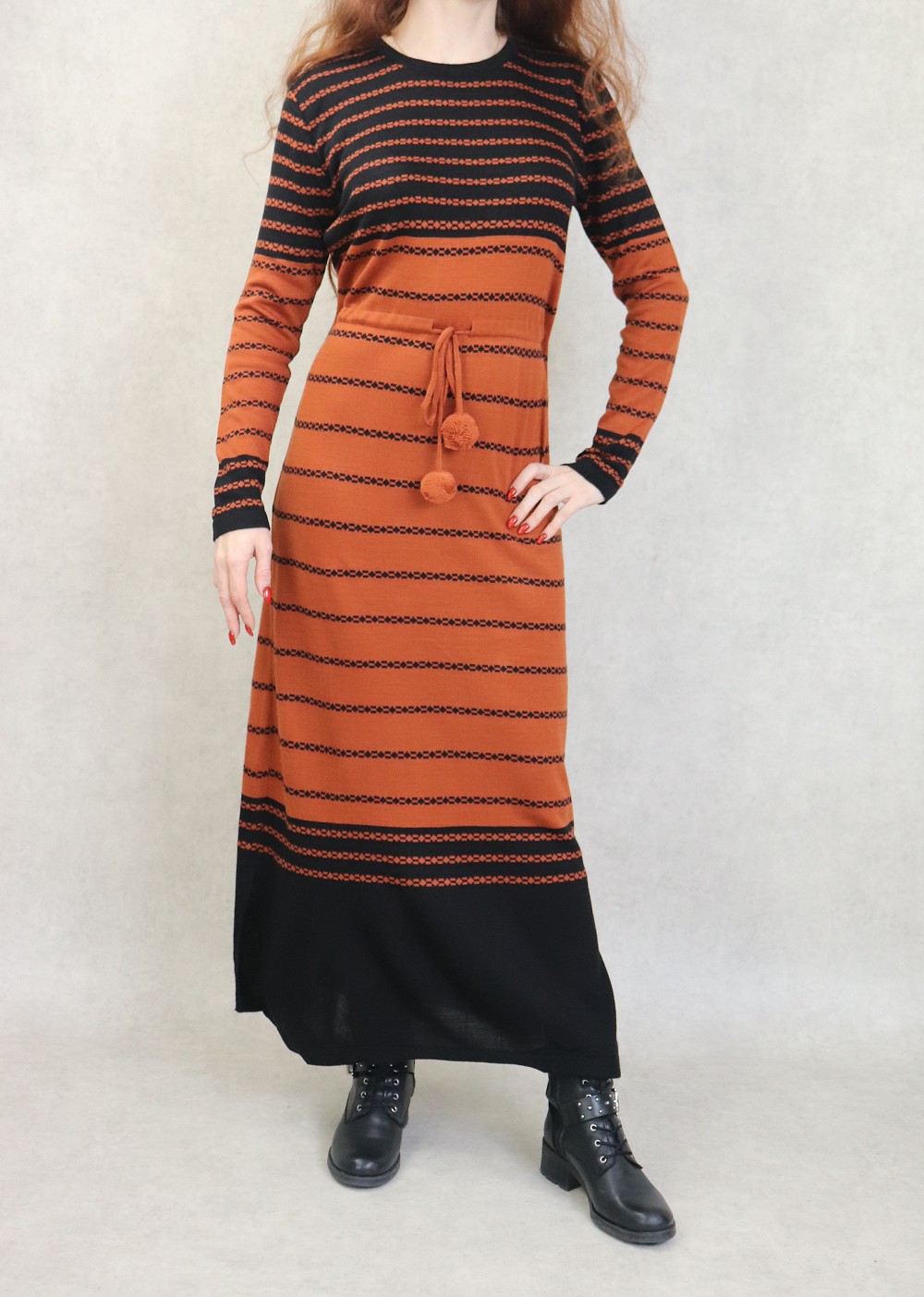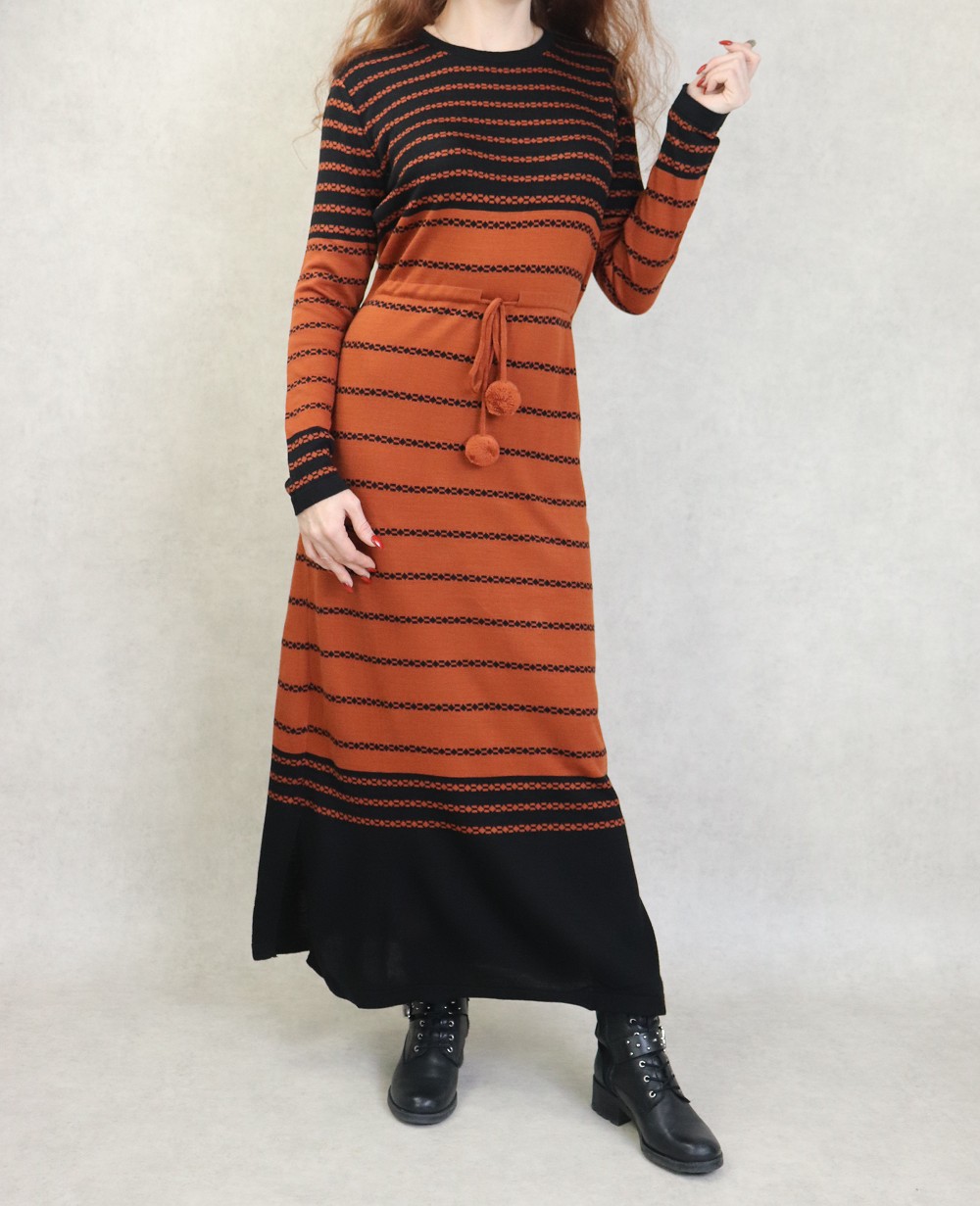 Robe en maille a rayures pour femme avec pompons (Collection Automne-Hiver) - Couleur Rouille