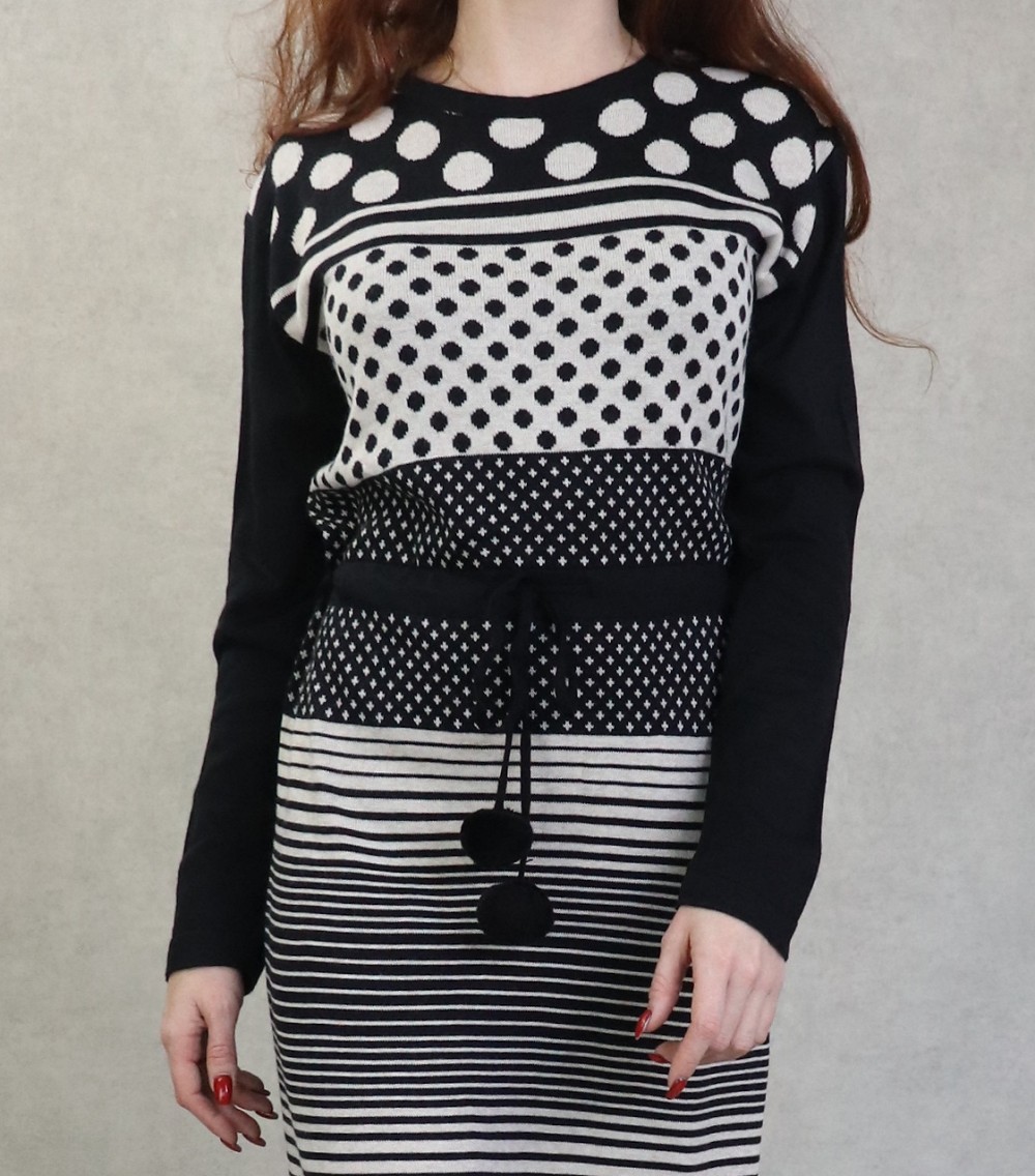 Robe en maille à rayures pour femme avec pompon (Vetement Automne-Hiver) - Couleur Noir et Crème - REF. 34028 (29.00 €)