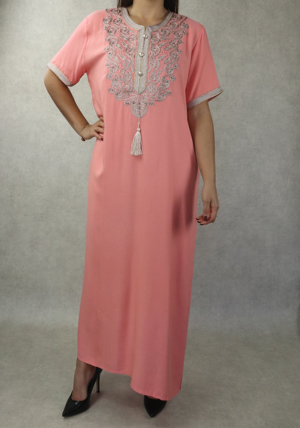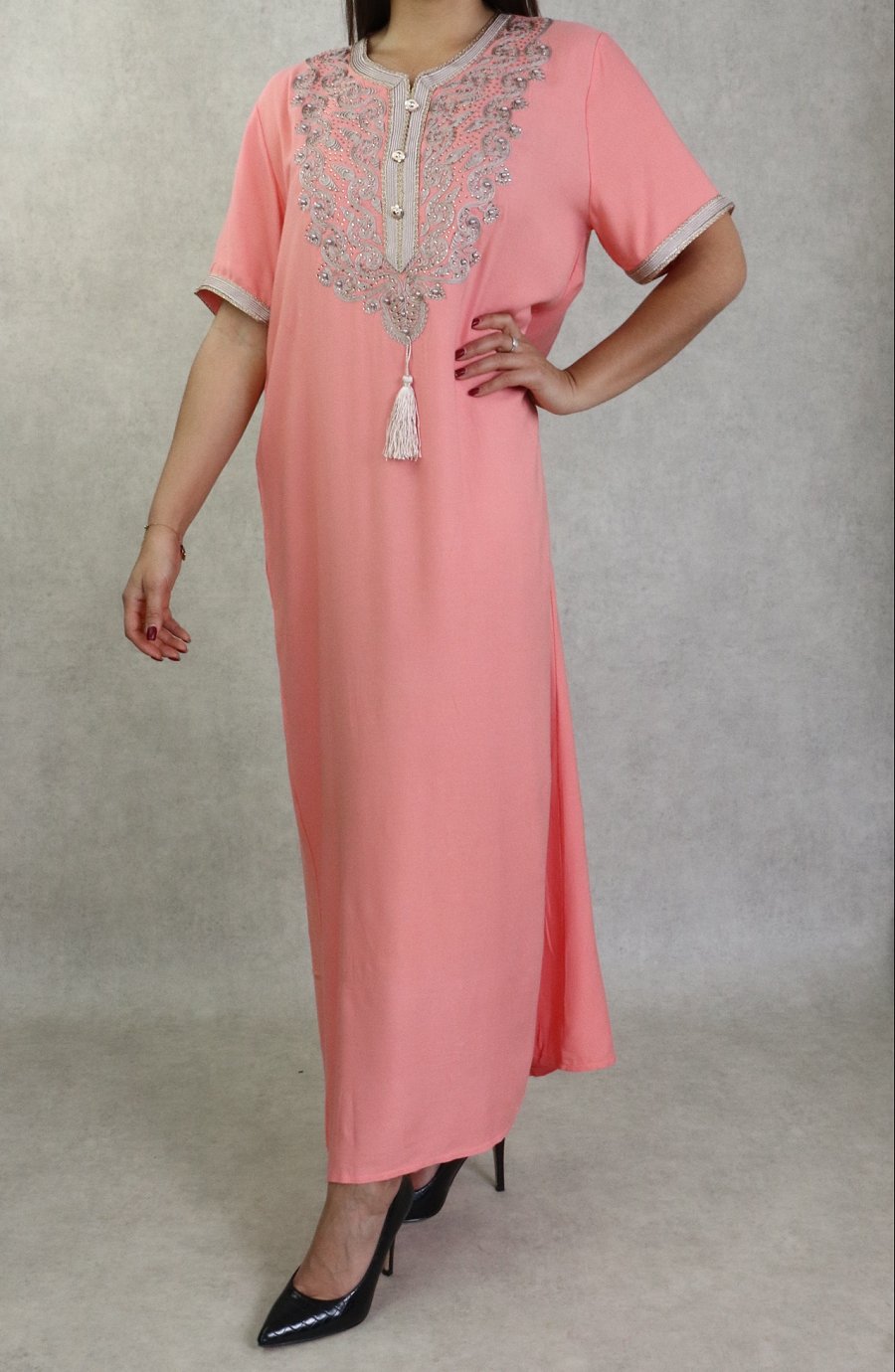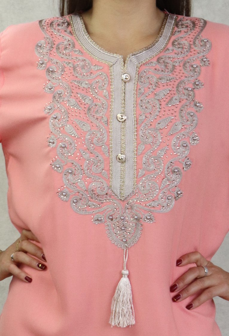 Robe femme style oriental brodée avec perles à manches courtes - Couleur rose saumon Vetement & Accessoire