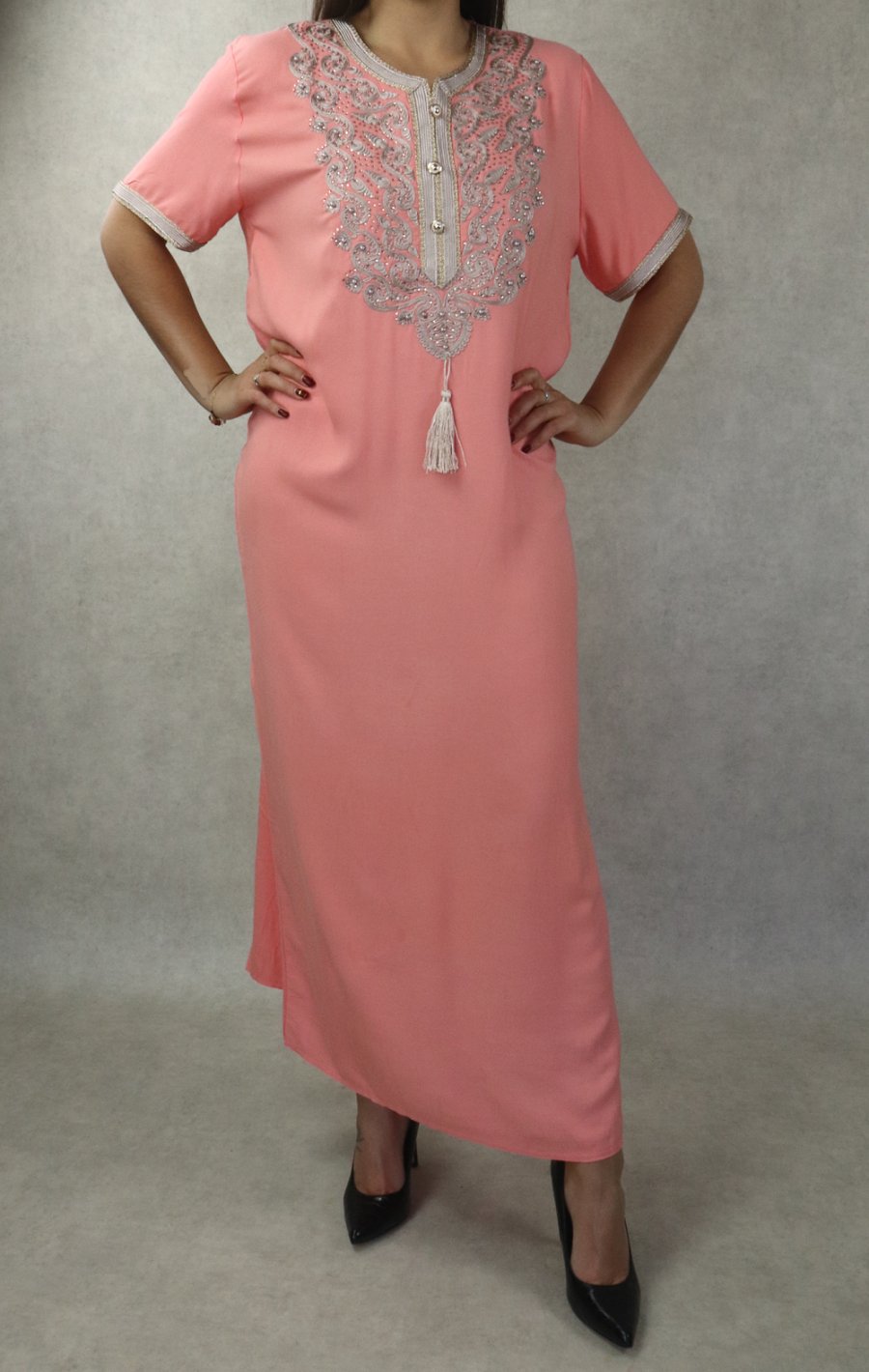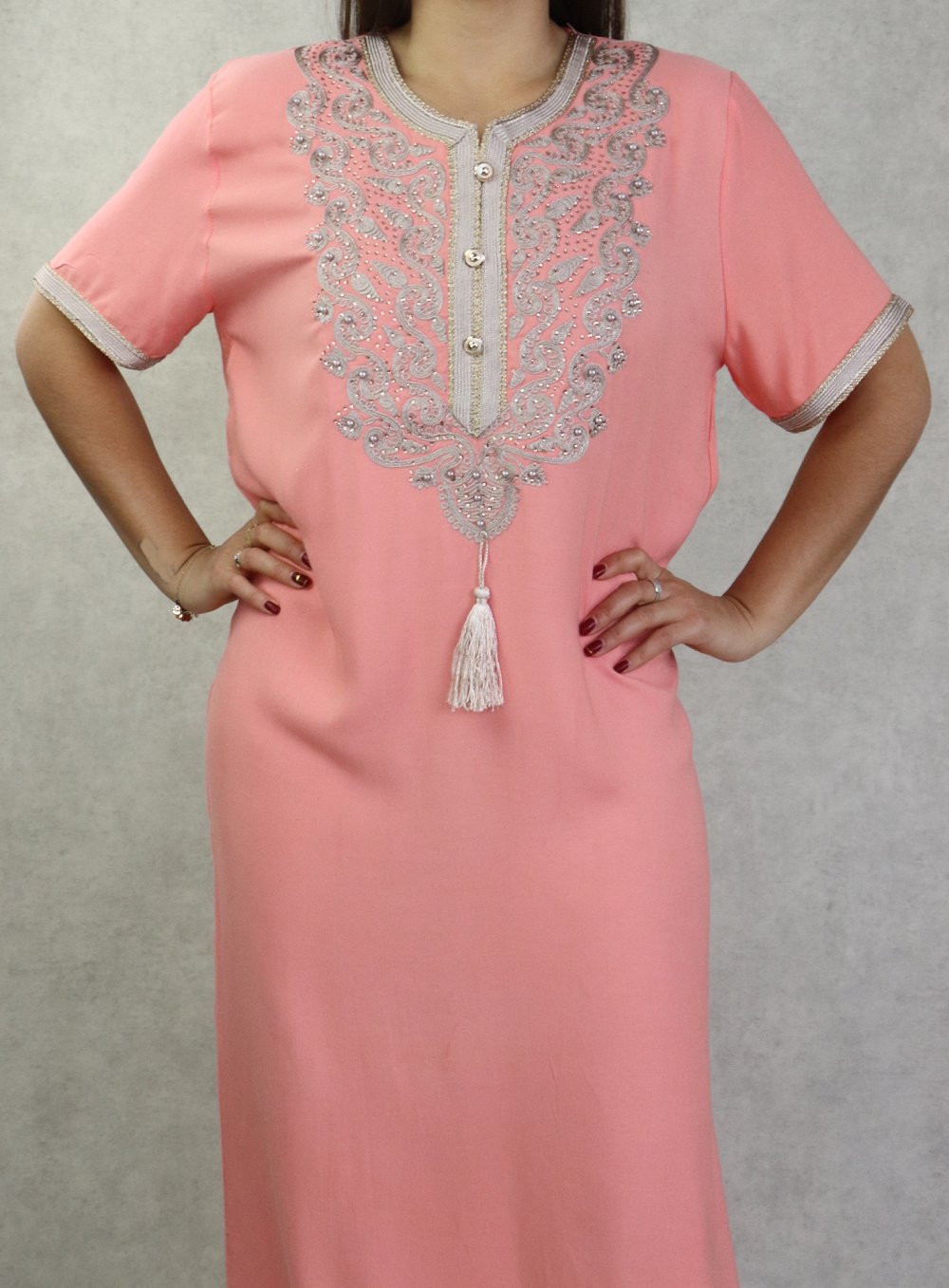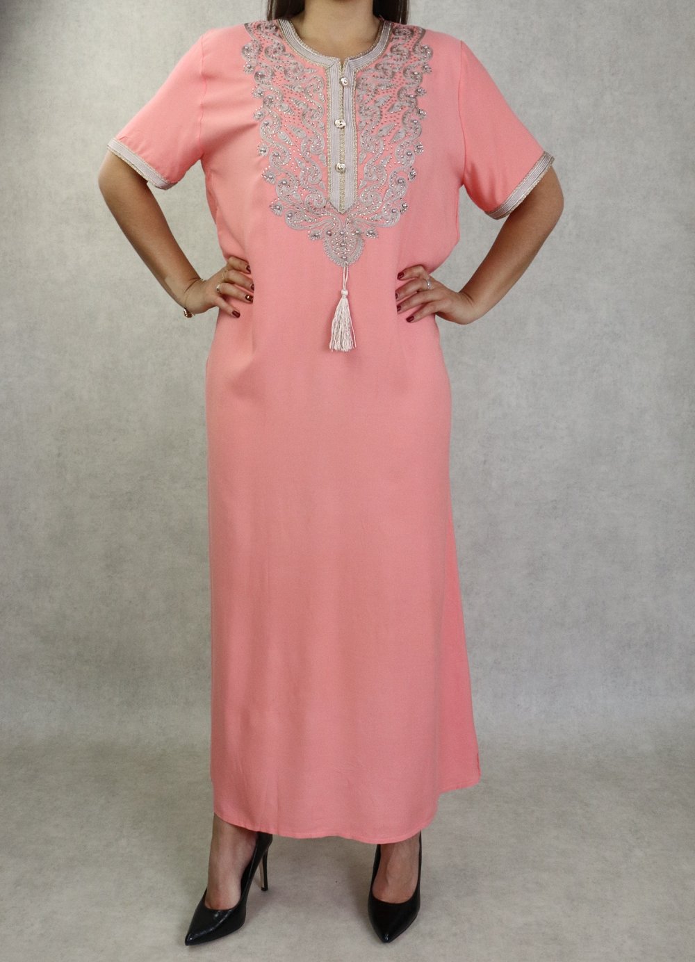 Robe femme style oriental brodée avec perles à manches courtes - Couleur rose saumon Vetement & Accessoire