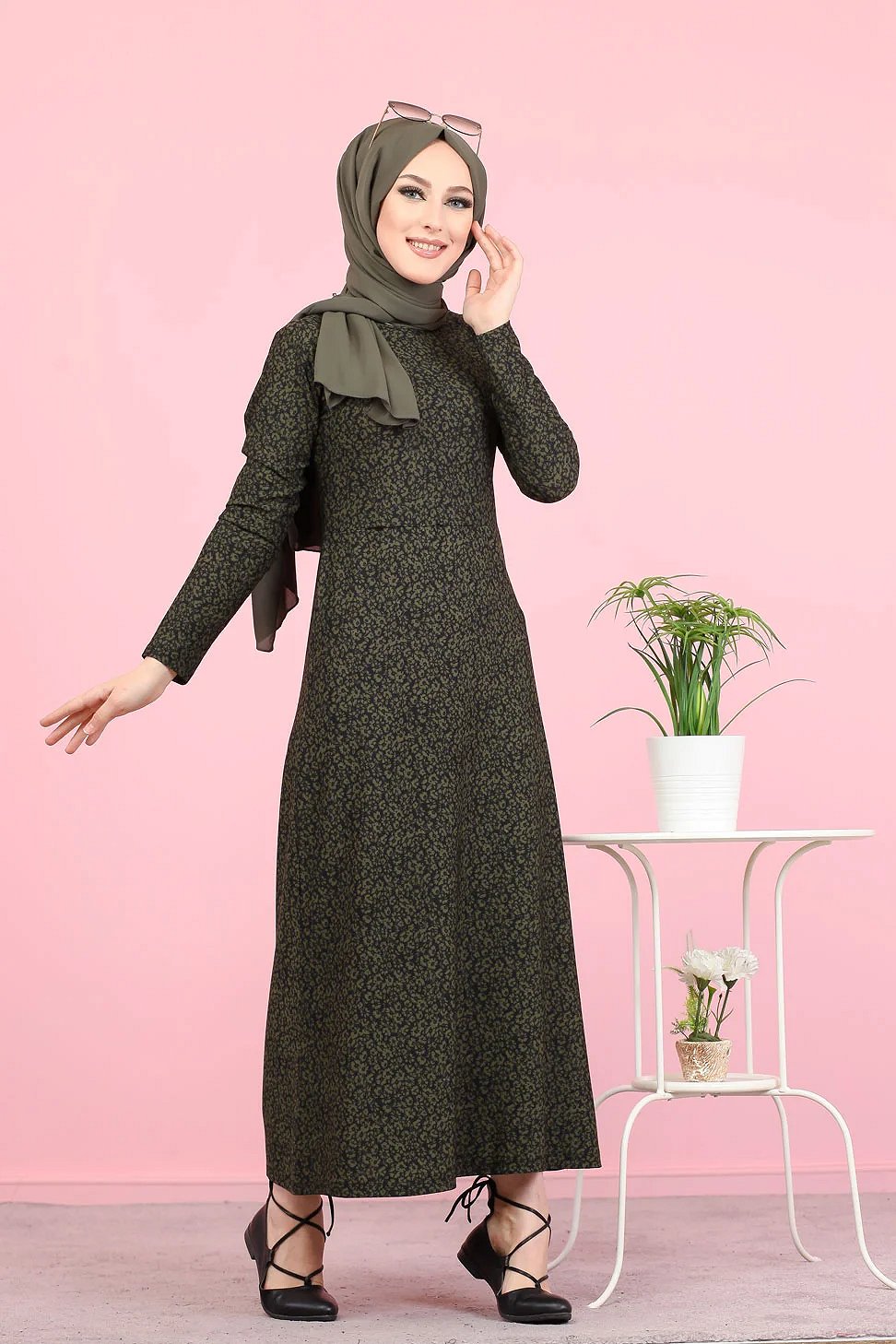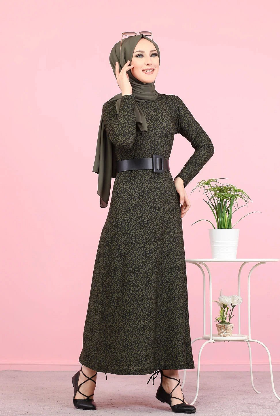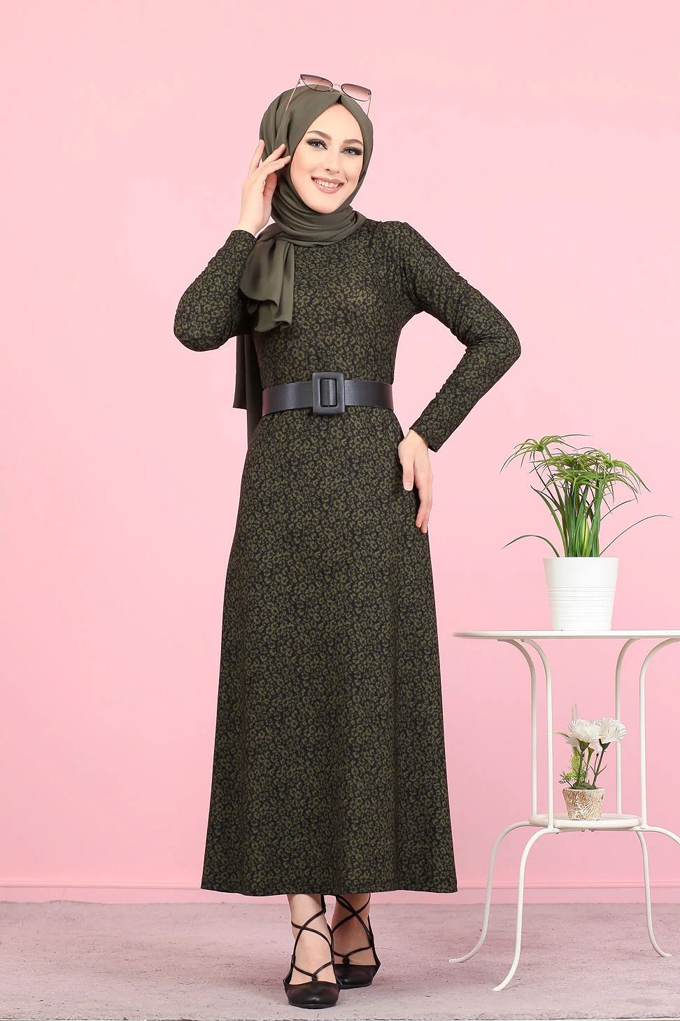 Robe longue légèrement cintrée à la taille, col rond, manches longues. (ceinture non fournie)