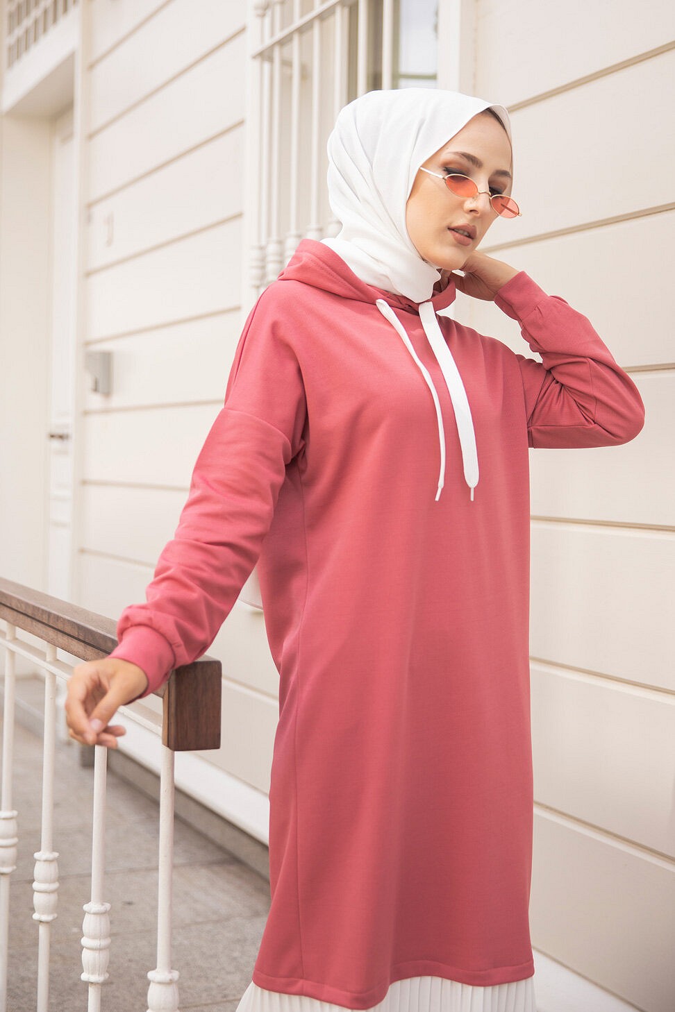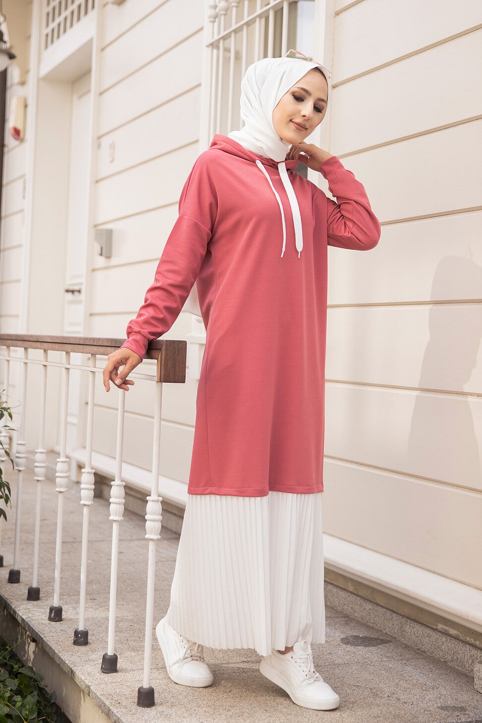 Robe longue a capuche effet plissee pour femme musulmane (Vetement moderne pour hijab) - Couleur rose et blanc