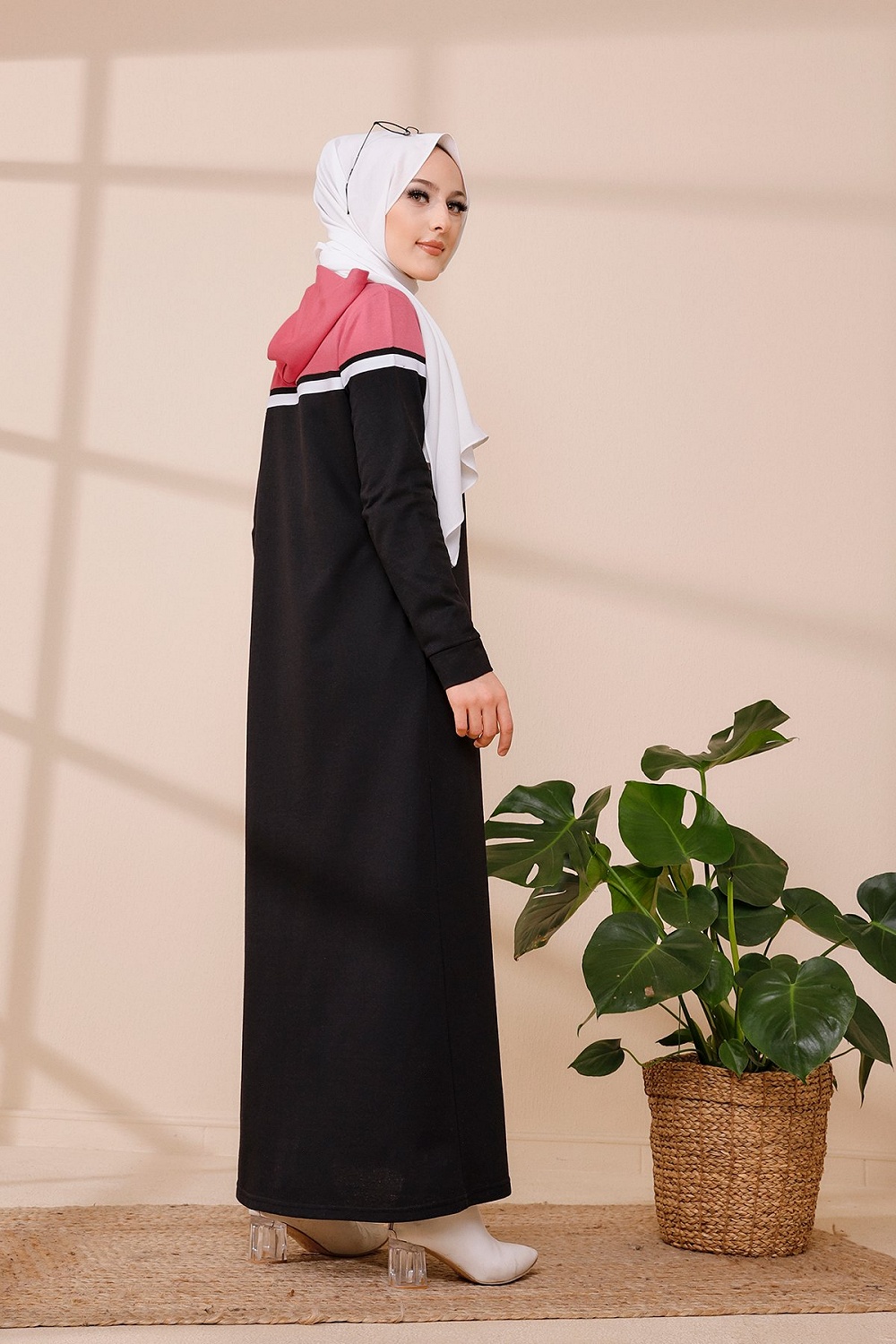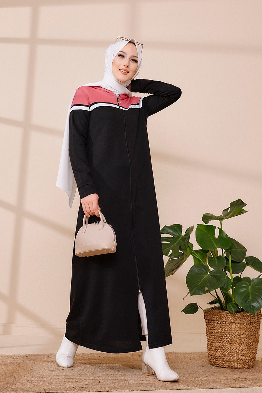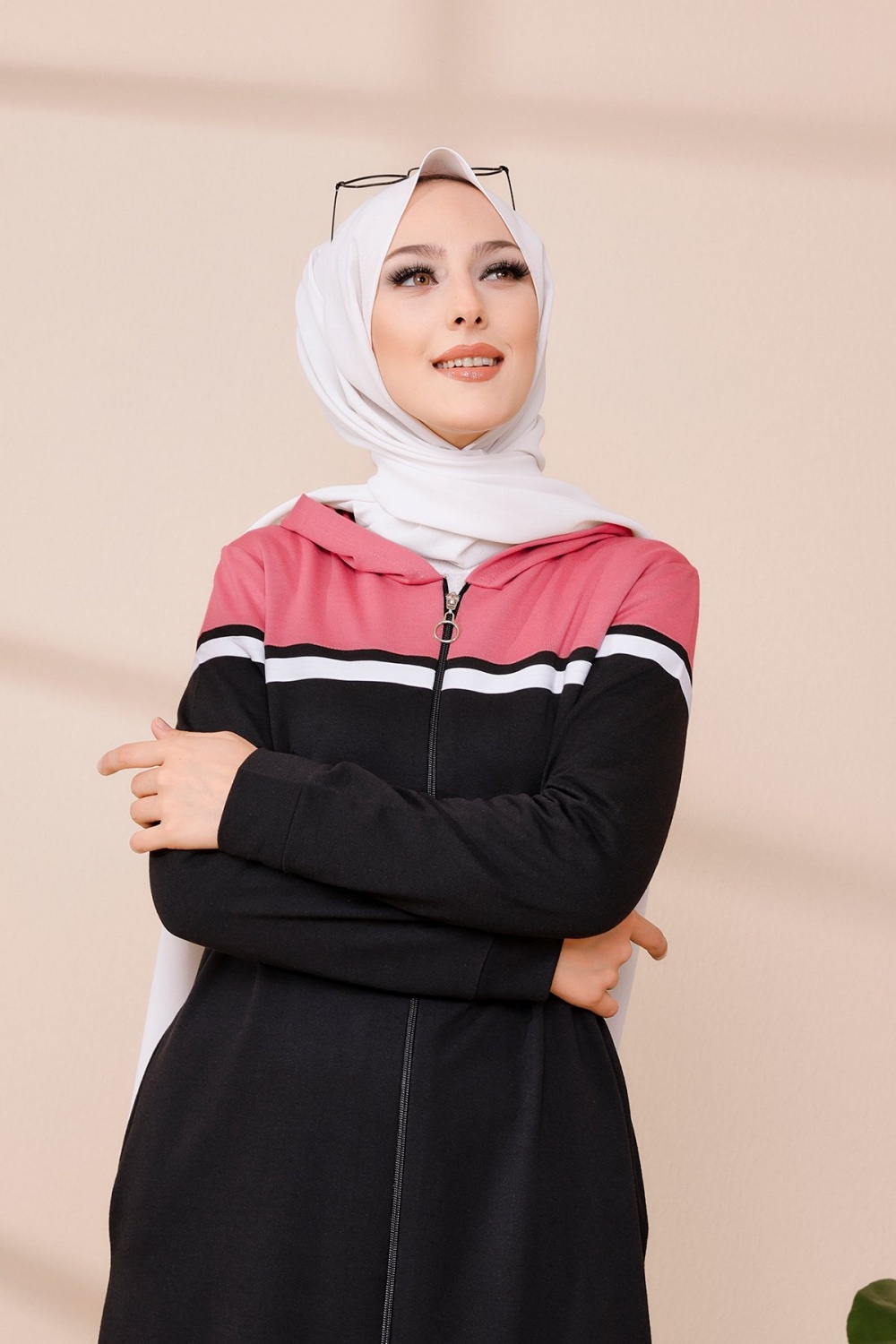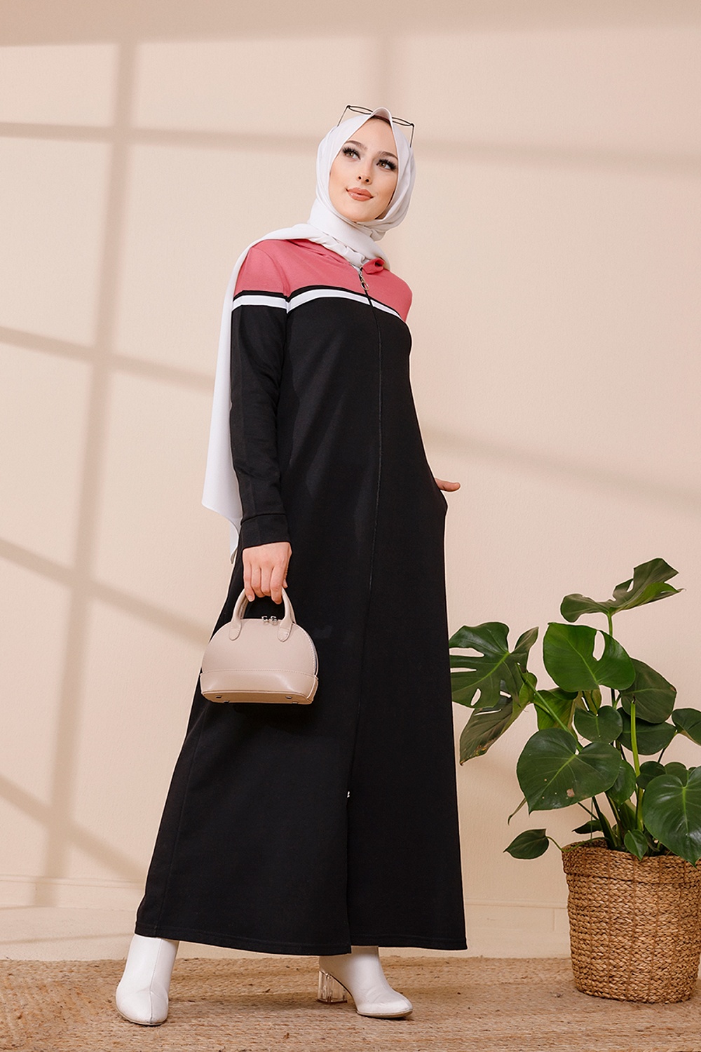 Robe longue a capuche fermeture zip pour femme (Vetement Hijab style moderne) - Couleur noir et rose