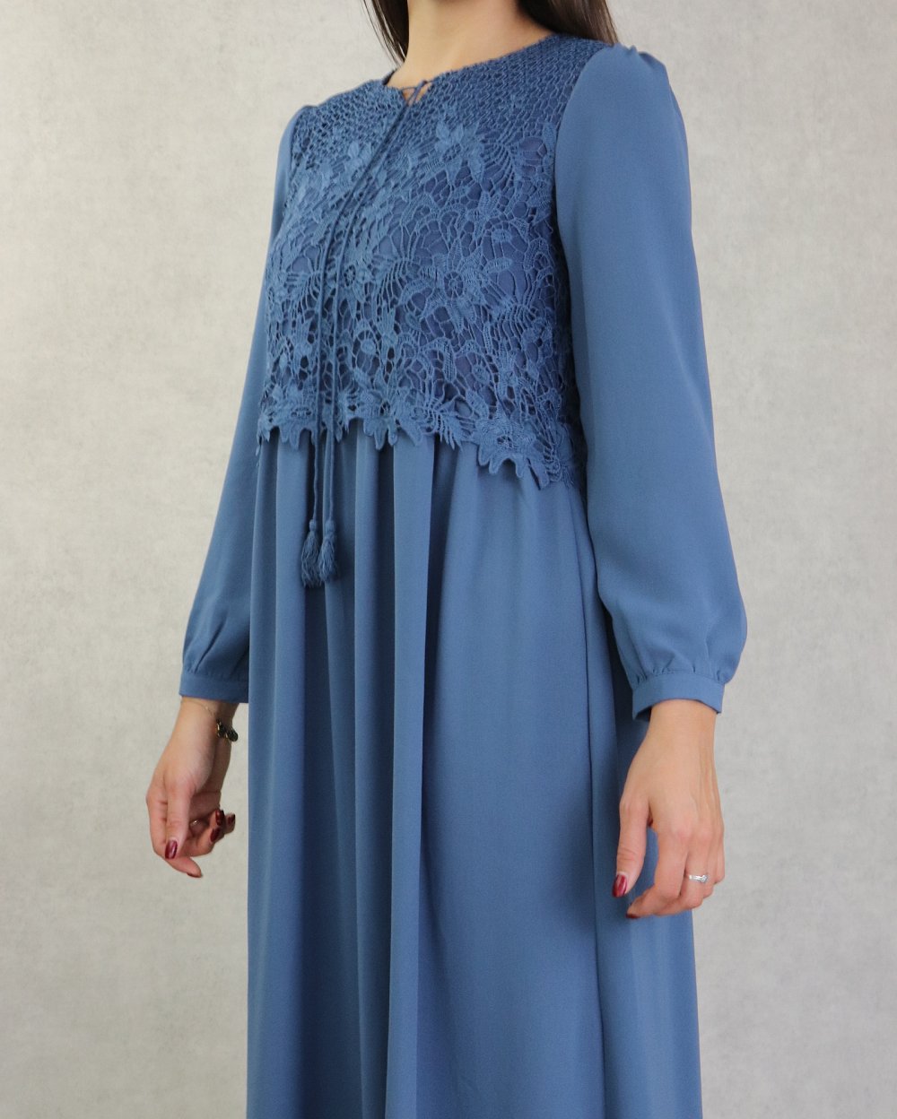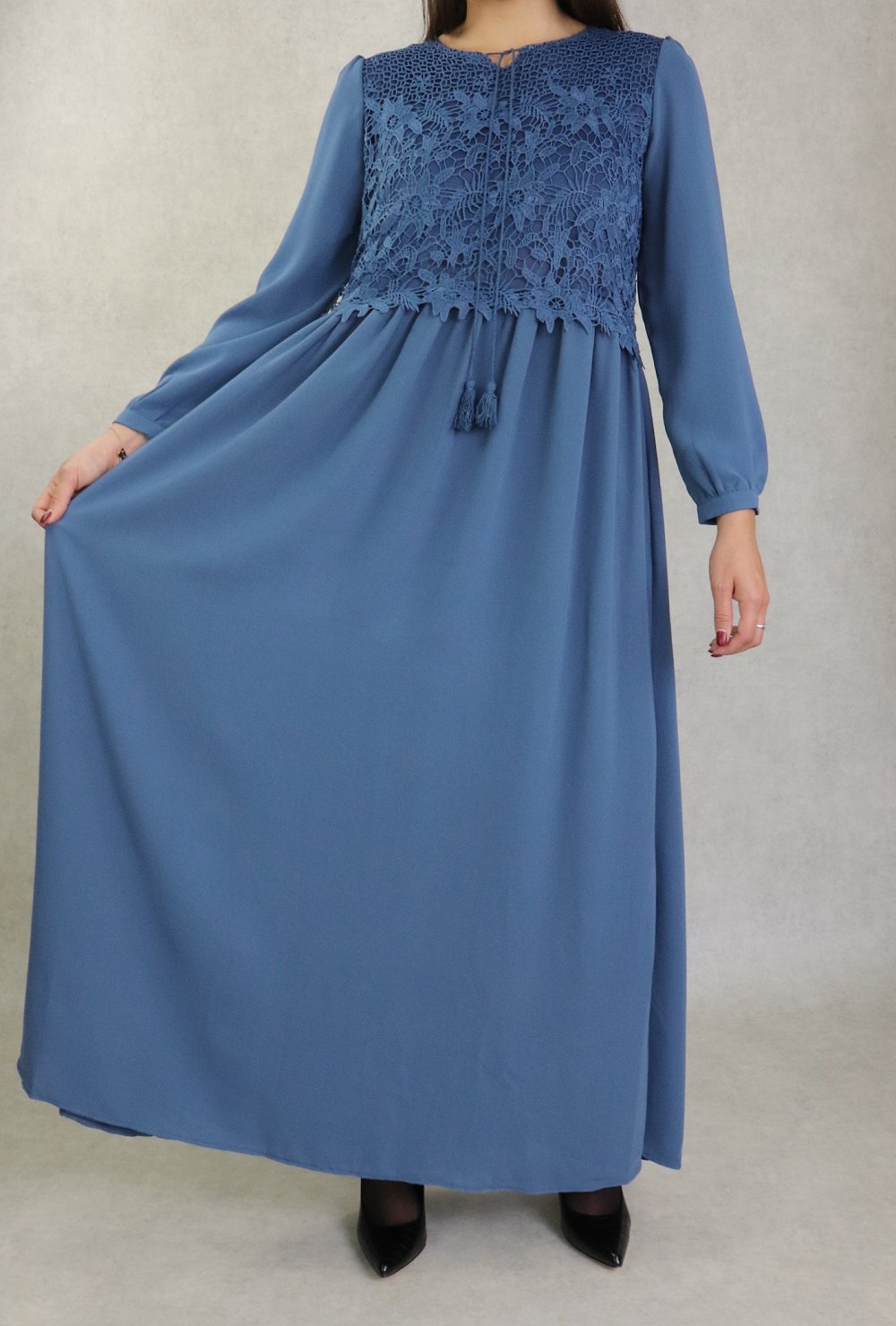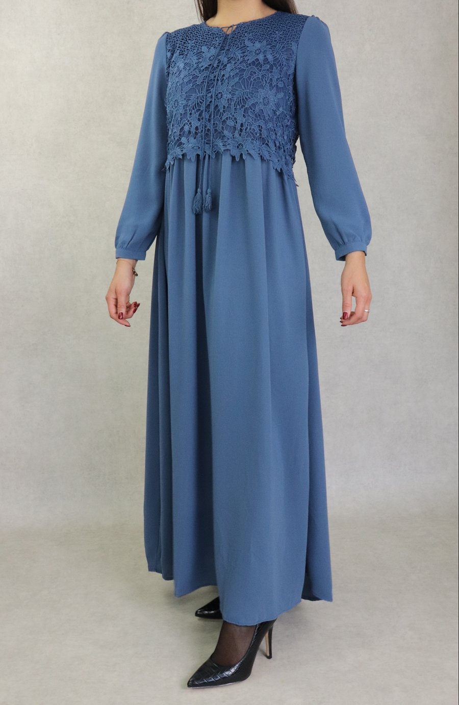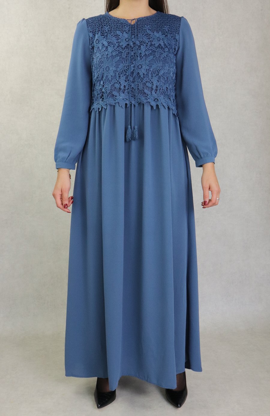 Robe longue a dentelles doublee pour femme - Couleur bleu acier