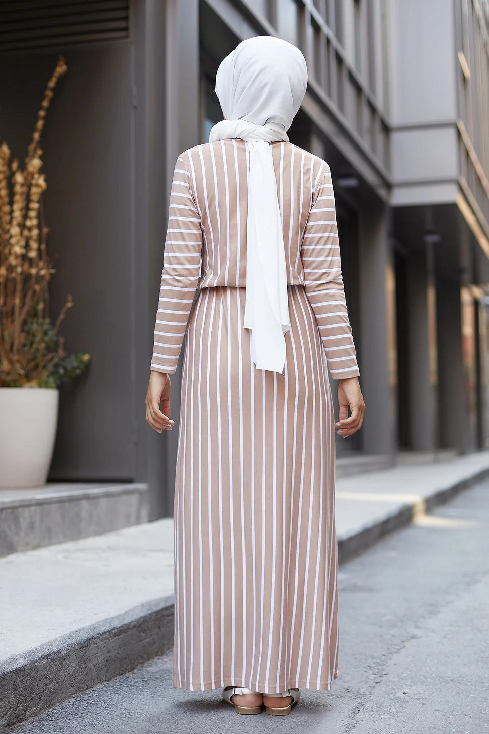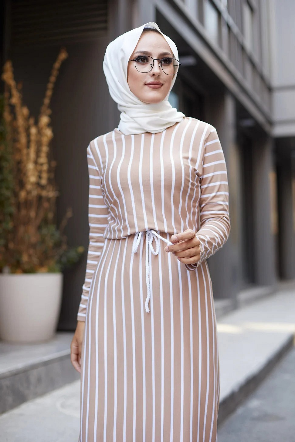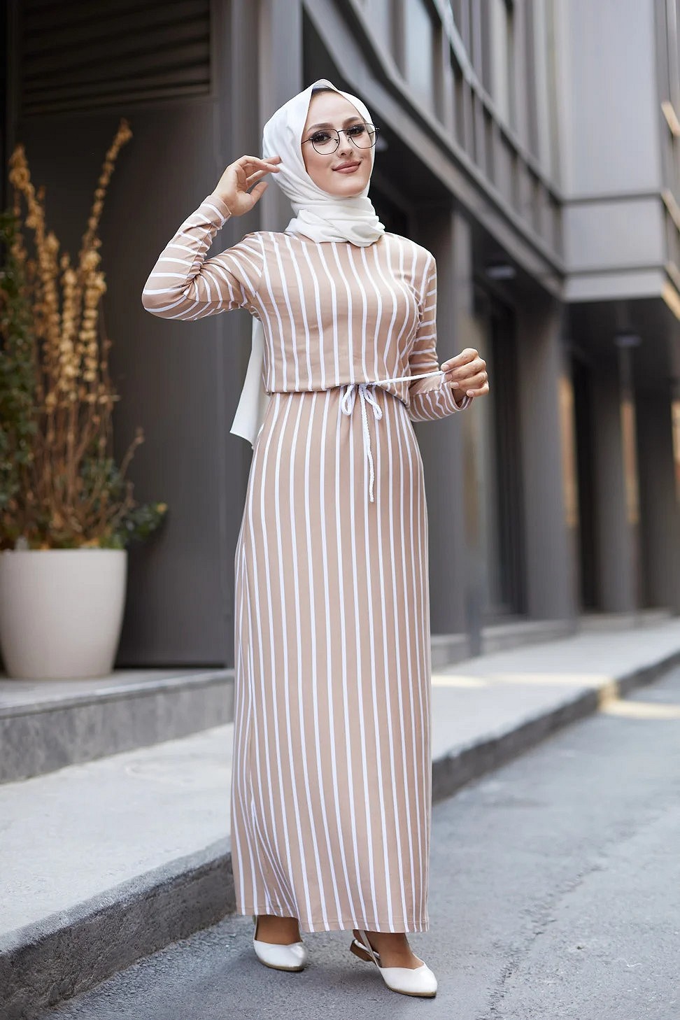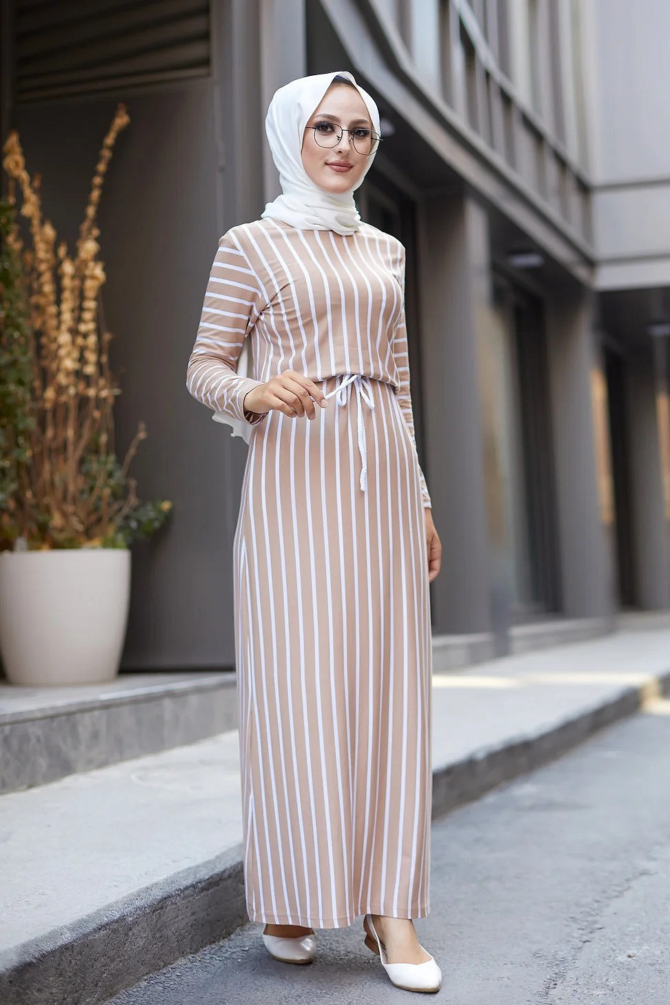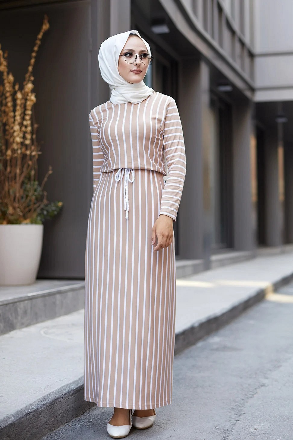 Robe longue a rayures ceinture integree (Vetement femme voilee) - Couleur Beige