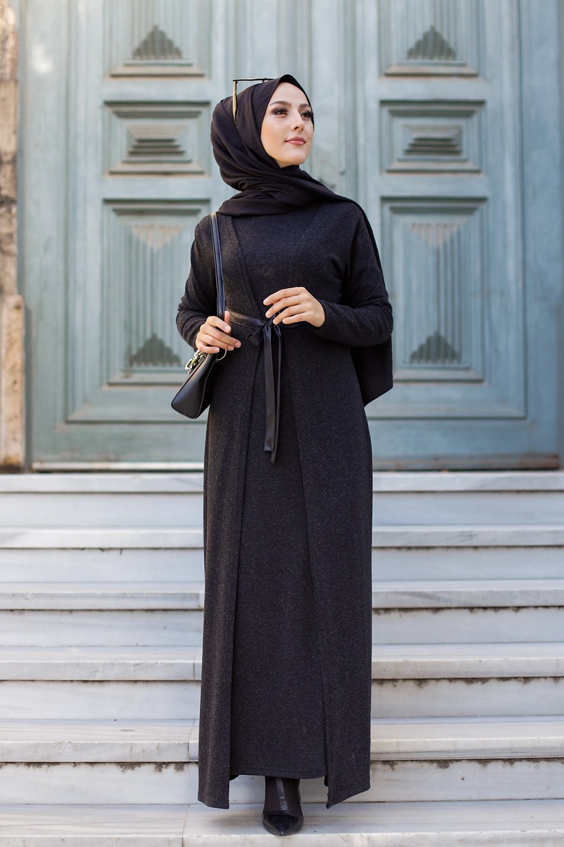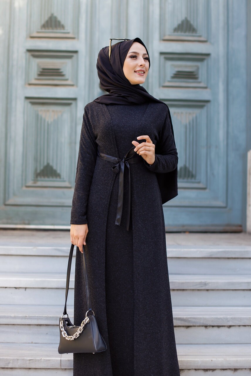 Robe longue avec gilet intégré (Abaya et Kimono cousus ensemble) - Couleur noir Vetement & Accessoire