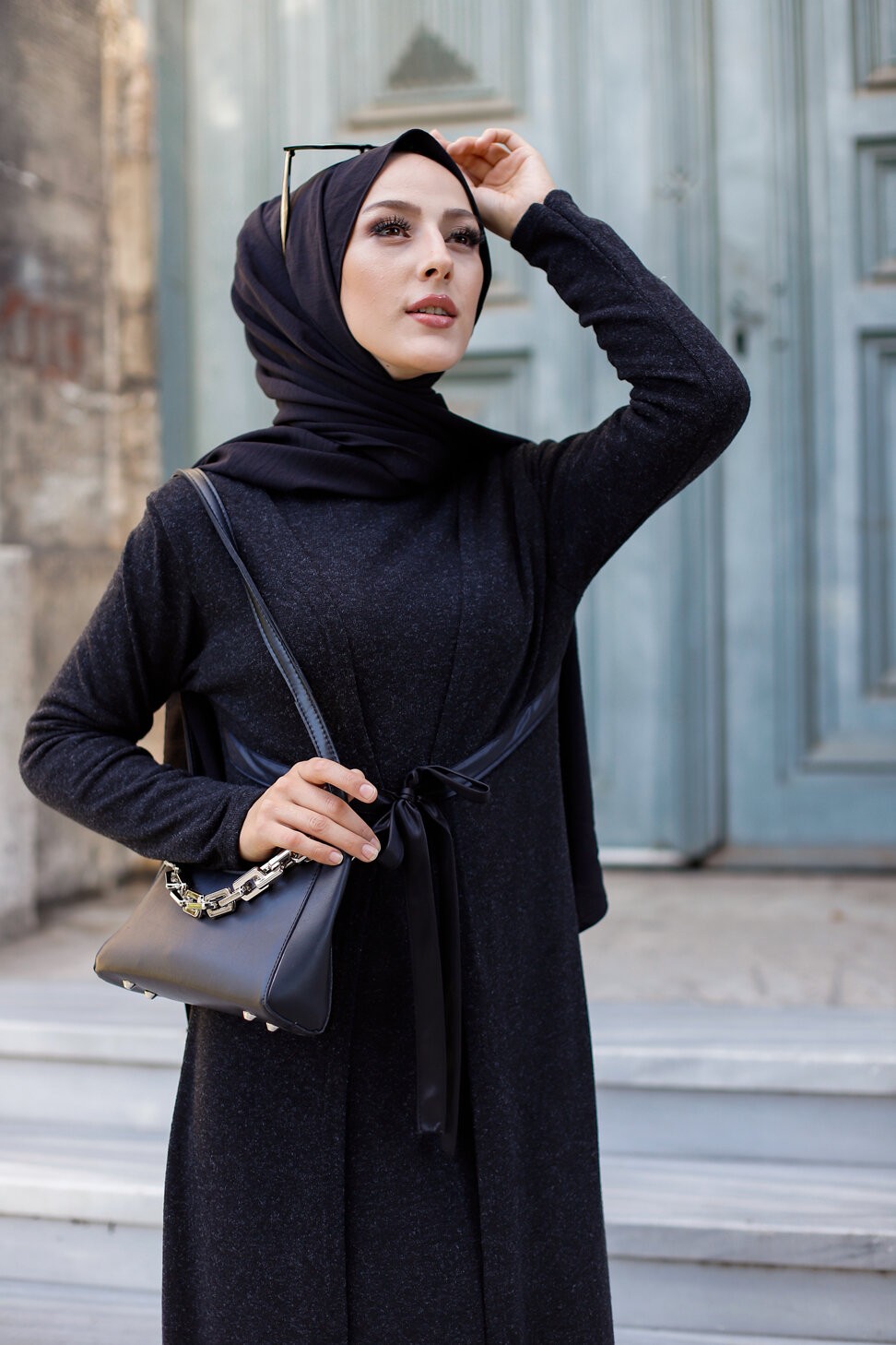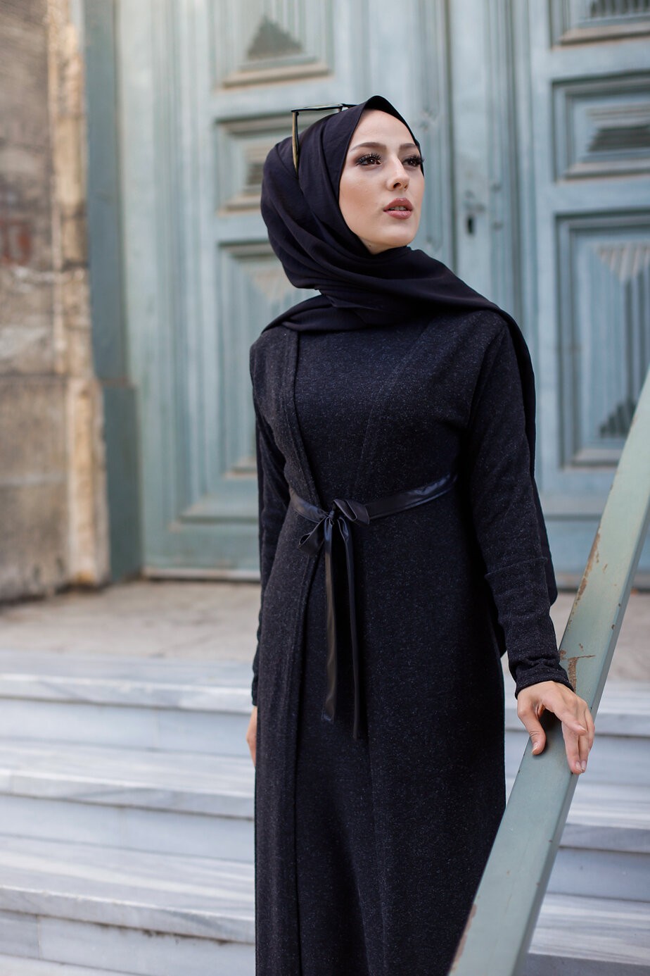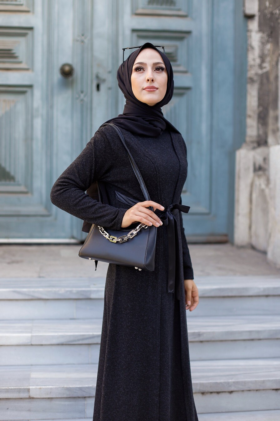 Robe-Chemise longue boutonnée avec ceinture de couleur noir (Vêtement moderne turque pour femme musulmane) - REF. 33360 (29.90 €)