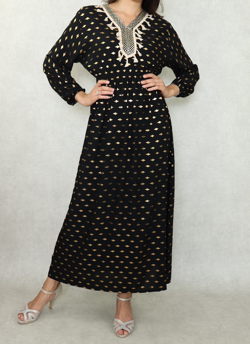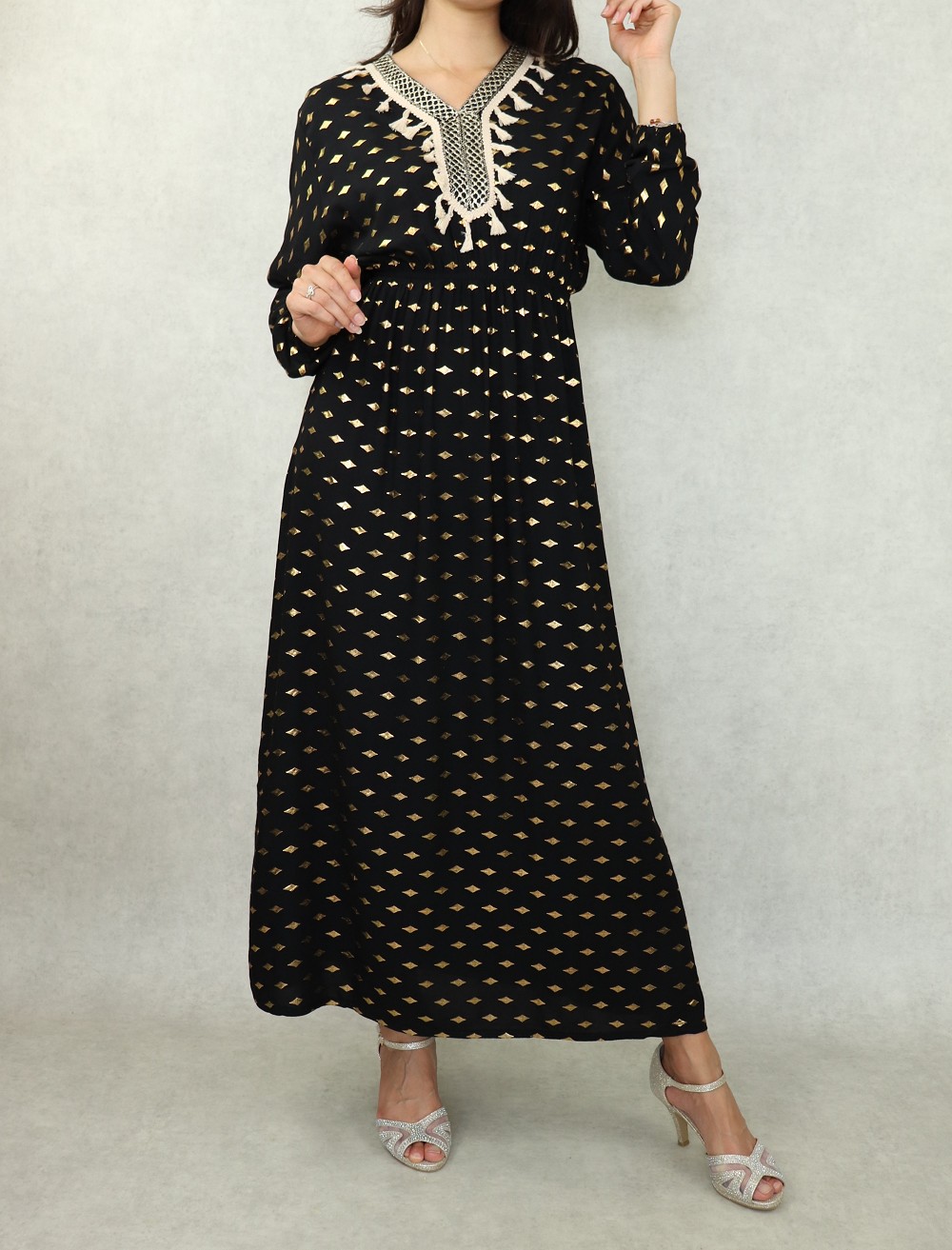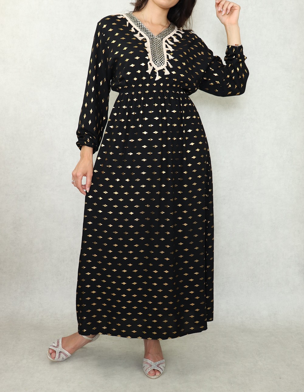 Robe longue, col en V, manches longues, poignets élastiques. Motifs dorés, coupe évasée, taille cintrée et élastique, matière légère et fluide, tissu majorité coton.