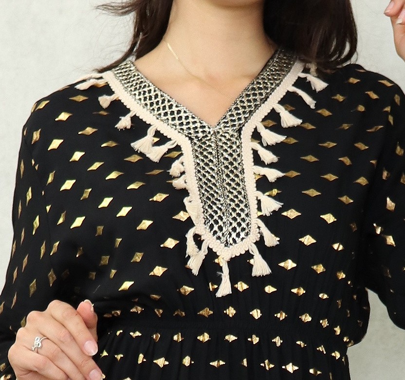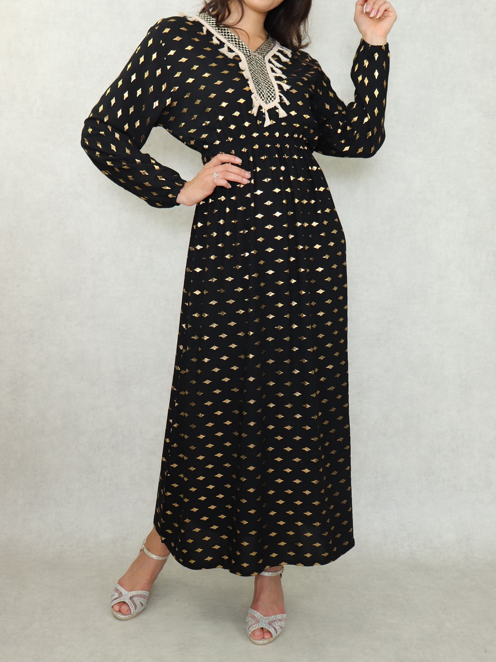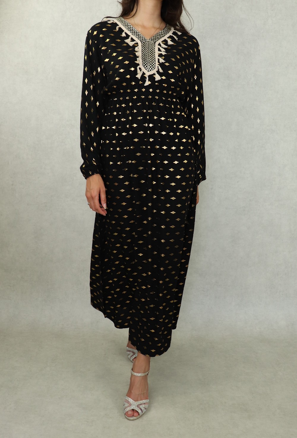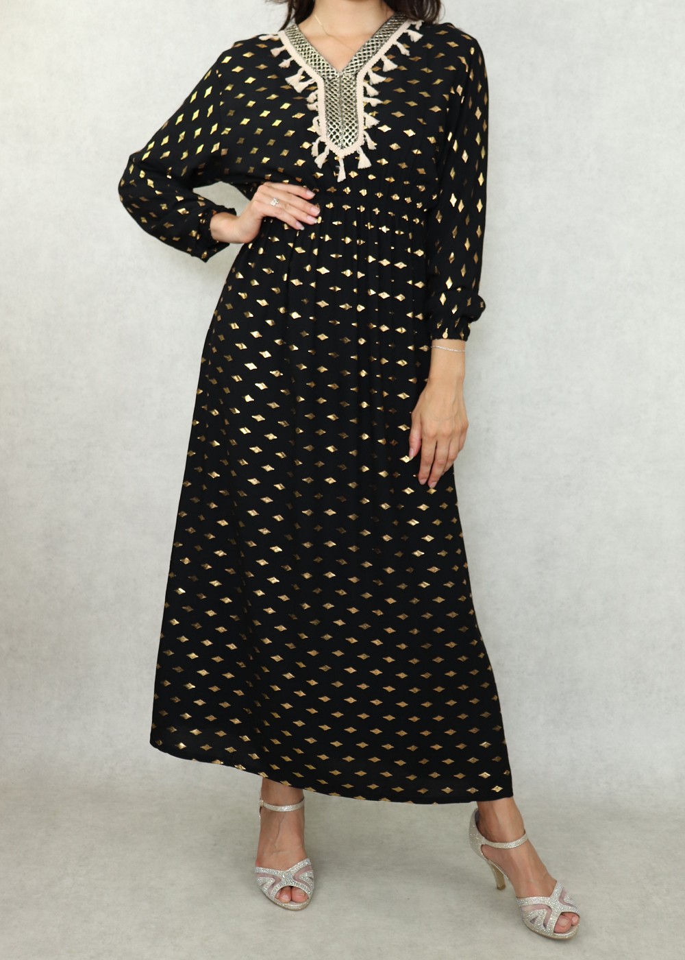 Robe longue, col en V, manches longues, poignets élastiques. Motifs dorés, coupe évasée, taille cintrée et élastique, matière légère et fluide, tissu majorité coton.
