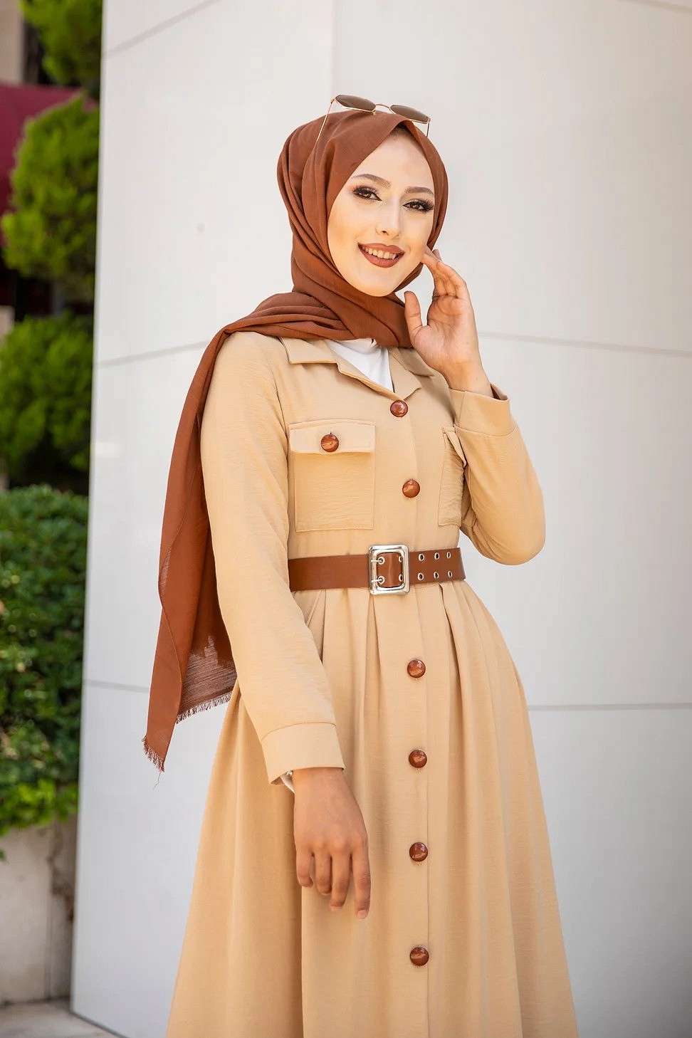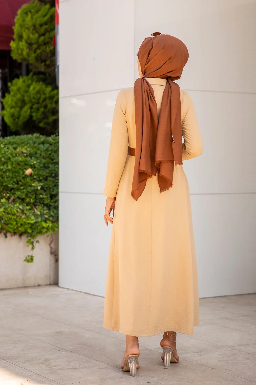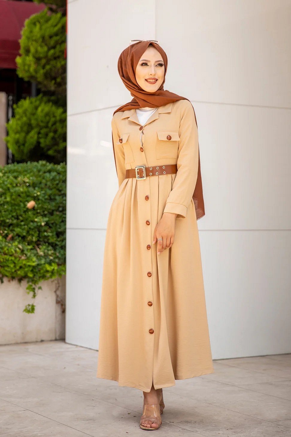 Robe longue casual boutonnee avec sa ceinture pour femme (Vetement hijab chic) - Couleur Beige