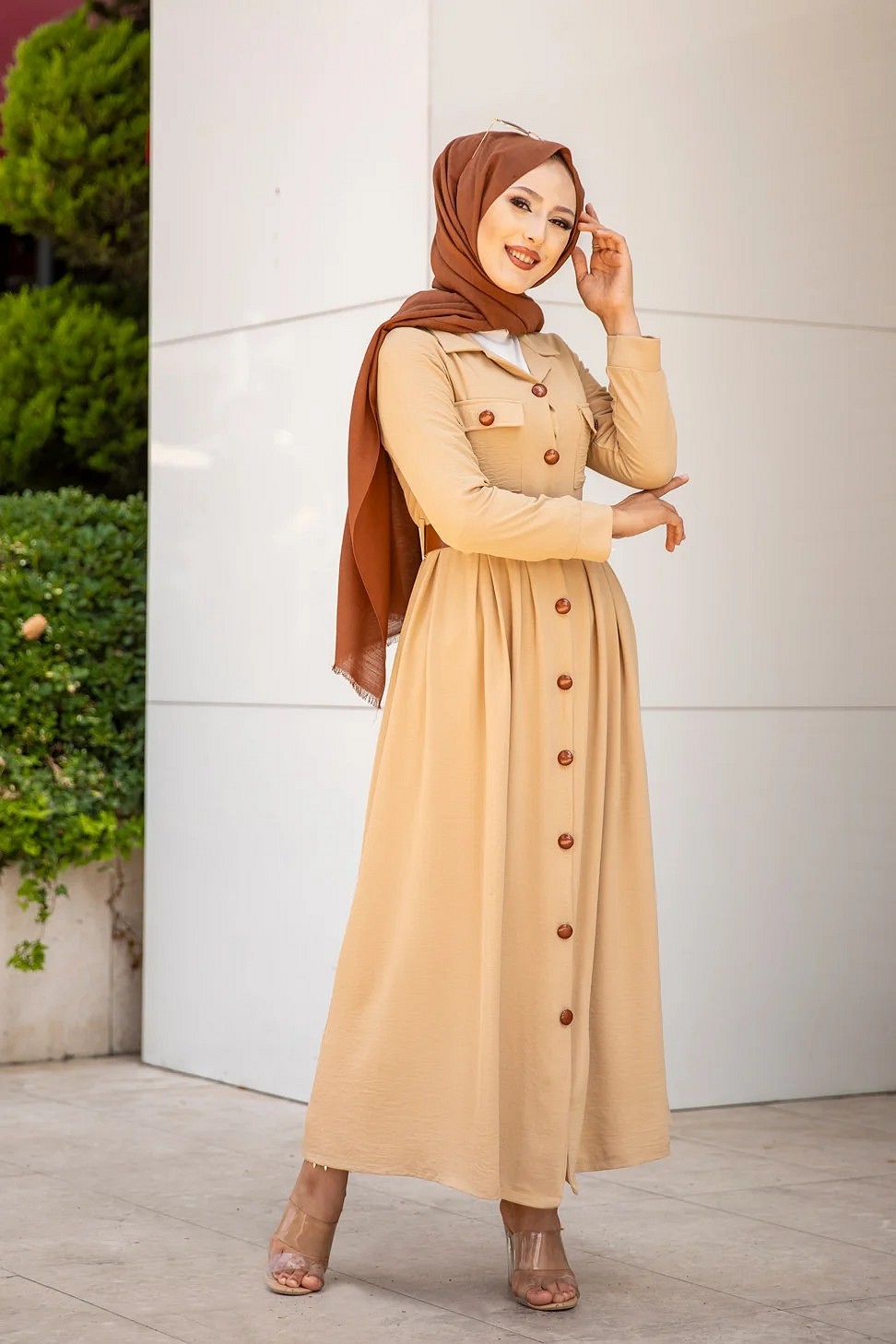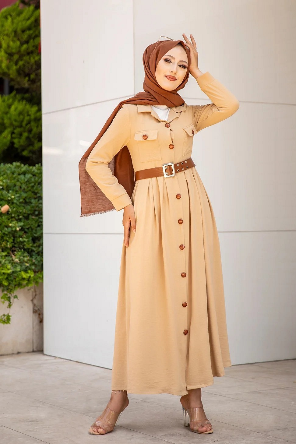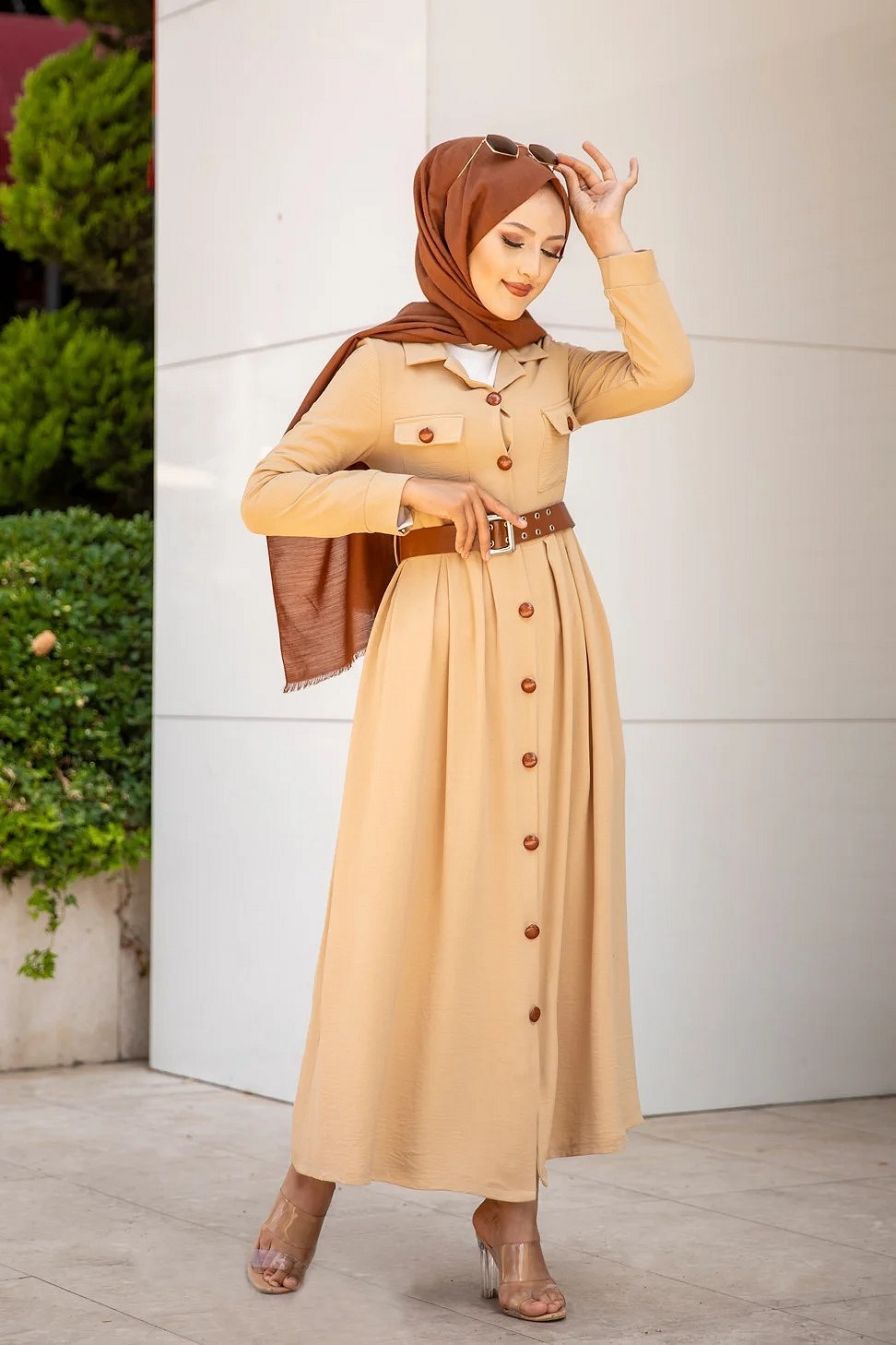 Robe longue casual boutonnee avec sa ceinture pour femme (Vetement hijab chic) - Couleur Beige