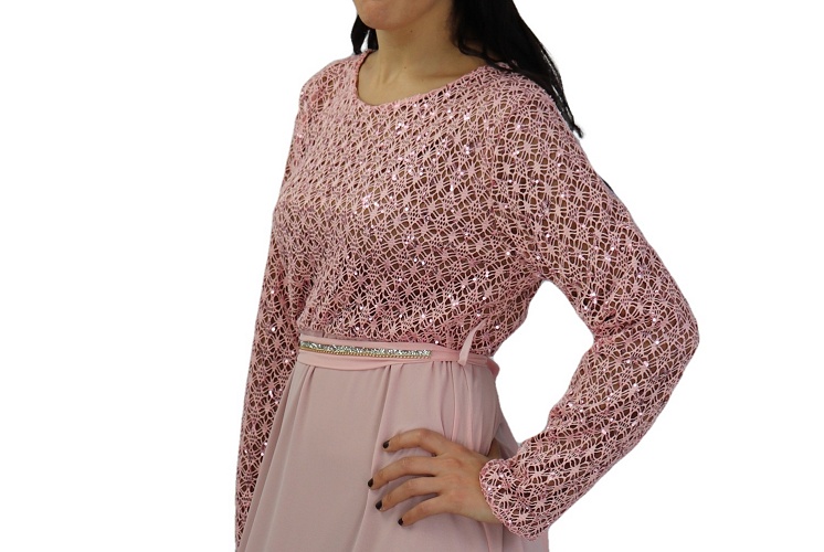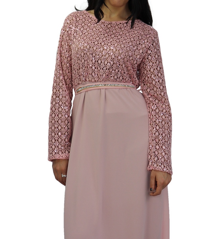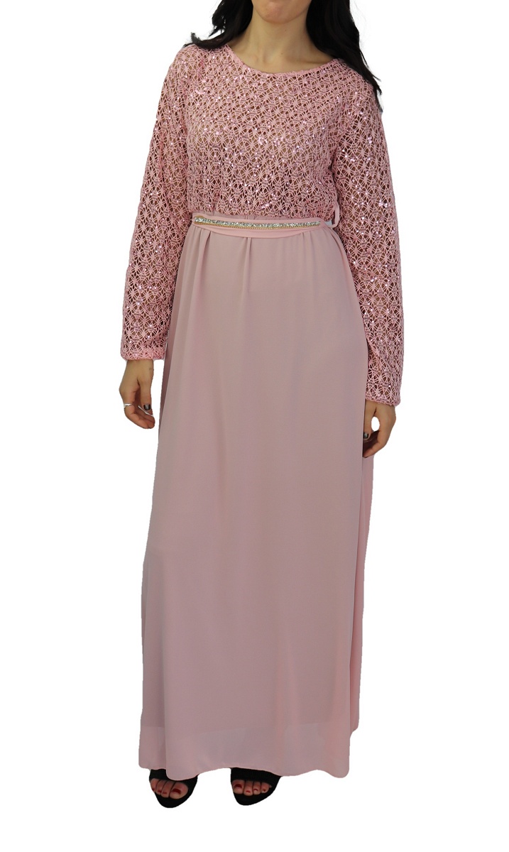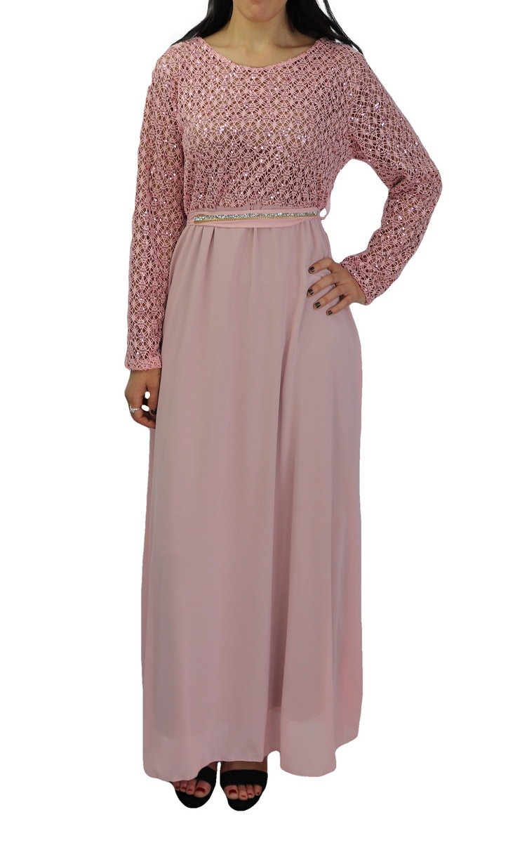 Robe longue évasée de couleur Rose, pailletée sur la partie haute? entièrement doublée (de couleur marron). La partie basse est faite en mousseline. Livrée avec sa ceinture assortie décorée de strass argentés et de chaines dorées.