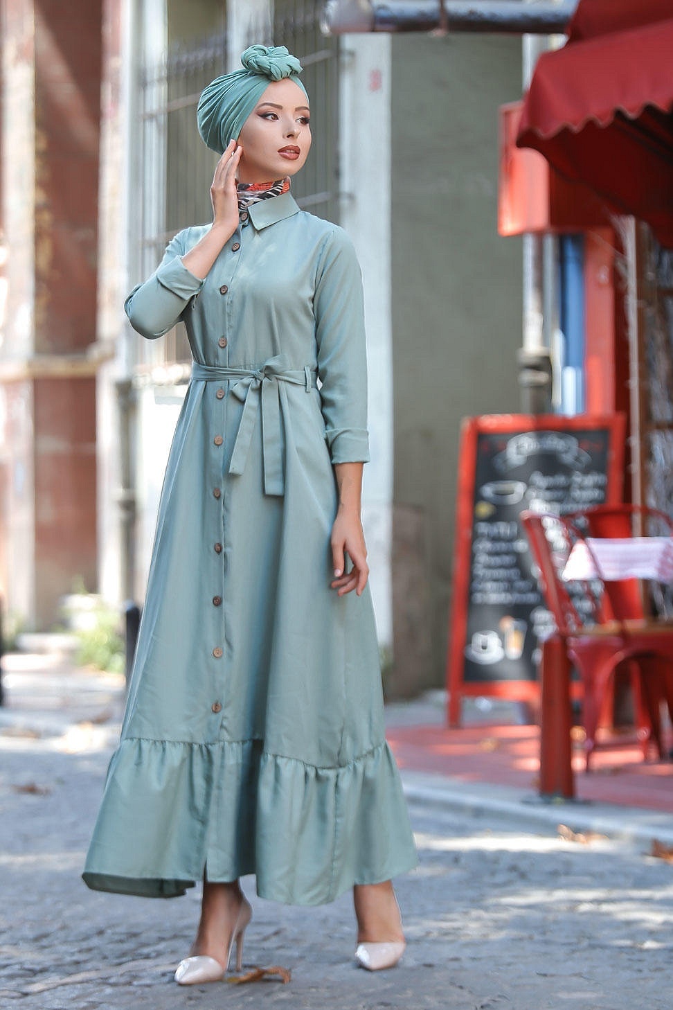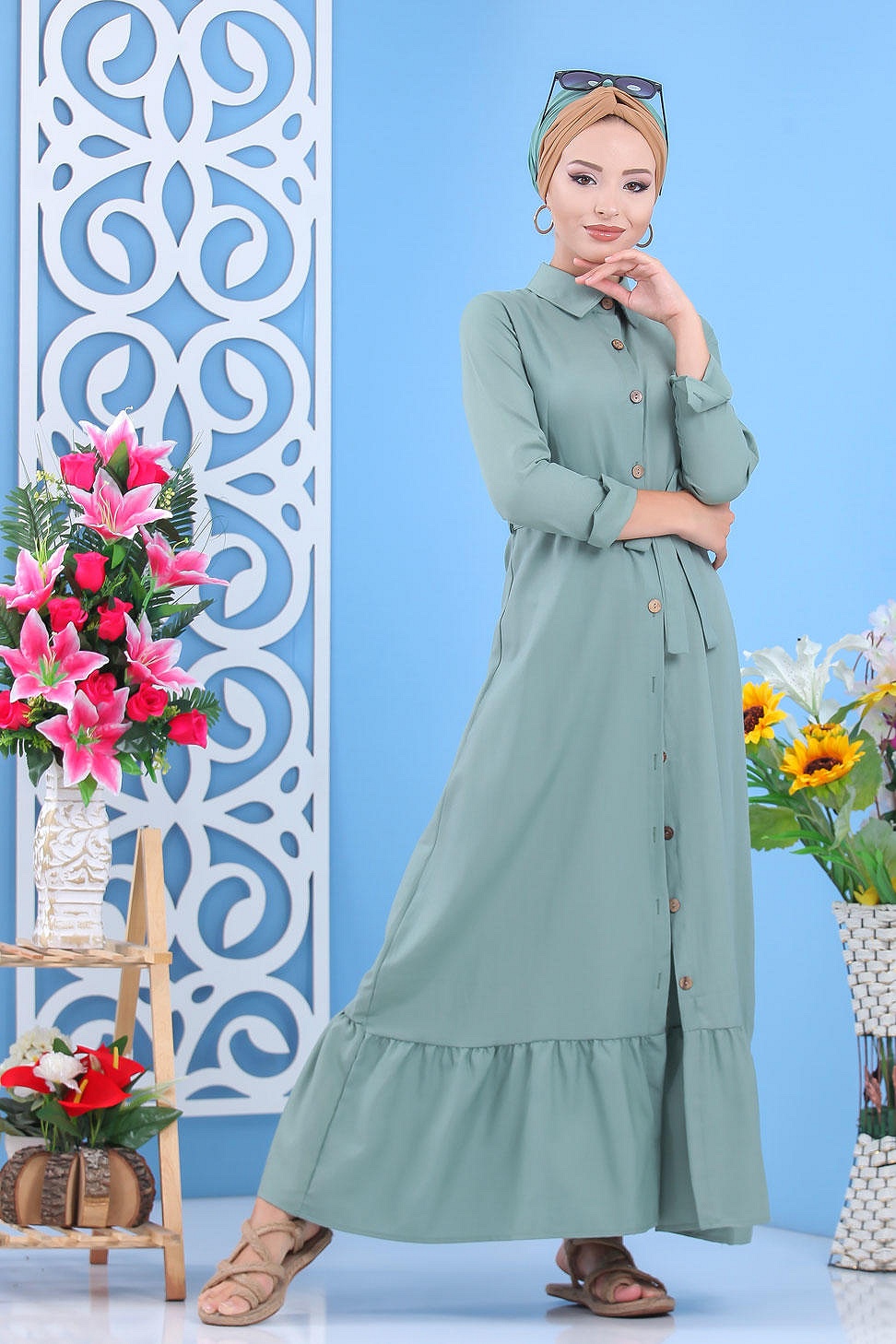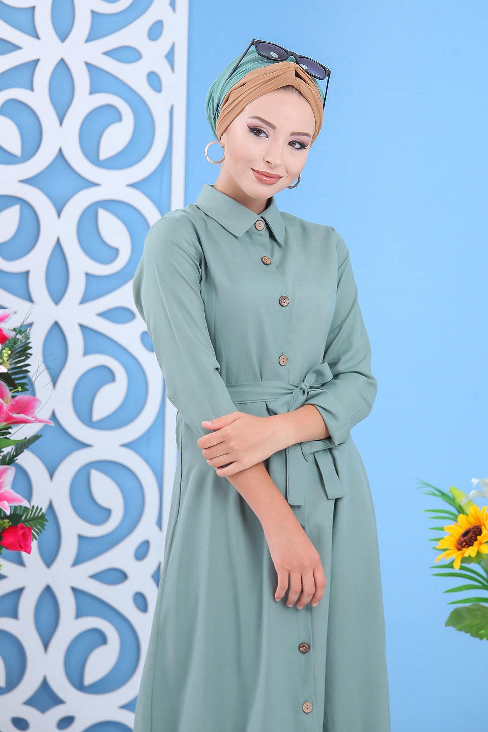 Robe longue de ville boutonnee avec ceinture pour femme - Couleur vert amande (Vetement chic turque en ligne)