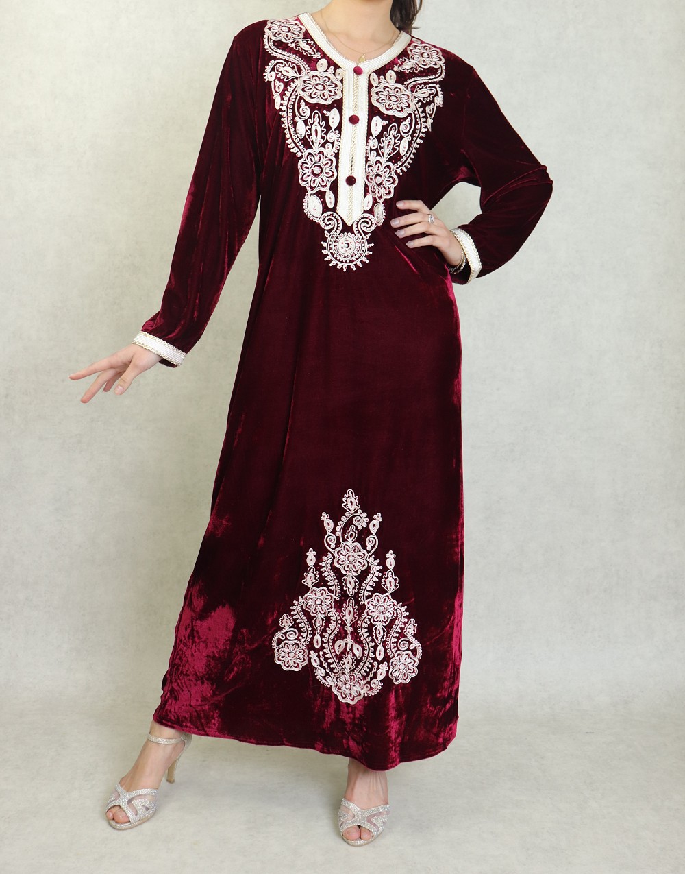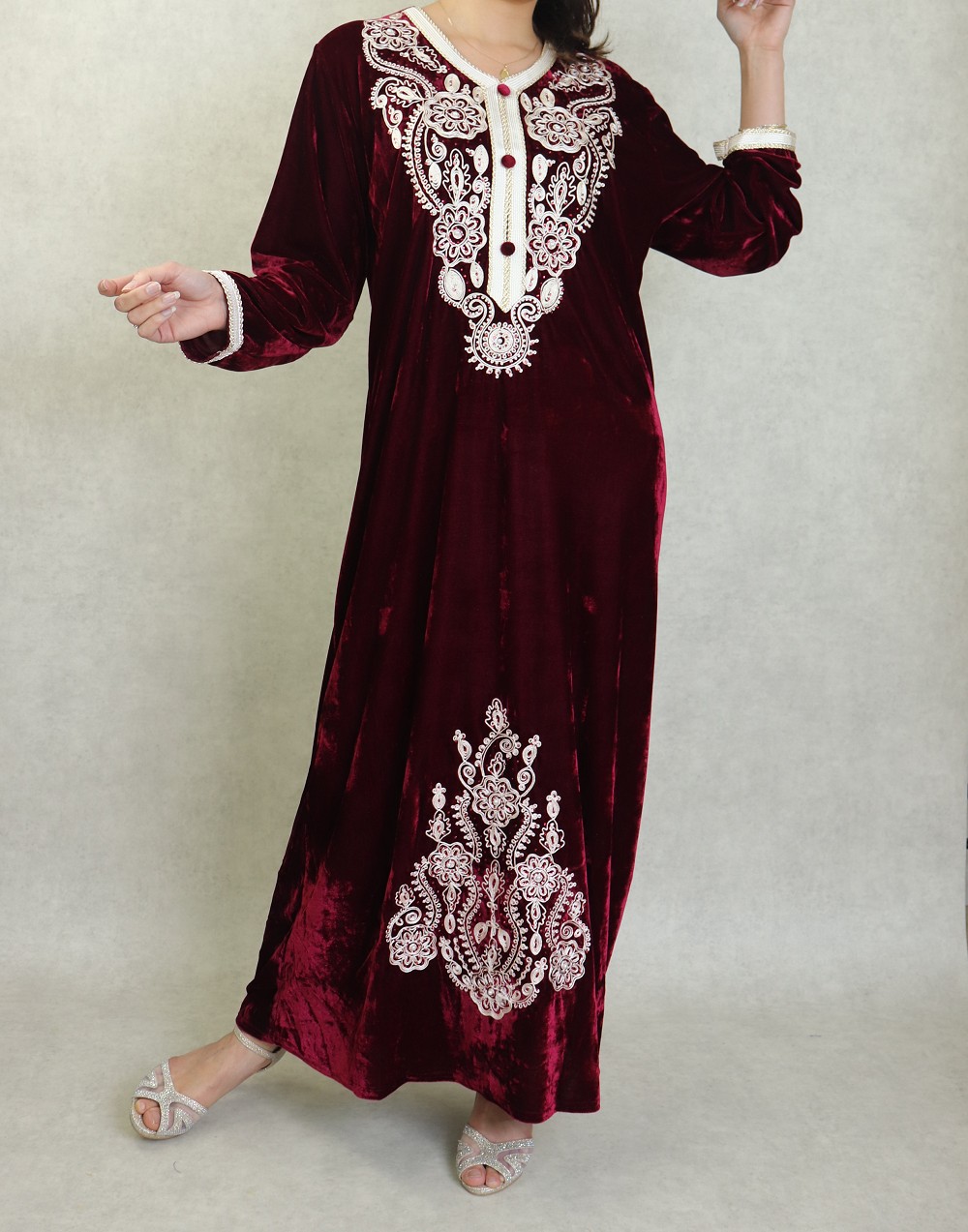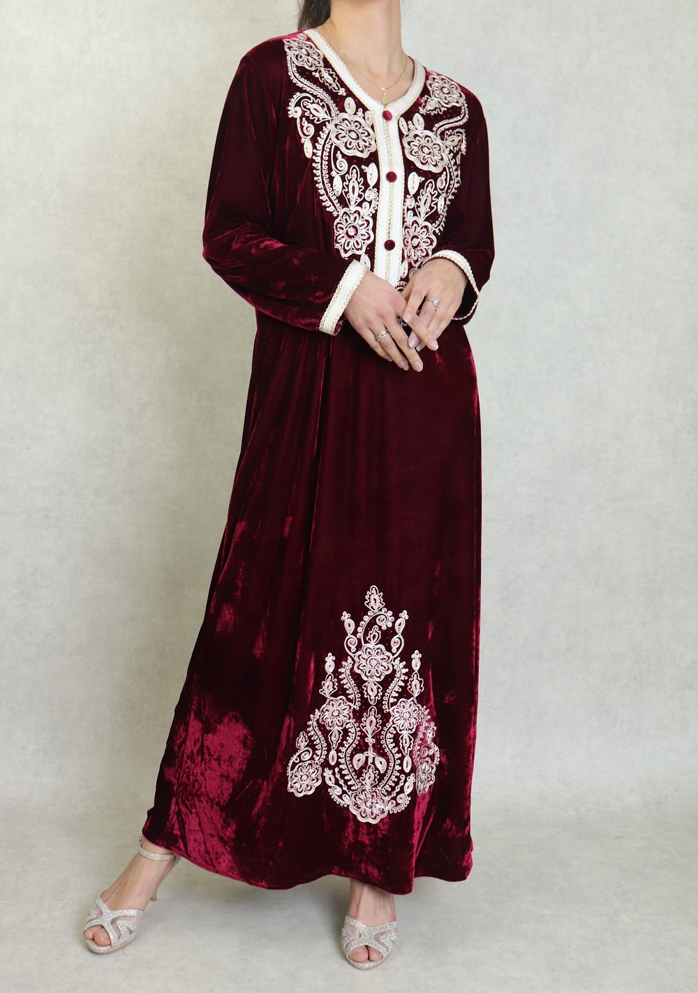 Robe longue effet velours avec broderies pour femme - Couleur Bordeaux Vetement & Accessoire