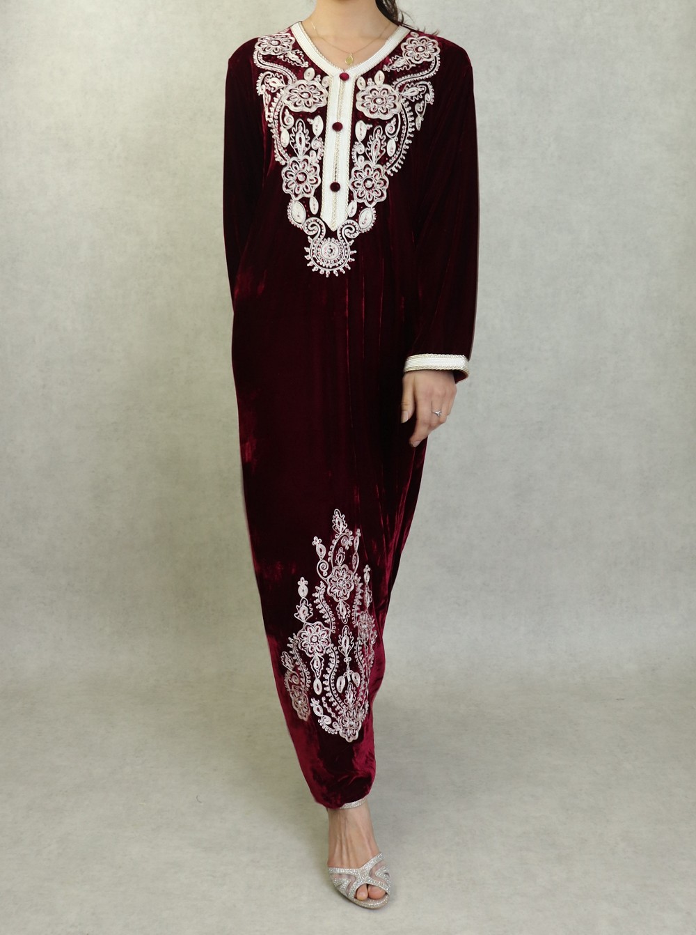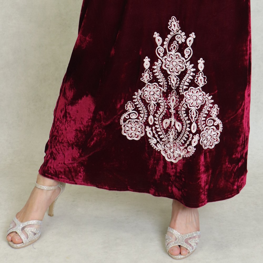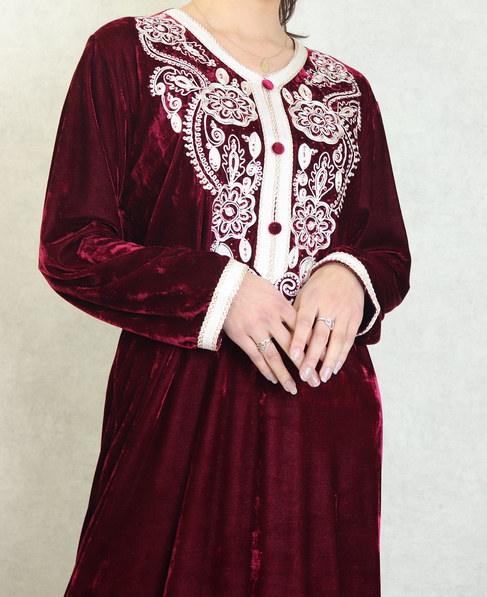 Robe longue effet velours avec broderies pour femme - Couleur Bordeaux Vetement & Accessoire